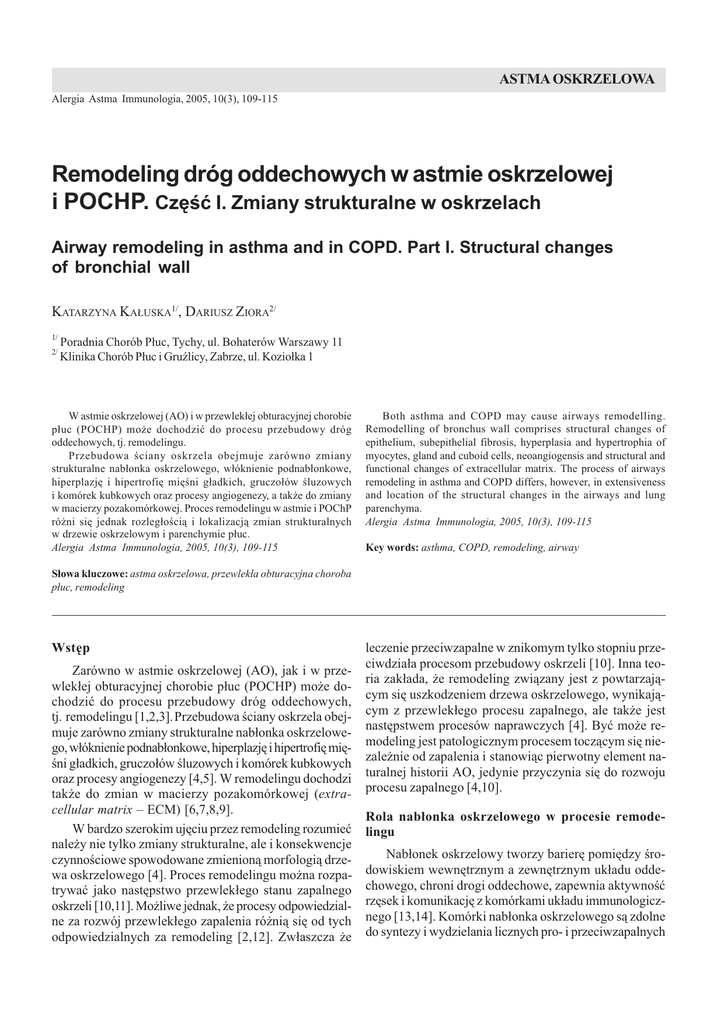 Alergia Astma Immunologia, 2005, xxx Ka³uska K., Ziora D. 10(3), Remodeling dróg oddechowych w astmie oskrzelowej i POCHP. Czêæ I. Zmiany 109 ASTMA OSKRZELOWA Alergia Astma Immunologia, 2005, 10(3), 109-115 Remodeling dróg oddechowych w astmie oskrzelowej i POCHP. Czêæ I. Zmiany strukturalne w oskrzelach Airway remodeling in asthma and in COPD. Part I. Structural changes of bronchial wall KATARZYNA KA£USKA1/, DARIUSZ ZIORA2/ 1/ 2/ Poradnia Chorób P³uc, Tychy, ul. Bohaterów Warszawy 11 Klinika Chorób P³uc i Grulicy, Zabrze, ul. Kozio³ka 1 W astmie oskrzelowej (AO) i w przewlek³ej obturacyjnej chorobie p³uc (POCHP) mo¿e dochodziæ do procesu przebudowy dróg oddechowych, tj. remodelingu. Przebudowa ciany oskrzela obejmuje zarówno zmiany strukturalne nab³onka oskrzelowego, w³óknienie podnab³onkowe, hiperplazjê i hipertrofiê miêni g³adkich, gruczo³ów luzowych i komórek kubkowych oraz procesy angiogenezy, a tak¿e do zmiany w macierzy pozakomórkowej. Proces remodelingu w astmie i POChP ró¿ni siê jednak rozleg³oci¹ i lokalizacj¹ zmian strukturalnych w drzewie oskrzelowym i parenchymie p³uc. Alergia Astma Immunologia, 2005, 10(3), 109-115 Both asthma and COPD may cause airways remodelling. Remodelling of bronchus wall comprises structural changes of epithelium, subepithelial fibrosis, hyperplasia and hypertrophia of myocytes, gland and cuboid cells, neoangiogensis and structural and functional changes of extracellular matrix. The process of airways remodeling in asthma and COPD differs, however, in extensiveness and location of the structural changes in the airways and lung parenchyma. Alergia Astma Immunologia, 2005, 10(3), 109-115 Key words: asthma, COPD, remodeling, airway S³owa kluczowe: astma oskrzelowa, przewlek³a obturacyjna choroba p³uc, remodeling Wstêp Zarówno w astmie oskrzelowej (AO), jak i w przewlek³ej obturacyjnej chorobie p³uc (POCHP) mo¿e dochodziæ do procesu przebudowy dróg oddechowych, tj. remodelingu [1,2,3]. Przebudowa ciany oskrzela obejmuje zarówno zmiany strukturalne nab³onka oskrzelowego, w³óknienie podnab³onkowe, hiperplazjê i hipertrofiê miêni g³adkich, gruczo³ów luzowych i komórek kubkowych oraz procesy angiogenezy [4,5]. W remodelingu dochodzi tak¿e do zmian w macierzy pozakomórkowej (extracellular matrix ECM) [6,7,8,9]. W bardzo szerokim ujêciu przez remodeling rozumieæ nale¿y nie tylko zmiany strukturalne, ale i konsekwencje czynnociowe spowodowane zmienion¹ morfologi¹ drzewa oskrzelowego [4]. Proces remodelingu mo¿na rozpatrywaæ jako nastêpstwo przewlek³ego stanu zapalnego oskrzeli [10,11]. Mo¿liwe jednak, ¿e procesy odpowiedzialne za rozwój przewlek³ego zapalenia ró¿ni¹ siê od tych odpowiedzialnych za remodeling [2,12]. Zw³aszcza ¿e leczenie przeciwzapalne w znikomym tylko stopniu przeciwdzia³a procesom przebudowy oskrzeli [10]. Inna teoria zak³ada, ¿e remodeling zwi¹zany jest z powtarzaj¹cym siê uszkodzeniem drzewa oskrzelowego, wynikaj¹cym z przewlek³ego procesu zapalnego, ale tak¿e jest nastêpstwem procesów naprawczych [4]. Byæ mo¿e remodeling jest patologicznym procesem tocz¹cym siê niezale¿nie od zapalenia i stanowi¹c pierwotny element naturalnej historii AO, jedynie przyczynia siê do rozwoju procesu zapalnego [4,10]. Rola nab³onka oskrzelowego w procesie remodelingu Nab³onek oskrzelowy tworzy barierê pomiêdzy rodowiskiem wewnêtrznym a zewnêtrznym uk³adu oddechowego, chroni drogi oddechowe, zapewnia aktywnoæ rzêsek i komunikacjê z komórkami uk³adu immunologicznego [13,14]. Komórki nab³onka oskrzelowego s¹ zdolne do syntezy i wydzielania licznych pro- i przeciwzapalnych 110 Alergia Astma Immunologia, 2005, 10(3), 109-115 cz¹steczek (eikozanoidów, peptydaz, bia³ek macierzy pozakomórkowej, cytokin) czy tlenku azotu oraz s¹ g³ównym ród³em GM-CSF (granulocyte macrophage colony stimulating factor), który wp³ywa na wyd³u¿enie prze¿ycia eozynofilów w wietle oskrzela [13,15,16,17]. Nab³onek oskrzelowy jest tak¿e miejscem syntezy profibrogennej cytokiny TGF-β (Transforming Growth Factor), wp³ywaj¹cej na syntezê kolagenu [16]. Uszkodzenie nab³onka w AO manifestuje siê jego kruchoci¹ i z³uszczaniem. Nastêpuje zniszczenie po³¹czeñ miêdzykomórkowych i po³¹czeñ pomiêdzy komórkami a b³on¹ podstawn¹ w wyniku destrukcji bia³ek matrix buduj¹cych te po³¹czenia [14,18]. Proces destrukcji tych bia³ek inicjuj¹ i moduluj¹ aktywne rodniki tlenu i bia³ka bogate w argininê wydzielane przez eozynofile oraz tryptaza wydzielana przez komórki tuczne [19]. Kruchoæ i z³uszczanie komórek nab³onka potêguj¹ TNF-alfa (tumor necrosis factor czynnik martwicy guza), enzymy proteolityczne pochodz¹ce z komórek tucznych oraz metaloproteazy wydzielane przez sam nab³onek i przez makrofagi [18]. Nastêpstwem uszkodzenia nab³onka i zwiêkszenia jego przepuszczalnoci jest umo¿liwienie rozwoju procesu zapalnego, wzrost nadreaktywnoci oskrzeli, wyczerpanie nab³onkowych czynników rozkurczowych (np. tlenku azotu) i utrata enzymów odpowiedzialnych za rozk³ad prozapalnej substancji P [20]. Wydaje siê, ¿e uszkodzenie nab³onka i nastêpuj¹ce procesy naprawcze mog¹ zapocz¹tkowaæ remodeling ciany oskrzela, ale wszystkie czynniki inicjuj¹ce i potêguj¹ce remodeling nie s¹ jeszcze dostatecznie poznane [20]. Czynnikiem odgrywaj¹cym zasadnicz¹ rolê w naprawie uszkodzonego nab³onka jest EGF (epidermal growth factor naskórkowy czynnik wzrostu) [41,20]. Dziêki wzrostowi ekspresji EGF dochodzi do procesów naprawczych obejmuj¹cych ponowne ró¿nicowanie, sp³aszczenie i migracjê komórek z krawêdzi blizny oraz proliferacjê nowych komórek nab³onka [21]. U zdrowych osób uszkodzeniu powierzchni nab³onka towarzyszy zwiêkszona aktywnoæ mitotyczna pozosta³ych komórek, czego konsekwencj¹ jest szybka odbudowa komórek nab³onka w ods³oniêtych miejscach. Nastêpuje tak¿e wzrost proliferacji fibroblastów zlokalizowanych podna