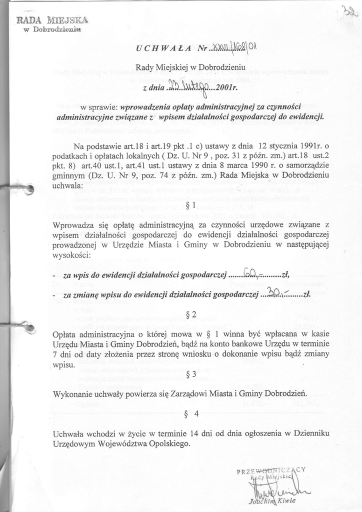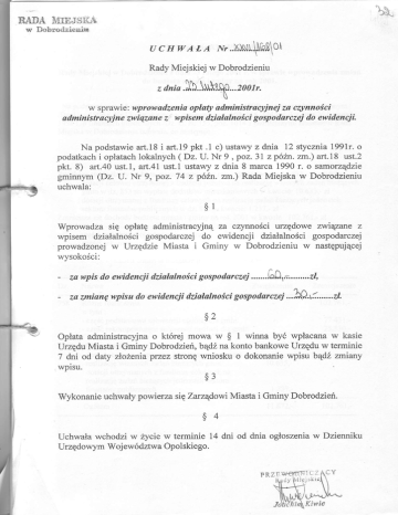 RADA NAIEJSI(iT w Dobrodzieui* u c H tr AZ,4 Nr..)sAlt$la8\01 Rady Miejskiej w Dobrodzieniu z az.;o.h..\$h.ło...2001r, v w sprawie:wprowadzeniaopłatyadministracyjnejza cqlnności gospodarczejdo ewidencji administracyjne związanez. wpisem działalności Na podstawieart.l8 i art.19pkt .l c) ustawyz dnia 12 stycznia l99lr. o podatkachi olatach lokalnych( Dz. U' Nr 9 , poz. 3| z późn.zrrr.)art'18 ust'2 pkt. 8) art.40ust.l, art.4l ust'l ustawyz dnia 8 marca 1990 r. o samorządzie gminnym (Dz. U. Nr 9, poz. 74 z późn.zrn.) Rada Miejska w Dobrodzieniu uchwala: $l Wprowadza się opłatę administracyjną za crynnościurzędowe zwięme z wpisem działalnościgospodarczej do ewidencji działalnościgospodarczej prowadzonej w Urzędzie Miasta i Gminy w Dobrodzieniu w następującej wvsokości: - za wpis do ewidencji działalnoś ci gospodarcze;.......G0,*........zJ, - za anianę wpisu do ewidencji działalności gospodarczej-.}f-ł:.......zł. $2 opłata administracyjna o której mowa w $ 1 winna być wpłacarraw kasie Urzędu Miasta i Gminy Dobrodzień, bądż,nakonto bankoweUrzędu w terminie 7 dni od daty ńożenia przez stronę wniosku o dokonanie wpisu bądz ariany wpisu. $3 Wykonanie uchwĄ powierza sięZarządowi Miasta i Gminy Dobrodzień. $4 Uchwaławchodzi w Ęcie w terminie 14 dni od dnia ogłoszeniaw Dzienniku Urzędowym Województwa opolskiego.