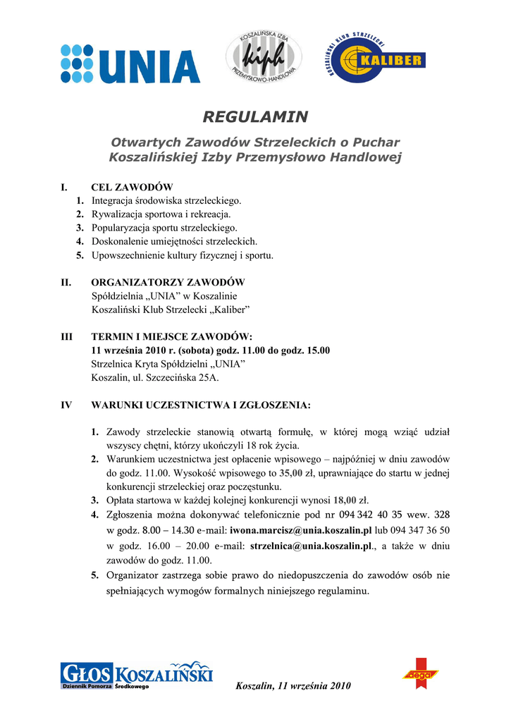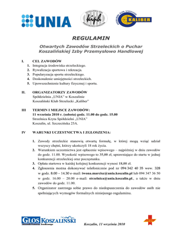 REGULAMIN Otwartych Zawodów Strzeleckich o Puchar Koszalińskiej Izby Przemysłowo Handlowej I. 1. 2. 3. 4. 5. CEL ZAWODÓW Integracja środowiska strzeleckiego. Rywalizacja sportowa i rekreacja. Popularyzacja sportu strzeleckiego. Doskonalenie umiejętności strzeleckich. Upowszechnienie kultury fizycznej i sportu. II. ORGANIZATORZY ZAWODÓW Spółdzielnia „UNIA” w Koszalinie Koszaliński Klub Strzelecki „Kaliber” III TERMIN I MIEJSCE ZAWODÓW: 11 września 2010 r. (sobota) godz. 11.00 do godz. 15.00 Strzelnica Kryta Spółdzielni „UNIA” Koszalin, ul. Szczecińska 25A. IV WARUNKI UCZESTNICTWA I ZGŁOSZENIA: 1. Zawody strzeleckie stanowią otwartą formułę, w której mogą wziąć udział wszyscy chętni, którzy ukończyli 18 rok życia. 2. Warunkiem uczestnictwa jest opłacenie wpisowego – najpóźniej w dniu zawodów do godz. 11.00. Wysokość wpisowego to 35,00 zł, uprawniające do startu w jednej konkurencji strzeleckiej oraz poczęstunku. 3. Opłata startowa w każdej kolejnej konkurencji wynosi 18,00 zł. 4. Zgłoszenia można dokonywać telefonicznie pod nr 094 342 40 35 wew. 328 w godz. 8.00 – 14.30 e-mail: [email protected] lub 094 347 36 50 w godz. 16.00 – 20.00 e-mail: [email protected]., a także w dniu zawodów do godz. 11.00. 5. Organizator zastrzega sobie prawo do niedopuszczenia do zawodów osób nie spełniających wymogów formalnych niniejszego regulaminu. Koszalin, 11 września 2010 V 1. 2. 3. 4. KONKURENCJE STRZELECKIE: Strzelanie dokładne – pistolet (rewolwer) bocznego zapłonu broń – pistolet bocznego zapłonu w kalibrze 22 LR (5,6 mm), ilość strzałów: 3 próbne + 10 ocenianych odległość – 25 m cel – tarcza TS2 (pierścieniowa) postawa - stojąc z wolnej ręki lub oburącz czas: 3 strzały próbne – 2 min 10 strzałów ocenianych – 10 min (2 x po 5 strzałów z wymianą magazynka) maksymalna ilość punktów do uzyskania – 100 pkt. Strzelanie dokładne – pistolet (rewolwer) centralnego zapłonu broń – pistolet centralnego zapłonu w kalibrze 7,62 – 11,43 mm, ilość strzałów: 3 próbne + 10 ocenianych odległość – 25 m cel – tarcza TS2 (pierścieniowa) postawa - stojąc z wolnej ręki lub oburącz czas: 3 strzały próbne – 2 min 10 strzałów ocenianych – 10 min (2 x po 5 strzałów z wymianą magazynka) maksymalna ilość punktów do uzyskania – 100 pkt. Strzelanie szybkie – pistolet (rewolwer) centralnego zapłonu broń – pistolet centralnego zapłonu w kalibrze 7,62 – 11,43 mm, ilość strzałów: 10 ocenianych 2 x po 5 strzałów z wymianą magazynka odległość – 25 m cel – tarcza TS9 (biały „Francuz”) postawa - stojąc z wolnej ręki lub oburącz czas – tarcza ukazuje się na 3 sekundy, następnie znika na 7 sekund (czynność ta powtarza się 10 razy) maksymalna ilość punktów do uzyskania – 100 pkt. Konkurencja dodatkowa „Złoty strzał” broń – pistolet centralnego zapłonu w kalibrze 7,62 – 11,43 mm, odległość – 25 m cel – tarcza TS2 (pierścieniowa) postawa - stojąc z wolnej ręki lub oburącz czas – jedna minuta na jeden strzał każdy zawodnik ładuje magazynek 1 nabojem i oddaje jeden strzał po każdej serii odpada zawodnik który uzyskał najsłabszy wynik i tak aż do wyłonienia zwycięzcy. W przypadku uzyskania przez dwóch i więcej zawodników takiego samego najgorszego wyniku, będzie prowadzona dogrywka pomiędzy tymi zawodnikami. Koszalin, 11 września 2010 ZASADY I OCENA ZAWODÓW: Zawody strzeleckie rozgrywane będą zgodnie z regulaminem zawodów oraz przepisami Polskiego Związku Strzelectwa Sportowego. Decyzje sędziego głównego są ostateczne. VII. BROŃ I AMUNICJA 1. Broń i amunicja własna lub zabezpieczona przez organizatora zawodów (pistolety, rewolwery). 2. Broń przed rozpoczęciem konkurencji strzeleckich musi być oficjalnie sprawdzona przez sędziego głównego. VII. KLASYFIKACJA Indywidualna dla każdego uczestnika i w danej konkurencji oraz za wielobój. O kolejności zawodników decyduje suma punktów zdobytych w danej konkurencji. VI. VIII. TROFEA SPORTOWE:. Za zwycięstwo w konkurencji 1, 2, 3: Za II, III miejsce w konkurencji 1, 2, 3: Dla zwycięzcy „Złotego strzału”: Puchar i dyplom Dyplom Puchar i dyplom Nagrodę miesiąca ufundowaną przez zdobędzie strzelec, który uzyska największą liczbę punktów w dwóch konkurencjach: strzelanie dokładne z broń bocznego oraz z broni centralnego zapłonu (konkurencje I, II). PUCHAR (za wielobój) - zdobędzie strzelec, który uzyska największą liczbę punktów w trzech konkurencjach: ze strzelania dokładnego (broń centralnego i bocznego zapłonu) oraz szybkiego z broni centralnego zapłonu (konkurencje I, II, III). Nagroda specjalna. Do soboty (11 września br.) na łamach „Głosu Koszalińskiego” wydrukowane zostaną trzy kupony. Nagrodę Głosu Koszalińskiego zdobędzie strzelec, który uzyska największą liczbę punktów w dwóch konkurencjach: ze strzelania dokładnego oraz szybkiego z broni centralnego zapłonu kupony (konkurencja I, III). i przyniesie ze sobą wszystkie Nagrodę roku – Skuter oraz tytuł STRZELCA ROKU zdobędzie strzelec, który będzie znajdował się na czele klasyfikacji generalnej po rozegraniu ostatnich w 2010 roku (dziesiątych), grudniowych zawodów otwartych. IX. OSOBY FUNKCYJNE: Sędzia główny i kierownik strzelania z broni centralnego zapłonu: Ryszard Pędziński Sędzia i kierownik strzelania z broni małokalibrowej: Bożena Pankowska Sekretariat zawodów: Marcin Machocki Koszalin, 11 września 2010