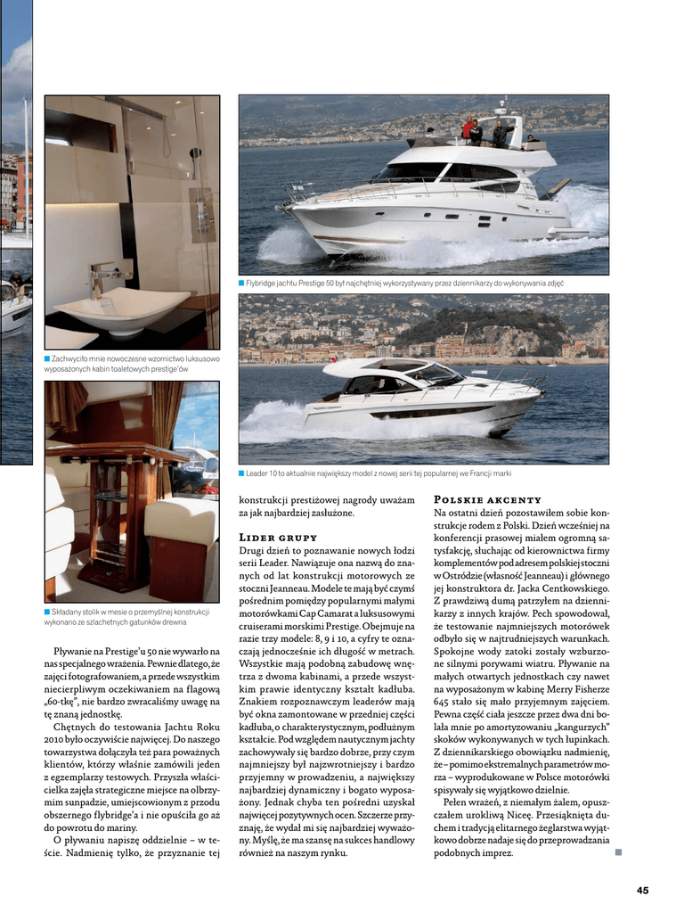 n Flybridge jachtu Prestige 50 był najchętniej wykorzystywany przez dziennikarzy do wykonywania zdjęć n Zachwyciło mnie nowoczesne wzornictwo luksusowo wyposażonych kabin toaletowych prestige’ów n Leader 10 to aktualnie największy model z nowej serii tej popularnej we Francji marki konstrukcji prestiżowej nagrody uważam za jak najbardziej zasłużone. Lider grupy n Składany stolik w mesie o przemyślnej konstrukcji wykonano ze szlachetnych gatunków drewna Pływanie na Prestige’u 50 nie wywarło na nas specjalnego wrażenia. Pewnie dlatego, że zajęci fotografowaniem, a przede wszystkim niecierpliwym oczekiwaniem na flagową „60-tkę”, nie bardzo zwracaliśmy uwagę na tę znaną jednostkę. Chętnych do testowania Jachtu Roku 2010 było oczywiście najwięcej. Do naszego towarzystwa dołączyła też para poważnych klientów, którzy właśnie zamówili jeden z egzemplarzy testowych. Przyszła właścicielka zajęła strategiczne miejsce na olbrzymim sunpadzie, umiejscowionym z przodu obszernego flybridge’a i nie opuściła go aż do powrotu do mariny. O pływaniu napiszę oddzielnie – w teście. Nadmienię tylko, że przyznanie tej Drugi dzień to poznawanie nowych łodzi serii Leader. Nawiązuje ona nazwą do znanych od lat konstrukcji motorowych ze stoczni Jeanneau. Modele te mają być czymś pośrednim pomiędzy popularnymi małymi motorówkami Cap Camarat a luksusowymi cruiserami morskimi Prestige. Obejmuje na razie trzy modele: 8, 9 i 10, a cyfry te oznaczają jednocześnie ich długość w metrach. Wszystkie mają podobną zabudowę wnętrza z dwoma kabinami, a przede wszystkim prawie identyczny kształt kadłuba. Znakiem rozpoznawczym leaderów mają być okna zamontowane w przedniej części kadłuba, o charakterystycznym, podłużnym kształcie. Pod względem nautycznym jachty zachowywały się bardzo dobrze, przy czym najmniejszy był najzwrotniejszy i bardzo przyjemny w prowadzeniu, a największy najbardziej dynamiczny i bogato wyposażony. Jednak chyba ten pośredni uzyskał najwięcej pozytywnych ocen. Szczerze przyznaję, że wydał mi się najbardziej wyważony. Myślę, że ma szansę na sukces handlowy również na naszym rynku. Polskie akcenty Na ostatni dzień pozostawiłem sobie konstrukcje rodem z Polski. Dzień wcześniej na konferencji prasowej miałem ogromną satysfakcję, słuchając od kierownictwa firmy komplementów pod adresem polskiej stoczni w Ostródzie (własność Jeanneau) i głównego jej konstruktora dr. Jacka Centkowskiego. Z prawdziwą dumą patrzyłem na dziennikarzy z innych krajów. Pech spowodował, że testowanie najmniejszych motorówek odbyło się w najtrudniejszych warunkach. Spokojne wody zatoki zostały wzburzone silnymi porywami wiatru. Pływanie na małych otwartych jednostkach czy nawet na wyposażonym w kabinę Merry Fisherze 645 stało się mało przyjemnym zajęciem. Pewna część ciała jeszcze przez dwa dni bolała mnie po amortyzowaniu „kangurzych” skoków wykonywanych w tych łupinkach. Z dziennikarskiego obowiązku nadmienię, że – pomimo ekstremalnych parametrów morza – wyprodukowane w Polsce motorówki spisywały się wyjątkowo dzielnie. Pełen wrażeń, z niemałym żalem, opuszczałem urokliwą Niceę. Przesiąknięta duchem i tradycją elitarnego żeglarstwa wyjątkowo dobrze nadaje się do przeprowadzania podobnych imprez. 45