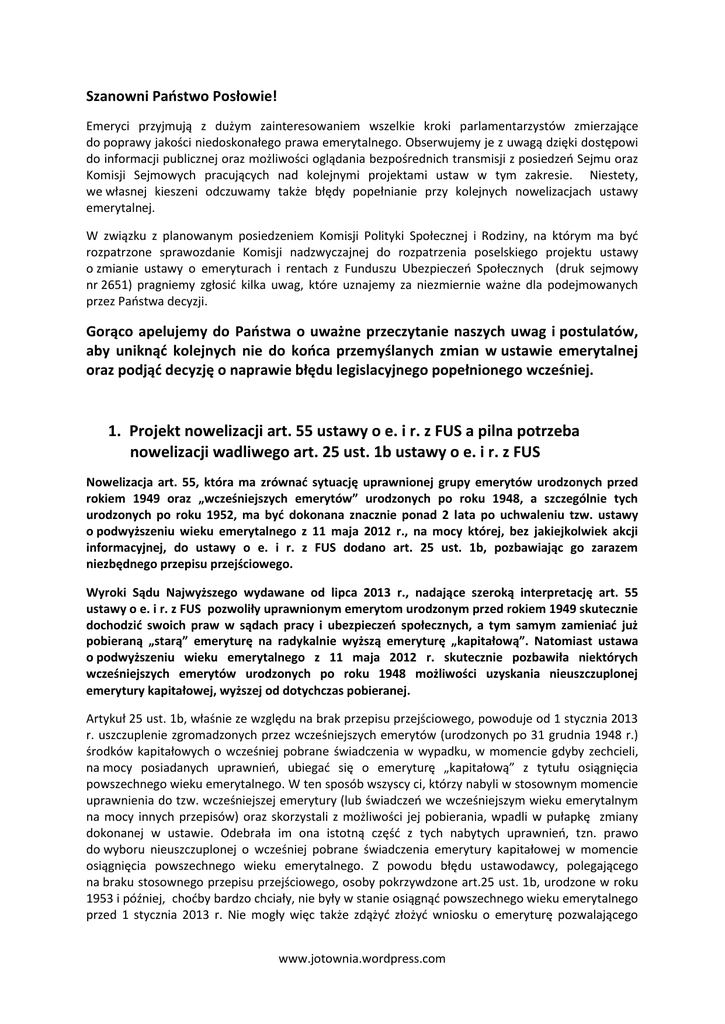 Szanowni Państwo Posłowie! Emeryci przyjmują z dużym zainteresowaniem wszelkie kroki parlamentarzystów zmierzające do poprawy jakości niedoskonałego prawa emerytalnego. Obserwujemy je z uwagą dzięki dostępowi do informacji publicznej oraz możliwości oglądania bezpośrednich transmisji z posiedzeń Sejmu oraz Komisji Sejmowych pracujących nad kolejnymi projektami ustaw w tym zakresie. Niestety, we własnej kieszeni odczuwamy także błędy popełnianie przy kolejnych nowelizacjach ustawy emerytalnej. W związku z planowanym posiedzeniem Komisji Polityki Społecznej i Rodziny, na którym ma być rozpatrzone sprawozdanie Komisji nadzwyczajnej do rozpatrzenia poselskiego projektu ustawy o zmianie ustawy o emeryturach i rentach z Funduszu Ubezpieczeń Społecznych (druk sejmowy nr 2651) pragniemy zgłosić kilka uwag, które uznajemy za niezmiernie ważne dla podejmowanych przez Państwa decyzji. Gorąco apelujemy do Państwa o uważne przeczytanie naszych uwag i postulatów, aby uniknąć kolejnych nie do końca przemyślanych zmian w ustawie emerytalnej oraz podjąć decyzję o naprawie błędu legislacyjnego popełnionego wcześniej. 1. Projekt nowelizacji art. 55 ustawy o e. i r. z FUS a pilna potrzeba nowelizacji wadliwego art. 25 ust. 1b ustawy o e. i r. z FUS Nowelizacja art. 55, która ma zrównać sytuację uprawnionej grupy emerytów urodzonych przed rokiem 1949 oraz „wcześniejszych emerytów” urodzonych po roku 1948, a szczególnie tych urodzonych po roku 1952, ma być dokonana znacznie ponad 2 lata po uchwaleniu tzw. ustawy o podwyższeniu wieku emerytalnego z 11 maja 2012 r., na mocy której, bez jakiejkolwiek akcji informacyjnej, do ustawy o e. i r. z FUS dodano art. 25 ust. 1b, pozbawiając go zarazem niezbędnego przepisu przejściowego. Wyroki Sądu Najwyższego wydawane od lipca 2013 r., nadające szeroką interpretację art. 55 ustawy o e. i r. z FUS pozwoliły uprawnionym emerytom urodzonym przed rokiem 1949 skutecznie dochodzić swoich praw w sądach pracy i ubezpieczeń społecznych, a tym samym zamieniać już pobieraną „starą” emeryturę na radykalnie wyższą emeryturę „kapitałową”. Natomiast ustawa o podwyższeniu wieku emerytalnego z 11 maja 2012 r. skutecznie pozbawiła niektórych wcześniejszych emerytów urodzonych po roku 1948 możliwości uzyskania nieuszczuplonej emerytury kapitałowej, wyższej od dotychczas pobieranej. Artykuł 25 ust. 1b, właśnie ze względu na brak przepisu przejściowego, powoduje od 1 stycznia 2013 r. uszczuplenie zgromadzonych przez wcześniejszych emerytów (urodzonych po 31 grudnia 1948 r.) środków kapitałowych o wcześniej pobrane świadczenia w wypadku, w momencie gdyby zechcieli, na mocy posiadanych uprawnień, ubiegać się o emeryturę „kapitałową” z tytułu osiągnięcia powszechnego wieku emerytalnego. W ten sposób wszyscy ci, którzy nabyli w stosownym momencie uprawnienia do tzw. wcześniejszej emerytury (lub świadczeń we wcześniejszym wieku emerytalnym na mocy innych przepisów) oraz skorzystali z możliwości jej pobierania, wpadli w pułapkę zmiany dokonanej w ustawie. Odebrała im ona istotną część z tych nabytych uprawnień, tzn. prawo do wyboru nieuszczuplonej o wcześniej pobrane świadczenia emerytury kapitałowej w momencie osiągnięcia powszechnego wieku emerytalnego. Z powodu błędu ustawodawcy, polegającego na braku stosownego przepisu przejściowego, osoby pokrzywdzone art.25 ust. 1b, urodzone w roku 1953 i później, choćby bardzo chciały, nie były w stanie osiągnąć powszechnego wieku emerytalnego przed 1 stycznia 2013 r. Nie mogły więc także zdążyć złożyć wniosku o emeryturę pozwalającego www.jotownia.wordpress.com „uciec” przed art. 25 ust. 1b. Wcześniejsi emeryci urodzeni przed 31 grudnia 1952, będący w takiej samej sytuacji jak ci urodzeni po tej dacie, zdążyli złożyć wniosek, o ile jednak zdołali się dowiedzieć o wprowadzeniu tego przepisu ukrytego w ustawie o podwyższeniu wieku emerytalnego, co nie było łatwe. Nieliczne media poinformowały o tej szczególnej nowelizacji tuż przed końcem roku 2012. ZUS poinformował o tym dopiero po wejściu w życie ustawy. 2. Opinie wskazujące na wadliwość art. 25 ust. 1b bez przepisu przejściowego a/ Petycja P8-05/14 do Senatu „w sprawie zmiany zasad ustalania wysokości emerytury powszechnej osób urodzonych po 1948 r. pobierających dotychczas wcześniejszą emeryturę” Pomimo poważnych argumentów, Petycji nie nadano dalszego biegu, bez przedstawienia merytorycznej argumentacji, w wyniku wyraźnie politycznego, remisowego głosowania, w którym za kontynuowaniem prac było 3 senatorów opozycji, a przeciw 3 senatorów koalicji rządzącej. (Zob. Załączniki 1a/ i c/) b/ Opinia Biura Legislacyjnego Senatu do Petycji P8-05/14 z 24 kwietnia 2014 r. Opinia sygnatariuszek petycji P8-05/14 o wadliwości art. 25 ust. 1b została w pełni podzielona przez Biuro Legislacyjne Senatu w opinii prawnej na temat petycji P8-05/14, zawierającej konkretne propozycje zmian naprawiających popełniony błąd legislacyjny. (Zob. Załącznik 1b/) c/ Pytanie Prawne P 11/14, skierowane do Trybunału Konstytucyjnego przez Sąd Okręgowy w Szczecinie w marcu 2014 r. (Zob. Załącznik 2) d/ 7 interpelacji poselskich i pismo do premiera Tuska (w tym interpelacje posłów z Komisji PSR) (Zob. Załącznik 3) e/ Informacja Rzecznika Praw Obywatelskich ze „Sprawozdania” za rok 2013, że odpowiedź MPiPS na wystąpienie RPO w sprawie art. 25 ust. 1b nie przekonała Rzecznika i że problem pozostaje nadal w zakresie zainteresowania Rzecznika Praw Obywatelskich. (Zob. Załącznik 4) 3. Porównanie skutków finansowych art. 55 oraz art. 25 ust. 1b ustawy o e. i r. z FUS A. Skutki finansowe braku nowelizacji art. 55 ustawy o e. i r. z FUS po kolejnych wyrokach Sądu Najwyższego (od lipca 2013 r.) I. Zdefiniowane w projektach ustaw, znaczne koszty dla budżetu. Zostały one przedstawione orienta