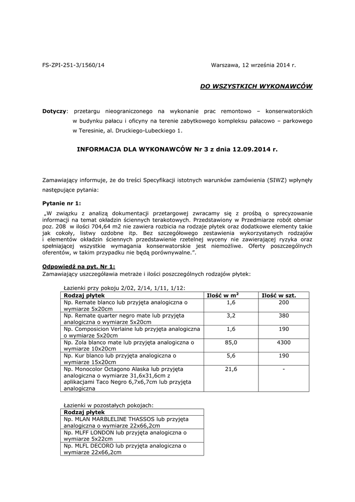 FS-ZPI-251-3/1560/14 Warszawa, 12 września 2014 r. DO WSZYSTKICH WYKONAWCÓW Dotyczy: przetargu nieograniczonego na wykonanie prac remontowo – konserwatorskich w budynku pałacu i oficyny na terenie zabytkowego kompleksu pałacowo – parkowego w Teresinie, al. Druckiego-Lubeckiego 1. INFORMACJA DLA WYKONAWCÓW Nr 3 z dnia 12.09.2014 r. Zamawiający informuje, że do treści Specyfikacji istotnych warunków zamówienia (SIWZ) wpłynęły następujące pytania: Pytanie nr 1: „W związku z analizą dokumentacji przetargowej zwracamy się z prośbą o sprecyzowanie informacji na temat okładzin ściennych terakotowych. Przedstawiony w Przedmiarze robót obmiar poz. 208 w ilości 704,64 m2 nie zawiera rozbicia na rodzaje płytek oraz dodatkowe elementy takie jak cokoły, listwy ozdobne itp. Bez szczegółowego zestawienia wykorzystanych rodzajów i elementów okładzin ściennych przedstawienie rzetelnej wyceny nie zawierającej ryzyka oraz spełniającej wszystkie wymagania konserwatorskie jest niemożliwe. Oferty poszczególnych oferentów, w takim przypadku nie będą porównywalne.”. Odpowiedź na pyt. Nr 1: Zamawiający uszczegóławia metraże i ilości poszczególnych rodzajów płytek: Łazienki przy pokoju 2/02, 2/14, 1/11, 1/12: Rodzaj płytek Np. Remate blanco lub przyjęta analogiczna o wymiarze 5x20cm Np. Remate quarter negro mate lub przyjęta analogiczna o wymiarze 5x20cm Np. Composicion Verlaine lub przyjęta analogiczna o wymiarze 5x20cm Np. Zola blanco mate lub przyjęta analogiczna o wymiarze 10x20cm Np. Kur blanco lub przyjęta analogiczna o wymiarze 15x20cm Np. Monocolor Octagono Alaska lub przyjęta analogiczna o wymiarze 31,6x31,6cm z aplikacjami Taco Negro 6,7x6,7cm lub przyjęta analogiczna Łazienki w pozostałych pokojach: Rodzaj płytek Np. MLAN MARBLELINE THASSOS lub przyjęta analogiczna o wymiarze 22x66,2cm Np. MLFF LONDON lub przyjęta analogiczna o wymiarze 5x22cm Np. MLFL DECORO lub przyjęta analogiczna o wymiarze 22x66,2cm Ilość w m2 1,6 Ilość w szt. 200 3,2 380 1,6 190 85,0 4300 5,6 190 21,6 - Np. MLAX MARBLELINE THASSOS lub przyjęta analogiczna o wymiarze 22x66,2cm Np. MLF6 ALZATA lub przyjęta analogiczna o wymiarze 22x21cm Np. MLCG MARBLELINE CALACATTA lub przyjęta analogiczna o wymiarze 45x45cm Zamawiający przekazuje rysunek – projekt łazienki hotelowej, oznaczony jako Zał. Nr 1 do Informacji Nr 3. Pytanie nr 2: „Prosimy o uzupełnienie dokumentacji o szczegółowe zestawienie okładzin terakotowych ściennych i podłogowych zawierające: - Wyliczenie metraży poszczególnych rodzajów i kolorów płytek - Wyliczenie ilości elementów dekoracyjnych (dekory, cokoły, listwy ozdobne), oraz sprecyzowanie rodzajów tych elementów. Dostarczona dokumentacja nie pozwala na samodzielne obliczenia.” Odpowiedź na pyt. Nr 2: Zamawiający uzupełnia dokumentację o następujące dane: Gzyms podsufitowy wykonany np. z tworzywa sztucznego np. ORAC DECOR PUROTOUCH C333/C333F lub przyjęty analogiczny o wymiarze 200x12x11cm łączna długość elementów – 723m Detal sztukatorski w postaci rozety mocowany w miejscu występowania żyrandoli, wykonany np. z tworzywa sztucznego np. ORAC DECOR PUROTOUCH R77 lub przyjęty analogiczny o średnicy 62cm łączna ilość elementów – 46 szt. Listwa przypodłogowa wykonana np. z tworzywa sztucznego np. ORAC DECOR DUROPOLYMER SX137 lub przyjęty analogiczny o wymiarze 200x10x1,5cm łączna długość elementów – 671m Listwa do obramowania drzwi wykonana np. z tworzywa sztucznego np. ORAC DECOR DX1192300lub przyjęty analogiczny o wymiarze 200x10x1,5cm łączna długość elementów – 250m Listwa do obramowania okien wykonana np. z tworzywa sztucznego np. ORAC DECOR DX1592300 lub przyjęty analogiczny o wymiarze 200x6x1,2cm łączna długość elementów – 240m Pytanie nr 3: „W związku z analizą dokumentacji przetargowej prosimy o zamieszczenie rysunków montażowych platformy przyschodowej. Zamieszczona dokumentacja zawiera jedynie sposób zbrojenia schodów. Prosimy również o uzupełnienie opisu platformy, podany opis jest ogólnikowy i nie pozwala na sporządzenie prawidłowej wyceny tego elementu.” Odpowiedź na pyt. Nr 3: Sposób mocowania platformy przychodowej uzależniony jest od wybranego modelu platformy. Należy przyjąć model platformy, np. przykładowa platforma (liftprojekt typu T100) wraz z jej typowym systemem montażowym lub zastosować analogiczną. Słupki nośne konstrukcji niezależnie od modelu platformy należy zakotwić w żelbetowym fundamencie połączonym z żelbetową płytą pochylni. Głębokość kotwienia uzależniona od modelu platformy. Kotwienie słupków w płycie połączonej z fundamentem- 40cm. W miejscu kotwienia słupków wykonać belkę obwodową w celu usztywnienia mocowania słupków. Zbrojenie belki obwodowej 6 prętami Ø12 i strzemionami Ø6 co ok. 12- 15cm. Sposób montażu platformy zgodnie z „wytycznymi instalacyjnymi producenta”. Pytanie nr 4: „Zwracam się z prośbą o przesłanie zestawienia stolarki okiennej do wymiany na poziomie przyziemia.” Odpowiedź na pyt. Nr 4: str. 2 Do wymiany należy uwzględnić – okna występujące w przyziemiu budynku oznaczone na rys. O1 o wymiarach 90x125 – sztuk 22 Oraz drzwi balkonowe 145x290 - sztuk 8 Okno poddaszowe okrągłe Ø70 – szt 2 Zamawiający informuje, iż powyższe pytania i odpowiedzi, wyjaśnienia do SIWZ stanowią jej integralną część, a przy tym z uwagi na ich zakres i charakter oraz termin wprowadzenia wpływają na konieczność przedłużenia terminu składania ofert. Są tym samym spełnione przesłanki wynikające z art. 38 ust. 6 ustawy PZP. Dlatego też Zamawiający zawiadamia, iż terminy składania i otwarcia ulegają zmianie i zostają ustalone na dzień 26 września 2014 r., przy czym godziny składania i otwarcia ofert oraz miejsce pozostają bez zmian. DYREKTOR Biura Zarządu Funduszu Składkowego Jacek Bachański str. 3