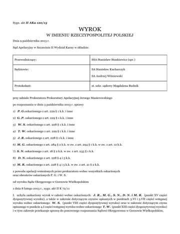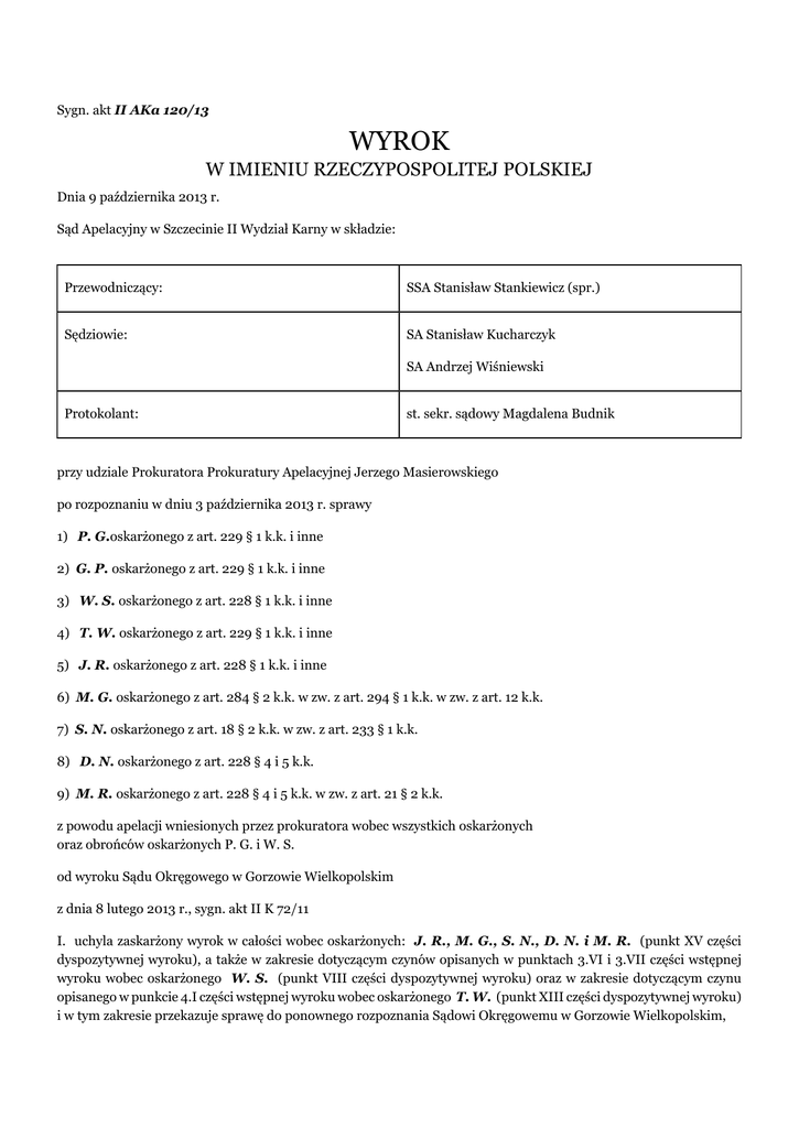 Sygn. akt II AKa 120/13 WYROK W IMIENIU RZECZYPOSPOLITEJ POLSKIEJ Dnia 9 października 2013 r. Sąd Apelacyjny w Szczecinie II Wydział Karny w składzie: Przewodniczący: SSA Stanisław Stankiewicz (spr.) Sędziowie: SA Stanisław Kucharczyk SA Andrzej Wiśniewski Protokolant: st. sekr. sądowy Magdalena Budnik przy udziale Prokuratora Prokuratury Apelacyjnej Jerzego Masierowskiego po rozpoznaniu w dniu 3 października 2013 r. sprawy 1) P. G.oskarżonego z art. 229 § 1 k.k. i inne 2) G. P. oskarżonego z art. 229 § 1 k.k. i inne 3) W. S. oskarżonego z art. 228 § 1 k.k. i inne 4) T. W. oskarżonego z art. 229 § 1 k.k. i inne 5) J. R. oskarżonego z art. 228 § 1 k.k. i inne 6) M. G. oskarżonego z art. 284 § 2 k.k. w zw. z art. 294 § 1 k.k. w zw. z art. 12 k.k. 7) S. N. oskarżonego z art. 18 § 2 k.k. w zw. z art. 233 § 1 k.k. 8) D. N. oskarżonego z art. 228 § 4 i 5 k.k. 9) M. R. oskarżonego z art. 228 § 4 i 5 k.k. w zw. z art. 21 § 2 k.k. z powodu apelacji wniesionych przez prokuratora wobec wszystkich oskarżonych oraz obrońców oskarżonych P. G. i W. S. od wyroku Sądu Okręgowego w Gorzowie Wielkopolskim z dnia 8 lutego 2013 r., sygn. akt II K 72/11 I. uchyla zaskarżony wyrok w całości wobec oskarżonych: J. R., M. G., S. N., D. N. i M. R. (punkt XV części dyspozytywnej wyroku), a także w zakresie dotyczącym czynów opisanych w punktach 3.VI i 3.VII części wstępnej wyroku wobec oskarżonego W. S. (punkt VIII części dyspozytywnej wyroku) oraz w zakresie dotyczącym czynu opisanego w punkcie 4.I części wstępnej wyroku wobec oskarżonego T. W. (punkt XIII części dyspozytywnej wyroku) i w tym zakresie przekazuje sprawę do ponownego rozpoznania Sądowi Okręgowemu w Gorzowie Wielkopolskim, II. uchyla rozstrzygnięcie o karze grzywny, orzeczonej wobec oskarżonych P. G. i G. P. w punkcie XI zaskarżonego wyroku, III. zmienia zaskarżony wyrok w ten sposób, że: 1) za czyny przypisane oskarżonym: P. G. w punkcie I, zaś G. P. w punkcie III, na podstawie art. 229 § 1 k.k. i art. 33 § 1, 2 i 3 k.k. wymierza nadto każdemu z oskarżonych, obok orzeczonej kary pozbawienia wolności, karę grzywny w wymiarze 200 (dwieście) stawek dziennych grzywny, ustalając wysokość jednej stawki dziennej na kwotę 50 (pięćdziesiąt) złotych, 2) za czyny przypisane oskarżonym: P. G. w punkcie II, zaś G. P. w punkcie IV, na podstawie art. 229 § 3 w zw. z art. 11 § 2 k.k. i art. 33 § 1, 2 i 3 k.k. wymierza nadto każdemu z oskarżonych, obok orzeczonej kary pozbawienia wolności, karę grzywny w wymiarze 200 (dwieście) stawek dziennych grzywny, ustalając wysokość jednej stawki dziennej na kwotę 50 (pięćdziesiąt) złotych, 3) na podstawie art. 85 k.k. i art. 86 § 1 i 2 k.k. orzeka w stosunku do oskarżonych P. G. i G. P. kary łączne po 200 (dwieście) stawek dziennych grzywny, ustalając wysokość jednej stawki dziennej na kwotę 50 (pięćdziesiąt) złotych, 4) orzeczoną wobec oskarżonego W. S. w punkcie IX karę łączną grzywny obniża do 150 (sto pięćdziesiąt) stawek dziennych grzywny, ustalając wysokość jednej stawki dziennej na kwotę 50 (pięćdziesiąt) złotych, II. utrzymuje w mocy zaskarżony wyrok w pozostałej części, III. zasądza od oskarżonych: P. G., G. P. W. S. na rzecz Skarbu Państwa koszty sądowe za postępowanie odwoławcze związane z ich udziałem w sprawie, w tym wymierza P. G. i G. P. kwoty po 2.300 zł, zaś W. S. kwotę 1.800 zł, tytułem opłaty za obie instancje, IV. kosztami procesu za postępowanie odwoławcze w części dotyczącej rozstrzygnięcia zawartego w punkcie XIV zaskarżonego wyroku obciąża Skarb Państwa. Sygn. akt II AKa 120/13 U Z A S A D N I E N I E 1) P. G. został oskarżony oto, że: I. w nieustalonym bliżej czasie, na początku 2003 r., w G., działając wspólnie i w porozumieniu z T. I. i G. P., udzielił W. S. pełniącemu funkcję publiczną, jako Dyrektor Oddziału Terenowego Agencji (...) w G., w związku z pełnieniem tej funkcji, korzyść majątkową w postaci pieniędzy w kwocie 20.000 zł, przy ustaleniu, że pieniądze przekazał T. I., a udzielenie dokonane zostało w zamian za zawarcie umowy dzierżawy Stacji paliw w P. przy ul. (...) i obietnicę przyszłego bezprzetargowego kupna Stacji przez Spółkę cywilną (...) ze S., tj. o przestępstwo z art. 229 § 1 k.k., II. w nieustalonym bliżej czasie, wiosną 2004 r., w G., działając w krótkich odstępach czasu i w wykonaniu z góry powziętego zamiaru, w dwóch ratach "w odstępach może dwóch tygodni", wspólnie i w porozumieniu z T. I. i G. P., udzielił W. S. pełniącemu funkcję publiczną, jako Dyrektor Oddziału Terenowego Agencji (...) w G., w związku z pełnieniem tej funkcji, korzyść majątkową w postaci pieniędzy w łącznej kwocie 30.000 zł, przy ustaleniu, że pieniądze przekazał T. I., a udzielenia dokonane zostały w zamian za stanowiącą naruszenie przepisów prawa obietnicę korzystnej wyceny Bazy paliw w P. przy ul. (...) przez zaniżenie wartości jej operatu szacunkowego, a w konsekwencji wywoławczej minimalnej ceny nieruchomości w postępowaniu przetargowym i obietnicę przyszłego kupna Bazy przez Spółkę cywilną (...) ze S., tj. o przestępstwo z art. 229 § 3 k.k. w zw. z art. 229 § 1 k.k. w zw. z art. 12 k.k., III. w nieustalonym bliżej czasie, wiosną 2004r., w G., działając wspólnie i w porozumieniu z T. I. i G. P., udzielił W. S. pełniącemu funkcję publiczną, jako Dyrektor Oddziału Terenowego Agencji (...) w G., w związku z pełnieniem tej funkcji, korzyść majątkową w postaci pieniędzy w kwocie 5.000 zł, przy ustaleniu, że pieniądze przekazał T. I., a udzielenie dokonane zostało w zamian za obietnicę korzystnego zakupu przez Spółkę cywilną (...) ze S. Bazy paliw w P. przy ul. (...), tj. o przestępstwo z art. 229 § 1 k.k., IV. w nieustalonym bliżej czasie, w okresie lat 2003 i 2004, w G., działając w krótkich odstępach czasu i w wykonaniu z g