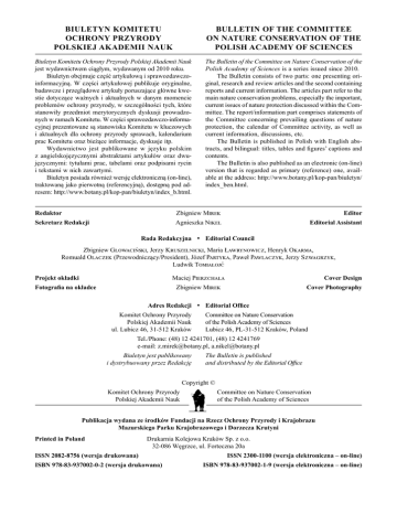 BIULETYN KOMITETU OCHRONY PRZYRODY POLSKIEJ AKADEMII NAUK BULLETIN OF THE COMMITTEE ON NATURE CONSERVATION OF THE POLISH ACADEMY OF SCIENCES Biuletyn Komitetu Ochrony Przyrody Polskiej Akademii Nauk jest wydawnictwem ciągłym, wydawanym od 2010 roku. Biuletyn obejmuje część artykułową i sprawozdawczoinformacyjną. W części artykułowej publikuje oryginalne, badawcze i przeglądowe artykuły poruszające główne kwestie dotyczące ważnych i aktualnych w danym momencie problemów ochrony przyrody, w szczególności tych, które stanowiły przedmiot merytorycznych dyskusji prowadzonych w ramach Komitetu. W części sprawozdawczo-informacyjnej prezentowane są stanowiska Komitetu w kluczowych i aktualnych dla ochrony przyrody sprawach, kalendarium prac Komitetu oraz bieżące informacje, dyskusje itp. Wydawnictwo jest publikowane w języku polskim z angielskojęzycznymi abstraktami artykułów oraz dwujęzycznymi: tytułami prac, tabelami oraz podpisami rycin i tekstami w nich zawartymi. Biuletyn posiada również wersję elektroniczną (on-line), traktowaną jako pierwotną (referencyjną), dostępną pod adresem: http://www.botany.pl/kop-pan/biuletyn/index_b.html. The Bulletin of the Committee on Nature Conservation of the Polish Academy of Sciences is a series issued since 2010. The Bulletin consists of two parts: one presenting original, research and review articles and the second containing reports and current information. The articles part refer to the main nature conservation problems, especially the important, current issues of nature protection discussed within the Committee. The report/information part comprises statements of the Committee concerning prevailing questions of nature protection, the calendar of Committee activity, as well as current information, discussions, etc. The Bulletin is published in Polish with English abstracts, and bilingual: titles, tables and figures’ captions and contents. The Bulletin is also published as an electronic (on-line) version that is regarded as primary (reference) one, available at the address: http://www.botany.pl/kop-pan/biuletyn/ index_ben.html. Redaktor Zbigniew M Editor Sekretarz Redakcji Agnieszka N Editorial Assistant Rada Redakcyjna Editorial Council Zbigniew G , Jerzy K , Maria Ł Romuald O (Przewodniczący/President), Józef P , Paweł P Ludwik T , Henryk O , Jerzy S , , Maciej P Projekt okładki Cover Design Zbigniew M Fotografia na okładce Cover Photography Adres Redakcji Editorial Office Komitet Ochrony Przyrody Polskiej Akademii Nauk ul. Lubicz 46, 31-512 Kraków Committee on Nature Conservation of the Polish Academy of Sciences Lubicz 46, PL-31-512 Kraków, Poland Tel./Phone: (48) 12 4241701, (48) 12 4241769 e-mail: [email protected], [email protected] Biuletyn jest publikowany i dystrybuowany przez Redakcję The Bulletin is published and distributed by the Editorial Office Copyright © Komitet Ochrony Przyrody Polskiej Akademii Nauk Committee on Nature Conservation of the Polish Academy of Sciences Publikacja wydana ze środków Fundacji na Rzecz Ochrony Przyrody i Krajobrazu Mazurskiego Parku Krajobrazowego i Dorzecza Krutyni Printed in Poland Drukarnia Kolejowa Kraków Sp. z o.o. 32-086 Węgrzce, ul. Forteczna 20a ISSN 2082-8756 (wersja drukowana) ISBN 978-83-937002-0-2 (wersja drukowana) ISSN 2300-1100 (wersja elektroniczna – on-line) ISBN 978-83-937002-1-9 (wersja elektroniczna – on-line)