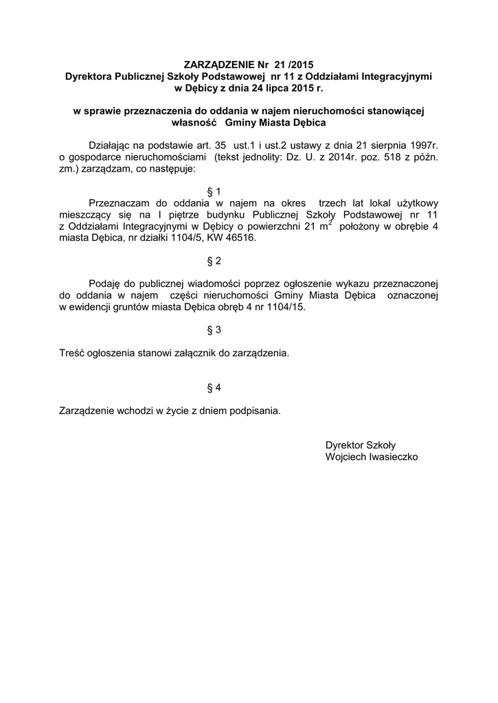 ZARZĄDZENIE Nr 21 /2015 Dyrektora Publicznej Szkoły Podstawowej nr 11 z Oddziałami Integracyjnymi w Dębicy z dnia 24 lipca 2015 r. w sprawie przeznaczenia do oddania w najem nieruchomości stanowiącej własność Gminy Miasta Dębica Działając na podstawie art. 35 ust.1 i ust.2 ustawy z dnia 21 sierpnia 1997r. o gospodarce nieruchomościami (tekst jednolity: Dz. U. z 2014r. poz. 518 z późn. zm.) zarządzam, co następuje: §1 Przeznaczam do oddania w najem na okres trzech lat lokal użytkowy mieszczący się na I piętrze budynku Publicznej Szkoły Podstawowej nr 11 z Oddziałami Integracyjnymi w Dębicy o powierzchni 21 m 2 położony w obrębie 4 miasta Dębica, nr działki 1104/5, KW 46516. §2 Podaję do publicznej wiadomości poprzez ogłoszenie wykazu przeznaczonej do oddania w najem części nieruchomości Gminy Miasta Dębica oznaczonej w ewidencji gruntów miasta Dębica obręb 4 nr 1104/15. §3 Treść ogłoszenia stanowi załącznik do zarządzenia. §4 Zarządzenie wchodzi w życie z dniem podpisania. Dyrektor Szkoły Wojciech Iwasieczko Załącznik SP 11 – 271-6/2015 Dębica, dn. 24 lipiec 2015r. WYKAZ NIERUCHOMOŚCI przeznaczonej do oddania w najem 1. Oznaczenie nieruchomości: KW 46516, nr działki: 1104/15,obręb 4; 2. Powierzchnia nieruchomości: 21 m² 3. Opis nieruchomości: lokal użytkowy mieszczący się na I piętrze budynku Publicznej Szkoły Podstawowej nr 11 z Oddziałami Integracyjnymi w Dębicy; 4. Przeznaczenie nieruchomości i termin zagospodarowania: działalność usługowa – sklepik szkolny; najem na okres (od 01.09.2015r. do 30.06.2018r.); 5. Wysokość opłat z tytułu najmu wynosi 800 złotych (brutto) 6. Termin wnoszenia opłat: do 10 każdego miesiąca; 7. Zasady aktualizacji opłat: kwota czynszu będzie waloryzowana corocznie, o średnioroczny wskaźnik wzrostu cen towarów i usług konsumpcyjnych za rok poprzedni, ogłoszony przez Prezesa Głównego Urzędu Statystycznego. 8. Wykaz podaje się do publicznej wiadomości poprzez wywieszenie na tablicy ogłoszeń w siedzibie Publicznej Szkoły Podstawowej nr 11 z Oddziałami Integracyjnymi w Dębicy, na stronie internetowej szkoły. 9. Wykaz wywiesza się na okres 21 dni. Informacja zostanie podana do publicznej wiadomości poprzez wywieszenie na szkolnej tablicy ogłoszeń i stronie internetowej szkoły. Dyrektor Szkoły Wojciech Iwasieczko Informacja o wywieszeniu wykazu nieruchomości przeznaczonej do oddania w najem Dyrektor Publicznej Szkoły Podstawowej nr 11 z Oddziałami Integracyjnymi w Dębicy informuje, że na stronie internetowej szkoły i tablicy ogłoszeń w Publicznej Szkole Podstawowej nr 11 z Oddziałami Integracyjnymi w Dębicy przy ul. Szkotniej 14, dnia 24.07.2015r. wywieszony został wykaz nieruchomości będącej własnością Gminy Miasta Dębica przeznaczonej do oddania w najem z przeznaczeniem na działalność usługową – sklepik szkolny. Bliższych informacji o nieruchomości umieszczonej w tym wykazie można uzyskać w sekretariacie szkolnym lub telefonicznie pod numerem 14 6812-603.