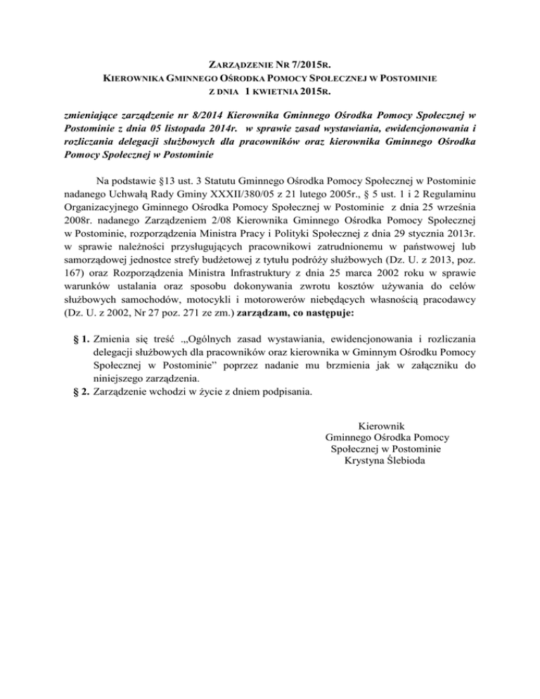 ZARZĄDZENIE NR 7/2015R. KIEROWNIKA GMINNEGO OŚRODKA POMOCY SPOŁECZNEJ W POSTOMINIE Z DNIA 1 KWIETNIA 2015R. zmieniające zarządzenie nr 8/2014 Kierownika Gminnego Ośrodka Pomocy Społecznej w Postominie z dnia 05 listopada 2014r. w sprawie zasad wystawiania, ewidencjonowania i rozliczania delegacji słuŜbowych dla pracowników oraz kierownika Gminnego Ośrodka Pomocy Społecznej w Postominie Na podstawie §13 ust. 3 Statutu Gminnego Ośrodka Pomocy Społecznej w Postominie nadanego Uchwałą Rady Gminy XXXII/380/05 z 21 lutego 2005r., § 5 ust. 1 i 2 Regulaminu Organizacyjnego Gminnego Ośrodka Pomocy Społecznej w Postominie z dnia 25 września 2008r. nadanego Zarządzeniem 2/08 Kierownika Gminnego Ośrodka Pomocy Społecznej w Postominie, rozporządzenia Ministra Pracy i Polityki Społecznej z dnia 29 stycznia 2013r. w sprawie naleŜności przysługujących pracownikowi zatrudnionemu w państwowej lub samorządowej jednostce strefy budŜetowej z tytułu podróŜy słuŜbowych (Dz. U. z 2013, poz. 167) oraz Rozporządzenia Ministra Infrastruktury z dnia 25 marca 2002 roku w sprawie warunków ustalania oraz sposobu dokonywania zwrotu kosztów uŜywania do celów słuŜbowych samochodów, motocykli i motorowerów niebędących własnością pracodawcy (Dz. U. z 2002, Nr 27 poz. 271 ze zm.) zarządzam, co następuje: § 1. Zmienia się treść .„Ogólnych zasad wystawiania, ewidencjonowania i rozliczania delegacji słuŜbowych dla pracowników oraz kierownika w Gminnym Ośrodku Pomocy Społecznej w Postominie” poprzez nadanie mu brzmienia jak w załączniku do niniejszego zarządzenia. § 2. Zarządzenie wchodzi w Ŝycie z dniem podpisania. Kierownik Gminnego Ośrodka Pomocy Społecznej w Postominie Krystyna Ślebioda Załącznik Nr 1 do Zarządzenia Nr 7/2015 Kierownika Gminnego Ośrodka Pomocy Społecznej z dnia 01.04.2015 r. Ogólne zasady wystawiania, ewidencjonowania i rozliczania delegacji słuŜbowych dla pracowników oraz kierownika w Gminnym Ośrodku Pomocy Społecznej w Postominie. 7. § 1. PodróŜą SłuŜbową jest wykonywanie zadania słuŜbowego poza siedzibą pracodawcy w terminie i miejscu określonym w poleceniu wyjazdu słuŜbowego. Podstawą odbycia podróŜy słuŜbowej przez pracownika jest „polecenie wyjazdu słuŜbowego” wystawione na polecenie Kierownika GOPS lub osoby upowaŜnionej . Polecenie wyjazdu słuŜbowego sporządzane jest w jednym egzemplarzu dla kaŜdego delegowanego pracownika przez referenta ds. kancelaryjno-technicznych. Polecenie wyjazdu słuŜbowego podlega ewidencji w rejestrze wyjazdów słuŜbowych prowadzonych przez pracownika. Rejestr prowadzony jest dla poleceń wyjazdów słuŜbowych krajowych i zagranicznych. Wystawione polecenie wyjazdu słuŜbowego winno zawierać : - pieczątkę nagłówkową jednostki, - numer ewidencyjny (nr kolejny/rok wystawienia polecenia wyjazdu słuŜbowego) - imię i nazwisko delegowanego pracownika, - stanowisko słuŜbowe, - miejscowość rozpoczęcia i zakończenia podróŜy, - określenie celu podróŜy, - czas trwania podróŜy (od ….do), - datę wystawienia, - środek transportu właściwego do odbycia podróŜy słuŜbowej, - podpis oraz pieczęć imienną osoby zlecającej, Polecenie wyjazdu słuŜbowego wystawiane jest na powszechnie stosowanych formularzach. 1. § 2. Polecenie wyjazdu słuŜbowego dla pracownika podpisuje Kierownik GOPS. 1. 2. 3. 4. 5. 6. 1. 2. 3. 4. 5. § 3. Środek transportu właściwy do odbycia podróŜy słuŜbowej określa Kierownik GOPS lub osoba upowaŜniona do wydawania poleceń wyjazdu słuŜbowego. W uzasadnionych przypadkach (brak publicznego środka transportu) pracownik moŜe odbyć wyjazd słuŜbowy własnym samochodem. Pracownik, który uzyskał akceptację na przejazd własnym samochodem, winien podać pracownikowi wystawiającemu polecenie wyjazdu słuŜbowego nr rejestracyjny i pojemność silnika pojazdu. Samochód, którym pracownik odbywa podróŜ słuŜbową winien stanowić jego własność lub znajdować się w jego uŜytkowaniu za zgodą właściciela. Określenie pojazdu własnego pracownika lub znajdującego się w jego uŜytkowaniu za zgodą właściciela jest równoznaczne z wyraŜeniem zgody przez pracownika na jego uŜywanie do celów podróŜy słuŜbowej w określonym czasie. Tym samym pracownik zapewnia, Ŝe samochód jest 6. 7. 8. 1. 2. 1. 2. w dobrym stanie technicznym, posiada waŜny przegląd techniczny i ubezpieczenie samochodu, a on sam posiada waŜne prawo jazdy odpowiedniej kategorii. Pracownik, który do wykonywania obowiązków słuŜbowych w granicach administracyjnych gminy musi korzystać z pojazdu niebędącego własności Pracodawcy, moŜe ubiegać się o przyznanie ryczałtu. Wniosek o przyznanie ryczałtu miesięcznego na przejazdy samochodem prywatnym do celów słuŜbowych musi zostać zaakceptowany przez Kierownika GOPS. Pracodawca nie ponosi odpowiedzialności za ewentualne szkody powstałe lub spowodowane w związku z uŜywaniem przez pracownika pojazdu prywatnego do celów słuŜbowych. § 3. Miejscowość rozpoczęcia i zakończenia podróŜy określa Kierownik GOPS lub osoba upowaŜniona do wydawania poleceń wyjazdu słuŜbowego. Za miejscowość rozpoczęcia lub zakończenia podróŜy Kierownik GOPS lub osoba przez niego upowaŜniona moŜe uznać miejscowość pobytu stałego lub czasowego pracownika. § 5. Z tytułu podróŜy słuŜbowej pracownikowi przysługują diety oraz zwrot kosztów: − przejazdów, − dojazdów środkami komunikacji miejskiej, − noclegów, − innych niezbędnych udokumentowanych wydatków. Zwrot kosztów przejazdów przysługuje za przejazd: − środkami komunikacji publicznej na podstawie zakupionych biletów, − samochodem prywatnym za faktycznie przejechane kilometry według stawki za 1km przebiegu samochodem prywatnym zgodnie z Rozporządzeniem Ministra Infrastruktury z dnia 25 marca 2002 roku w sprawie warunków ustalania oraz sposobu dokonywania zwrotu kosztów uŜywania