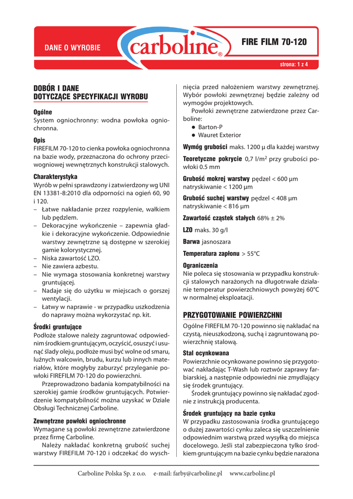 FIRE FILM 70-120 DANE O WYROBIE strona: 1 z 4 DOBÓR I DANE DOTYCZĄCE SPECYFIKACJI WYROBU Ogólne System ogniochronny: wodna powłoka ogniochronna. Opis FIREFILM 70-120 to cienka powłoka ogniochronna na bazie wody, przeznaczona do ochrony przeciwogniowej wewnętrznych konstrukcji stalowych. Charakterystyka Wyrób w pełni sprawdzony i zatwierdzony wg UNI EN 13381-8:2010 dla odporności na ogień 60, 90 i 120. – Łatwe nakładanie przez rozpylenie, wałkiem lub pędzlem. – Dekoracyjne wykończenie – zapewnia gładkie i dekoracyjne wykończenie. Odpowiednie warstwy zewnętrzne są dostępne w szerokiej gamie kolorystycznej. – Niska zawartość LZO. – Nie zawiera azbestu. – Nie wymaga stosowania konkretnej warstwy gruntującej. – Nadaje się do użytku w miejscach o gorszej wentylacji. – Łatwy w naprawie - w przypadku uszkodzenia do naprawy można wykorzystać np. kit. Środki gruntujące Podłoże stalowe należy zagruntować odpowiednim środkiem gruntującym, oczyścić, osuszyć i usunąć ślady oleju, podłoże musi być wolne od smaru, luźnych walcowin, brudu, kurzu lub innych materiałów, które mogłyby zaburzyć przyleganie powłoki FIREFILM 70-120 do powierzchni. Przeprowadzono badania kompatybilności na szerokiej gamie środków gruntujących. Potwierdzenie kompatybilność można uzyskać w Dziale Obsługi Technicznej Carboline. Zewnętrzne powłoki ogniochronne Wymagane są powłoki zewnętrzne zatwierdzone przez firmę Carboline. Należy nakładać konkretną grubość suchej warstwy FIREFILM 70-120 i odczekać do wyschCarboline Polska Sp. z o.o. nięcia przed nałożeniem warstwy zewnętrznej. Wybór powłoki zewnętrznej będzie zależny od wymogów projektowych. Powłoki zewnętrzne zatwierdzone przez Carboline: l Barton-P l Wauret Exterior Wymóg grubości maks. 1200 μ dla każdej warstwy Teoretyczne pokrycie 0,7 l/m2 przy grubości powłoki 0.5 mm Grubość mokrej warstwy pędzel < 600 μm natryskiwanie < 1200 μm Grubość suchej warstwy pędzel < 408 μm natryskiwanie < 816 μm Zawartość cząstek stałych 68% ± 2% LZO maks. 30 g/l Barwa jasnoszara Temperatura zapłonu > 55°C Ograniczenia Nie poleca się stosowania w przypadku konstrukcji stalowych narażonych na długotrwałe działanie temperatur powierzchniowych powyżej 60°C w normalnej eksploatacji. PRZYGOTOWANIE POWIERZCHNI Ogólne FIREFILM 70-120 powinno się nakładać na czystą, nieuszkodzoną, suchą i zagruntowaną powierzchnię stalową. Stal ocynkowana Powierzchnie ocynkowane powinno się przygotować nakładając T-Wash lub roztwór zaprawy farbiarskiej, a następnie odpowiedni nie zmydlający się środek gruntujący. Środek gruntujący powinno się nakładać zgodnie z instrukcją producenta. Środek gruntujący na bazie cynku W przypadku zastosowania środka gruntującego o dużej zawartości cynku zaleca się uszczelnienie odpowiednim warstwą przed wysyłką do miejsca docelowego. Jeśli stal zabezpieczona tylko środkiem gruntującym na bazie cynku będzie narażona e-mail: [email protected] www.carboline.pl FIRE FILM 70-120 DANE O WYROBIE strona: 2 z 4 na działanie czynników atmosferycznych, sole powierzchniowe mogą gromadzić się na stali. Ograniczenia Niektóre rodzaje środków gruntujących mogą powodować problemy z przyleganiem i należy ich unikać. Dotyczy to: l chlorokauczuku l bitumu l termoplastycznych środków gruntujących PROCEDURY NAKŁADANIA Wyrób FIREFILM 70-120 jest dostarczany w postaci gotowej do użytku i nie należy go rozcieńczać, a jedynie dokładnie wymieszać mechanicznie przed użyciem. FIREFILM 70-120 można nakładać stosując maksymalną grubość mokrej warstwy 800μ przy jednorazowo natryskiwanej warstwie składającej się z kilku szybko nakładanych odcinków. Osiągnięcie maksymalnego efektu będzie zależne od warunków na miejscu. Należy nakładać kolejne warstwy, aby uzyskać efekt wymagany w kilku nałożeniach. Można nałożyć dwie warstwy FIREFILM 70-60 jednego dnia, szczególnie jeśli temperatura atmosferyczna wynosi ponad 20°C, a wilgotność względna jest na poziomie 70%. Jednakże przedtem należy upewnić się, że wcześniej nałożona warstwa jest sucha, szczególnie jeśli chodzi o sieć/ kołnierz. Bezpowietrznie Ciśnienie robocze min 2500–3000 psi (175–210 Kg/cm2) Wielkość końcówki 0,019”–0,021” (0,48–0,53 mm) Kąt wentylatora 20°–40° Średnica węża śr. wew. 10 mm (3/8”) Długość węża maks. 60 m Nakładanie pędzlem/ wałkiem W przypadku nakładania wałkiem stosować technikę nanoszenia powierzchniowego, aby nie pozostawiać widocznych śladów pędzla. Carboline Polska Sp. z o.o. Maksymalna grubość mokrej warstwy przy nakładaniu pędzlem lub wałkiem wynosi 1,0 mm. Wałek z krótkim włosem pozostawi delikatną fakturę wykończenia. WARUNKI NAKŁADANIA Temperatura powierzchni stali powinna wynosić minimum 3°C powyżej punktu rosy, a maksymalna wilgotność 85%. Intensywny deszcz lub woda spływająca po powierzchni świeżo nałożonej warstwy FIREFILM 70-120 może zostawić ślady, jeśli materiał nie wytworzył jeszcze ściętej powłoki. WYMOGI DOTYCZĄCE GRUBOŚCI Podczas nakładania należy często mierzyć grubość mokrej warstwy odpowiednim przyrządem pomiarowym, aby mieć pewność, że nakładana warstwa ma odpowiednią grubość. W celu użycia przyrządu pomiarowego należy włożyć ząbki w mokrą warstwę bazową. Ostatni pokryty ząbek wskazuje na uzyskaną grubość mokrej warstwy. W przypadku nałożenia niewystarczającej lub nadmiernej ilości preparatu konieczne będzie dostosowanie grubości kolejnych warstw. CZAS SCHNIĘCIA Czas schnięcia FIREFILM 70-120 zależy od wielu czynników, w tym m.in.: l temperatury l ruchu powietrza l wilgotności l grubości powłoki l metody aplikacji Wysoka wilgotność oraz słaby ruch powietrza lub niskie temperatury stali mogą spowodować, że czas schnięcia może się wydłużyć, a warstwa bazowa sła