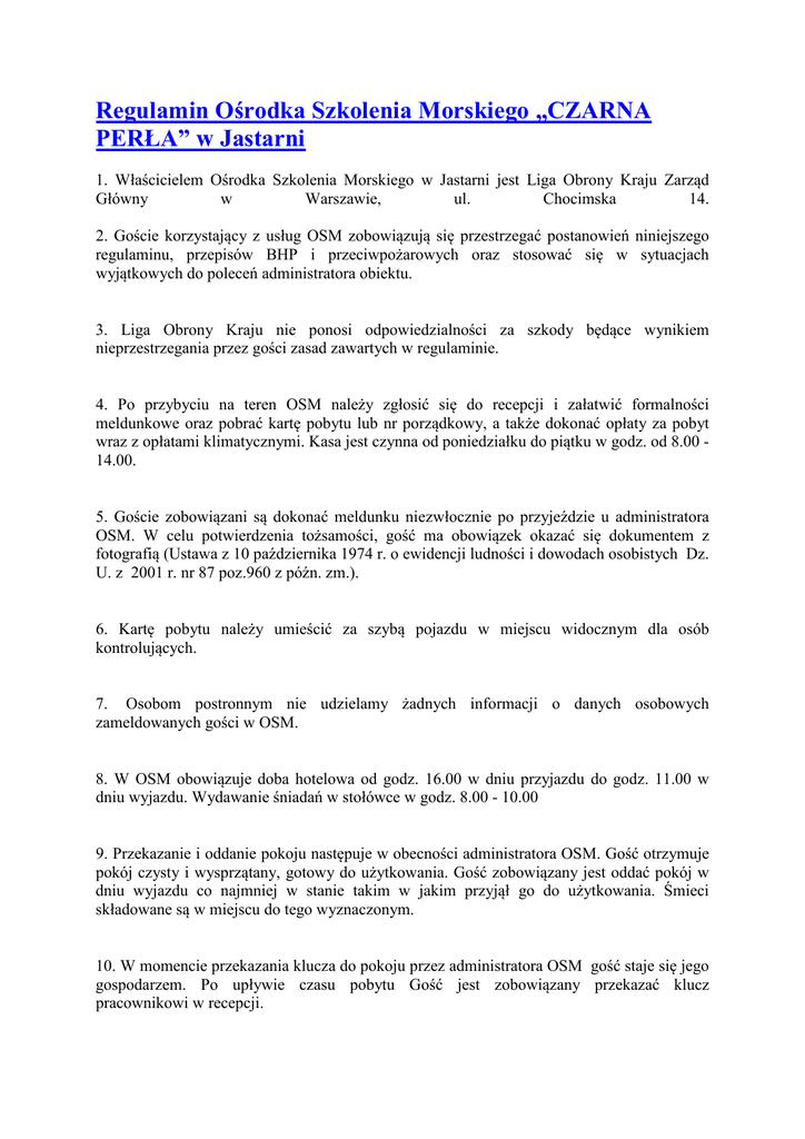 Regulamin Ośrodka Szkolenia Morskiego „CZARNA PERŁA” w Jastarni 1. Właścicielem Ośrodka Szkolenia Morskiego w Jastarni jest Liga Obrony Kraju Zarząd Główny w Warszawie, ul. Chocimska 14. 2. Goście korzystający z usług OSM zobowiązują się przestrzegać postanowień niniejszego regulaminu, przepisów BHP i przeciwpożarowych oraz stosować się w sytuacjach wyjątkowych do poleceń administratora obiektu. 3. Liga Obrony Kraju nie ponosi odpowiedzialności za szkody będące wynikiem nieprzestrzegania przez gości zasad zawartych w regulaminie. 4. Po przybyciu na teren OSM należy zgłosić się do recepcji i załatwić formalności meldunkowe oraz pobrać kartę pobytu lub nr porządkowy, a także dokonać opłaty za pobyt wraz z opłatami klimatycznymi. Kasa jest czynna od poniedziałku do piątku w godz. od 8.00 14.00. 5. Goście zobowiązani są dokonać meldunku niezwłocznie po przyjeździe u administratora OSM. W celu potwierdzenia tożsamości, gość ma obowiązek okazać się dokumentem z fotografią (Ustawa z 10 października 1974 r. o ewidencji ludności i dowodach osobistych Dz. U. z 2001 r. nr 87 poz.960 z późn. zm.). 6. Kartę pobytu należy umieścić za szybą pojazdu w miejscu widocznym dla osób kontrolujących. 7. Osobom postronnym nie udzielamy żadnych informacji o danych osobowych zameldowanych gości w OSM. 8. W OSM obowiązuje doba hotelowa od godz. 16.00 w dniu przyjazdu do godz. 11.00 w dniu wyjazdu. Wydawanie śniadań w stołówce w godz. 8.00 - 10.00 9. Przekazanie i oddanie pokoju następuje w obecności administratora OSM. Gość otrzymuje pokój czysty i wysprzątany, gotowy do użytkowania. Gość zobowiązany jest oddać pokój w dniu wyjazdu co najmniej w stanie takim w jakim przyjął go do użytkowania. Śmieci składowane są w miejscu do tego wyznaczonym. 10. W momencie przekazania klucza do pokoju przez administratora OSM gość staje się jego gospodarzem. Po upływie czasu pobytu Gość jest zobowiązany przekazać klucz pracownikowi w recepcji. 11. Do każdego pokoju przydzielone jest jedno bezpłatne miejsce parkingowe. Gość korzystający z parkingu obowiązany jest do podania nr rejestracyjnego jego samochodu w recepcji przy meldunku w celu możliwości identyfikacji właściciela pojazdu (przepis bezpłatnego miejsca parkingowego nie dotyczy właścicieli samochodów na polu namiotowym). 12. Wjazd i parkowanie pojazdów dozwolone jest wyłącznie w miejscach do tego celu wyznaczonych. Parking jest bezpłatny, niestrzeżony, zamykany jedynie w godzinach ciszy nocnej. Właściciel- OSM nie ponosi odpowiedzialności za pozostawione pojazdy ani znajdujące się w nich mienie. 13. Zezwala się na pobyt w OSM zwierząt domowych. Właściciele zobowiązani są do posiadania aktualnej książeczki szczepienia swojego czworonoga oraz sprzątania nieczystości. Na terenie OSM zabrania się trzymania zwierząt chorych, drapieżnych i jadowitych. Zwierzęta stwarzające zagrożenie dla zdrowia lub życia ludzkiego mogą przebywać tylko i wyłącznie w kagańcu i na uwięzi. Pełną odpowiedzialność za skutki powstałe w wyniku przebywania na terenie OSM zwierząt ponoszą właściciele i/lub opiekunowie zwierząt. 14. Gość ponosi pełną odpowiedzialność materialną za wszelkiego rodzaju uszkodzenia lub zniszczenia wyposażenia i urządzeń technicznych OSM powstałe z jego winy lub winy odwiedzających. 15. Przedmioty osobistego użytku pozostawione przez wyjeżdżającego gościa będą odesłane na jego koszt i ryzyko na wskazany adres. 16. W OSM obowiązuje cisza nocna trwająca w godzinach 22.00 - 7.00 . 17. W przypadku zgubienia klucza, gość zobowiązany jest do uiszczenia opłaty w wysokości 20,00 zł/szt. lub dorobienia go na własny koszt. 18. Pobyt dzieci i młodzieży do lat 18 w OSM dozwolony jest tylko pod opieką dorosłych. 19. Grillowanie odbywa się tylko w wyznaczonym do tego miejscu. Zabrania się grillowania na tarasach. Zabrania się używania drewna kominkowego do palenia na grillu. Palenie ogniska odbywa się po uzgodnieniu i uiszczeniu opłaty w recepcji. 20. Ze względu na wymogi p.poż. w OSM obowiązuje zakaz używania jakichkolwiek urządzeń zasilanych energią elektryczną, nie stanowiących wyposażenia pokoju. Zabrania się używania dodatkowych urządzeń grzewczych lub elektronicznych. W pokojach obowiązuje kategoryczny zakaz palenia papierosów. 21. W OSM zabronione jest: • zakłócanie spokoju, np. wykonywanie lub odtwarzanie głośnej muzyki, (osobie, która narusza tę zasadę administrator może odmówić dalszego świadczenia usług), • zachowanie powszechnie uznawane za nieprzyzwoite. 22. Administrator OSM ma prawo do odmowy zakwaterowania osobom: • będącym pod widocznym wpływem alkoholu lub środków odurzających, • zachowującym się agresywnie, lub w sposób powszechnie uznany za wulgarny. 23. Osoby naruszające zasady niniejszego regulaminu zobowiązane będą do opuszczenia OSM bez zwrotów kosztów. 24. Wykupiony pobyt w OSM nie stanowi ubezpieczenia od następstw nieszczęśliwych wypadków przebywających w nim osób oraz kradzieży i zniszczenia mienia należącego do gości. OSM nie ponosi odpowiedzialności za utratę lub zniszczenie mienia (pieniędzy, papierów wartościowych, kosztowności lub innych przedmiotów, w tym również posiadających wartość naukową lub artystyczną) oraz za wypadki losowe. Zaleca się, aby wypoczywający ubezpieczyli się we własnym zakresie od NNW. 25. Usługi świadczymy zgodnie ze swoją kategorią. W przypadku zastrzeżeń, dot. jakości usług, gość proszony jest o zgłoszenie reklamacji nie później niż dobę od momentu meldunku. Reklamacje składane w dniu wykwaterowania nie będą rozpatrywane. Jednocześnie informujemy, iż nie odpowiadamy za niegodności spowodowane przez przyczyny od nas niezależne np. przerwy w dostawie prądu czy wody. Wszelkie usterki wynikłe w trakcie użytkowania pokoju prosimy zgłasza