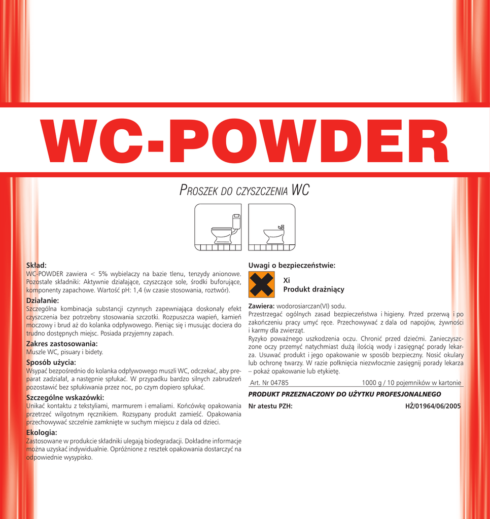 WC-POWDER PROSZEK DO CZYSZCZENIA WC Sk∏ad: WC-POWDER zawiera < 5% wybielaczy na bazie tlenu, tenzydy anionowe. Pozosta∏e sk∏adniki: Aktywnie dzia∏ajàce, czyszczàce sole, Êrodki buforujàce, komponenty zapachowe. WartoÊç pH: 1,4 (w czasie stosowania, roztwór). Dzia∏anie: Szczególna kombinacja substancji czynnych zapewniajàca doskona∏y efekt czyszczenia bez potrzebny stosowania szczotki. Rozpuszcza wapieƒ, kamieƒ moczowy i brud a˝ do kolanka odp∏ywowego. Pieniàc si´ i musujàc dociera do trudno dost´pnych miejsc. Posiada przyjemny zapach. Zakres zastosowania: Muszle WC, pisuary i bidety. Sposób u˝ycia: Wsypaç bezpoÊrednio do kolanka odp∏ywowego muszli WC, odczekaç, aby preparat zadzia∏a∏, a nast´pnie sp∏ukaç. W przypadku bardzo silnych zabrudzeƒ pozostawiç bez sp∏ukiwania przez noc, po czym dopiero sp∏ukaç. Szczególne wskazówki: Unikaç kontaktu z tekstyliami, marmurem i emaliami. Koƒcówk´ opakowania przetrzeç wilgotnym r´cznikiem. Rozsypany produkt zamieÊç. Opakowania przechowywaç szczelnie zamkni´te w suchym miejscu z dala od dzieci. Ekologia: Zastosowane w produkcie sk∏adniki ulegajà biodegradacji. Dok∏adne informacje mo˝na uzyskaç indywidualnie. Opró˝nione z resztek opakowania dostarczyç na odpowiednie wysypisko. Uwagi o bezpieczeƒstwie: Xi Produkt dra˝niàcy Zawiera: wodorosiarczan(VI) sodu. Przestrzegaç ogólnych zasad bezpieczeƒstwa i higieny. Przed przerwà i po zakoƒczeniu pracy umyç r´ce. Przechowywaç z dala od napojów, ˝ywnoÊci i karmy dla zwierzàt. Ryzyko powa˝nego uszkodzenia oczu. Chroniç przed dzieçmi. Zanieczyszczone oczy przemyç natychmiast du˝à iloÊcià wody i zasi´gnàç porady lekarza. Usuwaç produkt i jego opakowanie w sposób bezpieczny. Nosiç okulary lub ochron´ twarzy. W razie po∏kni´cia niezw∏ocznie zasi´gnij porady lekarza – poka˝ opakowanie lub etykiet´. Art. Nr 04785 1000 g / 10 pojemników w kartonie PRODUKT PRZEZNACZONY DO U˚YTKU PROFESJONALNEGO Nr atestu PZH: H˚/01964/06/2005