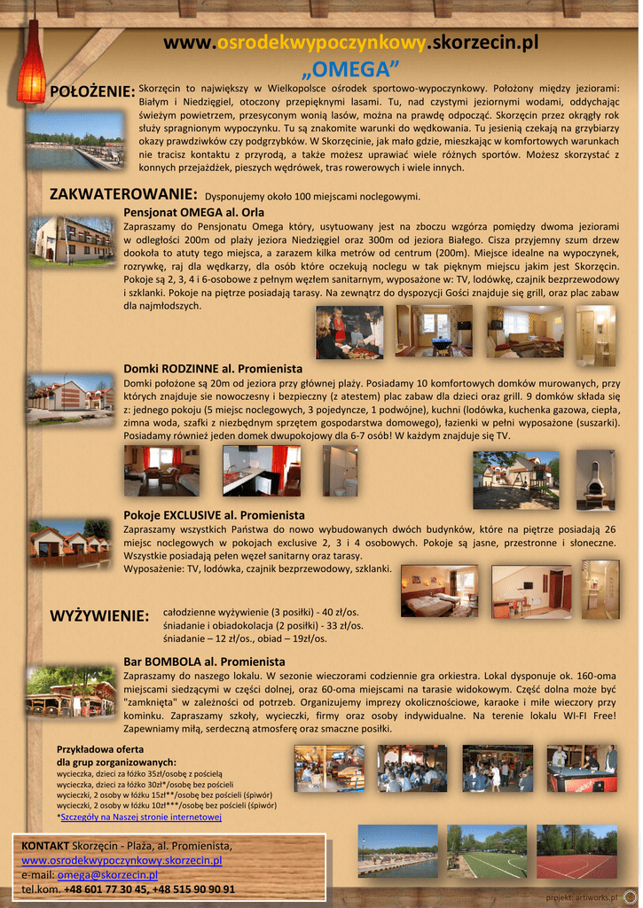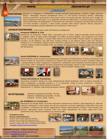 www.osrodekwypoczynkowy.skorzecin.pl „OMEGA” to największy w Wielkopolsce ośrodek sportowo-wypoczynkowy. Położony między jeziorami: POŁOŻENIE: Skorzęcin Białym i Niedzięgiel, otoczony przepięknymi lasami. Tu, nad czystymi jeziornymi wodami, oddychając świeżym powietrzem, przesyconym wonią lasów, można na prawdę odpocząd. Skorzęcin przez okrągły rok służy spragnionym wypoczynku. Tu są znakomite warunki do wędkowania. Tu jesienią czekają na grzybiarzy okazy prawdziwków czy podgrzybków. W Skorzęcinie, jak mało gdzie, mieszkając w komfortowych warunkach nie tracisz kontaktu z przyrodą, a także możesz uprawiad wiele różnych sportów. Możesz skorzystad z konnych przejażdżek, pieszych wędrówek, tras rowerowych i wiele innych. ZAKWATEROWANIE: Dysponujemy około 100 miejscami noclegowymi. Pensjonat OMEGA al. Orla Zapraszamy do Pensjonatu Omega który, usytuowany jest na zboczu wzgórza pomiędzy dwoma jeziorami w odległości 200m od plaży jeziora Niedzięgiel oraz 300m od jeziora Białego. Cisza przyjemny szum drzew dookoła to atuty tego miejsca, a zarazem kilka metrów od centrum (200m). Miejsce idealne na wypoczynek, rozrywkę, raj dla wędkarzy, dla osób które oczekują noclegu w tak pięknym miejscu jakim jest Skorzęcin. Pokoje są 2, 3, 4 i 6-osobowe z pełnym węzłem sanitarnym, wyposażone w: TV, lodówkę, czajnik bezprzewodowy i szklanki. Pokoje na piętrze posiadają tarasy. Na zewnątrz do dyspozycji Gości znajduje się grill, oraz plac zabaw dla najmłodszych. Domki RODZINNE al. Promienista Domki położone są 20m od jeziora przy głównej plaży. Posiadamy 10 komfortowych domków murowanych, przy których znajduje sie nowoczesny i bezpieczny (z atestem) plac zabaw dla dzieci oraz grill. 9 domków składa się z: jednego pokoju (5 miejsc noclegowych, 3 pojedyncze, 1 podwójne), kuchni (lodówka, kuchenka gazowa, ciepła, zimna woda, szafki z niezbędnym sprzętem gospodarstwa domowego), łazienki w pełni wyposażone (suszarki). Posiadamy również jeden domek dwupokojowy dla 6-7 osób! W każdym znajduje się TV. Pokoje EXCLUSIVE al. Promienista Zapraszamy wszystkich Paostwa do nowo wybudowanych dwóch budynków, które na piętrze posiadają 26 miejsc noclegowych w pokojach exclusive 2, 3 i 4 osobowych. Pokoje są jasne, przestronne i słoneczne. Wszystkie posiadają pełen węzeł sanitarny oraz tarasy. Wyposażenie: TV, lodówka, czajnik bezprzewodowy, szklanki. WYŻYWIENIE: całodzienne wyżywienie (3 posiłki) - 40 zł/os. śniadanie i obiadokolacja (2 posiłki) - 33 zł/os. śniadanie – 12 zł/os., obiad – 19zł/os. Bar BOMBOLA al. Promienista Zapraszamy do naszego lokalu. W sezonie wieczorami codziennie gra orkiestra. Lokal dysponuje ok. 160-oma miejscami siedzącymi w części dolnej, oraz 60-oma miejscami na tarasie widokowym. Częśd dolna może byd "zamknięta" w zależności od potrzeb. Organizujemy imprezy okolicznościowe, karaoke i miłe wieczory przy kominku. Zapraszamy szkoły, wycieczki, firmy oraz osoby indywidualne. Na terenie lokalu WI-FI Free! Zapewniamy miłą, serdeczną atmosferę oraz smaczne posiłki. Przykładowa oferta dla grup zorganizowanych: wycieczka, dzieci za łóżko 35zł/osobę z pościelą wycieczka, dzieci za łóżko 30zł*/osobę bez pościeli wycieczki, 2 osoby w łóżku 15zł**/osobę bez pościeli (śpiwór) wycieczki, 2 osoby w łóżku 10zł***/osobę bez pościeli (śpiwór) *Szczegóły na Naszej stronie internetowej KONTAKT Skorzęcin - Plaża, al. Promienista, www.osrodekwypoczynkowy.skorzecin.pl e-mail: [email protected] tel.kom. +48 601 77 30 45, +48 515 90 90 91 projekt: artiworks.pl
