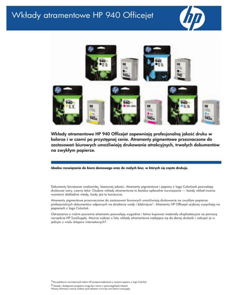 Wkłady atramentowe HP 940 Officejet Wkłady atramentowe HP 940 Officejet zapewniają profesjonalną jakość druku w kolorze i w czerni po przystępnej cenie. Atramenty pigmentowe przeznaczone do zastosowań biurowych umożliwiają drukowanie atrakcyjnych, trwałych dokumentów na zwykłym papierze. Idealne rozwiązanie do biura domowego oraz do małych biur, w których się często drukuje. Dokumenty biznesowe znakomitej, laserowej jakości. Atramenty pigmentowe i papiery z logo ColorLook pozwalają drukować ostry, czarny tekst. Osobne wkłady atramentowe to bardzo opłacalne rozwiązanie — każdy wkład można wymienić dokładnie wtedy, kiedy jest to konieczne. Atramenty pigmentowe przeznaczone do zastosowań biurowych umożliwiają drukowanie na zwykłym papierze profesjonalnych dokumentów odpornych na działanie wody i blaknięcie1. Atramenty HP Officejet szybciej wysychają na papierach z logo ColorLok. Ostrzeżenia o niskim poziomie atramentu pozwalają wygodnie i łatwo kupować materiały eksploatacyjne za pomocą narzędzia HP SureSupply. Można wybrać z listy wkłady atramentowe nadające się do danej drukarki i zakupić je w jednym z wielu sklepów internetowych2. 1Na podstawie wewnętrznych testów HP przeprowadzonych z użyciem papieru z logo ColorLok 2 Zasady i dostępność programu mogą być różne w poszczególnych krajach Więcej informacji można znaleźć pod adresem www.hp.com/learn/suresupply. Wkłady atramentowe HP 940 Officejet Dane techniczne produktu P/N C4902AE C4906AE C4907AE C4908AE C4909AE Opis Numer wyboru Czarny wkład atramentowy HP 940 Officejet 940 Czarny wkład atramentowy HP 940XL Officejet 940 Kaseta z błękitnym atramentem HP 940XL 940 Officejet Kaseta z purpurowym atramentem HP 940XL 940 Officejet Kaseta z żółtym atramentem HP 940XL 940 Officejet Rozmiary opakowania produktu Waga 142 x 124 x 40 mm 0,091 kg 142 x 124 x 40 mm 0,129 kg 142 x 109 x 25 mm 0,077 kg Kod UPC 884420689744 884420689751 884420689768 142 x 109 x 25 mm 0,077 kg 884420689775 142 x 109 x 25 mm 0,077 kg 884420689782 Gwarancja HP gwarantuje, że produkty HP są wolne od wad materiałowych i wykonawczych w warunkach normalnego użytkowania zgodnie ze specyfikacjami do dnia oznaczonego na produkcie. Gwarancja nie obejmuje produktów zużytych lub w jakikolwiek sposób modyfikowanych. Szczegółowe warunki gwarancji można uzyskać u sprzedawcy lub pod adresem www.hp.com/support/inkjet_warranty. Poza prawami określonymi w niniejszej gwarancji nabywca ma także te przewidziane prawem, których niniejsza gwarancja nie ogranicza. © Copyright 2009 Hewlett-Packard Development Company L.P. Informacje zawarte w tym dokumencie mogą bez uprzedzenia ulec zmianie. Jedyne gwarancje, jakich HP udziela na produkty i usługi, są określone w oświadczeniach gwarancyjnych dostarczanych wraz z takimi produktami i usługami. Żaden zapis niniejszego dokumentu nie może być uważany za dodatkową gwarancję. HP nie ponosi odpowiedzialności za błędy techniczne lub redakcyjne oraz braki występujące w niniejszym dokumencie. Więcej informacji na stronie www.hp.com/go/pageyield Publikacja na region EMEA 4AA2-3986 PLE