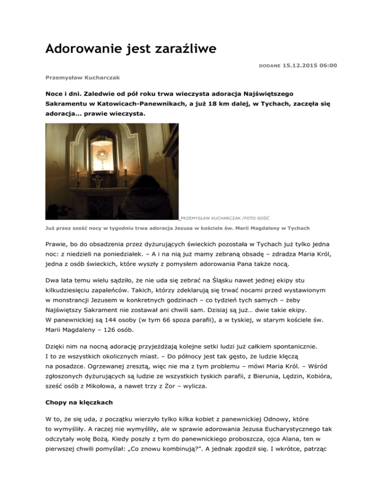 Adorowanie jest zaraźliwe DODANE 15.12.2015 06:00 Przemysław Kucharczak Noce i dni. Zaledwie od pół roku trwa wieczysta adoracja Najświętszego Sakramentu w Katowicach-Panewnikach, a już 18 km dalej, w Tychach, zaczęła się adoracja... prawie wieczysta. PRZEMYSŁAW KUCHARCZAK /FOTO GOŚĆ Już przez sześć nocy w tygodniu trwa adoracja Jezusa w kościele św. Marii Magdaleny w Tychach Prawie, bo do obsadzenia przez dyżurujących świeckich pozostała w Tychach już tylko jedna noc: z niedzieli na poniedziałek. – A i na nią już mamy zebraną obsadę – zdradza Maria Król, jedna z osób świeckich, które wyszły z pomysłem adorowania Pana także nocą. Dwa lata temu wielu sądziło, że nie uda się zebrać na Śląsku nawet jednej ekipy stu kilkudziesięciu zapaleńców. Takich, którzy zdeklarują się trwać nocami przed wystawionym w monstrancji Jezusem w konkretnych godzinach – co tydzień tych samych – żeby Najświętszy Sakrament nie zostawał ani chwili sam. Dzisiaj są już… dwie takie ekipy. W panewnickiej są 144 osoby (w tym 66 spoza parafii), a w tyskiej, w starym kościele św. Marii Magdaleny – 126 osób. Dzięki nim na nocną adorację przyjeżdżają kolejne setki ludzi już całkiem spontanicznie. I to ze wszystkich okolicznych miast. – Do północy jest tak gęsto, że ludzie klęczą na posadzce. Ogrzewanej zresztą, więc nie ma z tym problemu – mówi Maria Król. – Wśród zgłoszonych dyżurujących są ludzie ze wszystkich tyskich parafii, z Bierunia, Lędzin, Kobióra, sześć osób z Mikołowa, a nawet trzy z Żor – wylicza. Chopy na klęczkach W to, że się uda, z początku wierzyło tylko kilka kobiet z panewnickiej Odnowy, które to wymyśliły. A raczej nie wymyśliły, ale w sprawie adorowania Jezusa Eucharystycznego tak odczytały wolę Bożą. Kiedy poszły z tym do panewnickiego proboszcza, ojca Alana, ten w pierwszej chwili pomyślał: „Co znowu kombinują?”. A jednak zgodził się. I wkrótce, patrząc na owoce, doszedł do wniosku, że ma do czynienia z dziełem Bożym. Od kiedy ludzie trwają tu przed Panem nocami, więcej ludzi zaczęło klękać przed wystawioną monstrancją także w dzień. Wystąpiło wyraźne ożywienie wśród grup parafialnych. I zaledwie rok po rozpoczęciu nocnej adoracji w Panewnikach podobna ruszyła wcale nie gdzieś na drugim końcu diecezji, np. w Rybniku czy w Piekarach, ale zaledwie 18 km dalej, w Tychach. Ludzi gotowych do podjęcia dyżurów, mimo niewielkiego przecież obszaru, bez problemu wystarczyło na oba te kościoły. Tak promieniuje modlitwa. Teraz Panewniki świętują dwa lata od pierwszej nocnej adoracji, a sąsiednie Tychy – roczek. Te adoracje to dowód, że Kościół jednak nie jest „żeńskokatolicki”. Można tu nocami spotkać wielu twardych mężczyzn, którzy przybywają nieraz z daleka. Z Paniówek do Panewnik przyjeżdżają nawet rodzice małych dzieci, Danka i Jacek. Zmieniają się przy opiece nad maluchami, dzięki czemu każde z nich może przyjechać na jedną godzinę. Danka wciąż przyjeżdża, choć spodziewa się trzeciego dziecka... A kiedy już przyjeżdżać nie będzie mogła, na pewno znajdzie się ktoś, kto ją na dyżurze zastąpi. Studentka się żegna Na klęczkach często trwają przed Jezusem studenci (w pobliżu bazyliki w Panewnikach stoją akademiki). Oni rzadko deklarują się na dyżury, ale spontanicznie przychodzą adorować Boga zamkniętego w hostii. Najczęściej na godzinę lub dwie przed północą. – Proszę zobaczyć, jakie świadectwo napisała jakaś dziewczyna na zakończenie swoich studiów, prawdopodobnie medycznych – Barbara Mrozek, jedna z kobiet, które organizują grafik dyżurów na adoracji w Panewnikach, podsuwa odbity na ksero list. Studentka pisze w nim, jak przez 6 lat studiów tutaj zaglądała. Wspomina, że choć klękała przed Najwyższym, to z początku myślami była przy swoim codziennym zabieganiu. Modlitwę na głębszym, piękniejszym poziomie odkryła dzięki małej książce „Modlitwa w ciszy” ks. Andrzeja Muszali. – Dziewczyna na pożegnanie z Katowicami kupiła metr bieżący tych książeczek i zostawiła je w kaplicy, żeby ludzie sobie zabierali – mówi Barbara Mrozek. Mamusiu, usiądź sobie Poruszające są świadectwa ludzi modlących się. Pani Ola z Katowic opowiada, jak mocno modliła się w czasie tej adoracji o dziecko dla syna i synowej. Zaczęła tę modlitwę wiosną 2014 r., po powrocie z wizyty u dzieci w Irlandii. Zobaczyła tam, jak bardzo cierpią z powodu bezdzietności. – W kaplicy nocnej adoracji w Panewnikach jest figura MB Fatimskiej, a ja odmawiałam Różaniec w tej intencji. Pewnej nocy niespodziewanie doznałam silnego przekonania, że synowa już jest w ciąży. Odebrałam to jako obraz z ciężarną synową, były tam też dzieci fatimskie. Niczego podobnego w życiu nie doznałam. Zszokowana mówię: „Co ja tu sobie wymyślam?”. Ale już nie umiałam dalej modlić się o ciążę dla synowej, tak, jakby tę modlitwę coś mi odrzucało... Odczułam, że mam dziękować, bo synowa już jest w ciąży i że niczym mam się nie przejmować. Więc od tej pory już tylko prosiłam, żeby się urodziło zdrowe dziecko – wspomina. W pierwszym odruchu, w euforii, Ola chciała już o poranku dzwonić do dzieci i opowiadać, co ją spotkało. Powstrzymała ją jednak myśl, że nie powinna naruszać ich intymności. – Syn z synową też nic mi nie mówili w czasie naszych rozmów przez Skype’a. Ale przyjechali do Katowic za dwa miesiące. Synowa mówi: „Mamusiu, usiądź sobie”, po czym mi oznajmia, że jest w drugim miesiącu ciąży. Ja na to tylko tak się uśmiechnęłam. Oni: „Jak to, nie cieszysz się?”. A ja: „Cieszę się bardzo, ale ja po prostu to już od dwóch miesięcy wiem”. Okazało się, że młodzi nie od razu powiedzieli Oli o ciąży, bo irlandzki ginekolog ich ostrzegał: „Nie wiem, jakim cudem pani w cią
