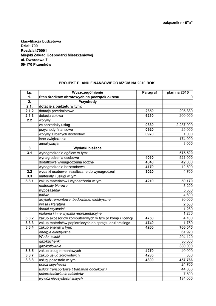 załącznik nr 6”a” klasyfikacja budżetowa Dział: 700 Rozdział:70001 Miejski Zakład Gospodarki Mieszkaniowej ul. Dworcowa 7 59-170 Przemków PROJEKT PLANU FINANSOWEGO MZGM NA 2010 ROK Lp. 1. 2. 2.1. 2.1.2 2.1.3 2.2 3 3.1 3.2 3.3 3.3.1 3.3.2 3.3.3 3.3.4 3.3.5 3.3.7 3.3.8 Wyszczególnienie Stan środków obrotowych na początek okresu Przychody dotacje z budżetu w tym: dotacja przedmiotowa dotacja celowa wpływy: ze sprzedaży usług przychody finansowe wpływy z różnych dochodów inne zwiększenia amortyzacja Wydatki bieżące wynagrodzenia ogółem w tym: wynagrodzenia osobowe dodatkowe wynagrodzenia roczne wynagrodzenia bezosobowe wydatki osobowe niezaliczane do wynagrodzeń materiały i usługi w tym: zakup materiałów i wyposażenia w tym: materiały biurowe wyposażenie paliwo artykuły remontowe, budowlane, elektryczne prasa i literatura środki czystości reklama i inne wydatki reprezentacyjne zakup akcesoriów komputerowych w tym.pr komp i licencji zakup materiałów papierniczych do sprzętu drukarskiego zakup energii w tym: energia elektryczna Woda, ścieki gaz-kuchenki gaz-kotłownie zakup usług remontowych zakup usług zdrowotnych usługi pozostałe w tym: praca spychacza usługi transportowe ( transport odcieków ) unieszkodliwianie odcieków wywóz nieczystości stałych Paragraf plan na 2010 0 2650 6210 205 880 200 000 0830 0920 0970 2 237 000 25 000 1 000 174 000 3 000 4010 4040 4170 3020 4210 4750 4740 4260 4270 4280 4300 575 500 521 000 42 000 12 500 4 700 50 170 5 200 5 300 4 600 30 000 2 580 1 260 1 230 4 100 1 750 766 040 61 920 294 120 30 000 380 000 40 000 800 457 766 24 700 44 036 7 500 134 000 3.3.8 3.3.9 3.3.10 3.3.11 3.3.12 3.3.13 3.4 3.4.1 3.4.2 3.5 3.6 3.6.1 3.6.2 3.6.3 3.6.4 3.6.5. 4. 4.1. 4.2. 4.3. 5. 6. monitoring składowiska Ścieki ( wyw.nieczyst. płynnych ) usługi kominiarskie utrzymanie klatek obsługa kotłowni dezynfekcja i deratyzacja usługi informatyczne usługi bankowe usługi pocztowe inne ( wypisy, procedury, ocena ryzyka zawodowego) zakup usług dostępu do sieci internet opłaty z tyt. zak. usł. telefonii komórkowej opłaty z tyt. zak. usł. telefonii stacjonarnej ekspertyzy, analizy i opinie podróże służbowe krajowe szkolenia pracowników pochodne od wynagrodzeń z tego: składki na ubezpieczenia społeczne składki na Fundusz Pracy odpisy na zakładowy fundusz świadczeń socjalnych pozostałe wydatki kary i odszkodowania ( szkody ubezpieczeniowe ) koszty postępowania sądowego i prokuratorskiego różne opłaty i składki ( ubezp. Rzeczowe ) pozostałe odsetki inwestycje Podatki podatek od towarów i usług VAT podatek od nieruchomości podatek dochodowy amortyzacja inne zmniejszenia Razem wydatki Stan środków obrotowych na koniec okresu 4350 4360 4370 4390 4410 4700 13 400 31 000 11 000 110 000 10 100 2 200 5 300 1 700 8 700 54 130 1 300 3 200 4 700 35 000 10 600 5 300 4110 4120 4440 90 700 14 100 18 100 4590 4610 4430 4580 6080 1 000 50 000 201 000 100 200 000 4530 4480 4460 44 800 72 000 5 000 3 000 185 154 2 845 880 0