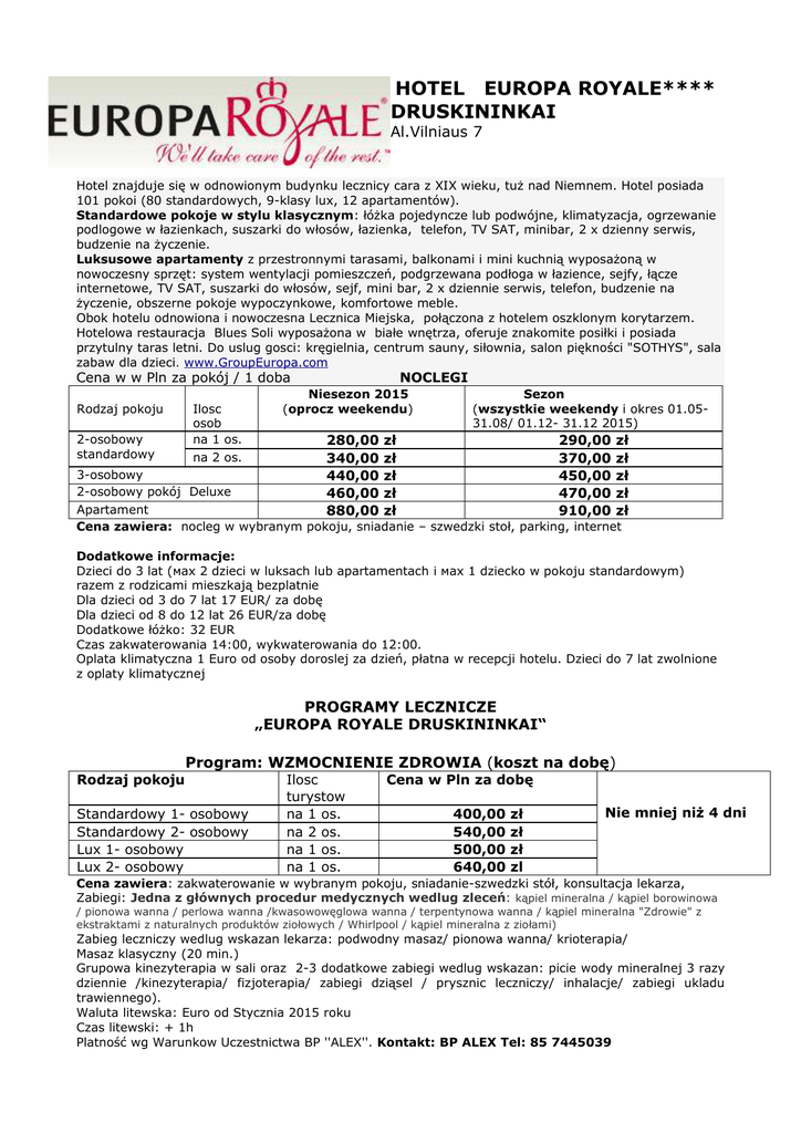 HOTEL EUROPA ROYALE**** DRUSKININKAI Al.Vilniaus 7 Hotel znajduje się w odnowionym budynku lecznicy cara z XIX wieku, tuż nad Niemnem. Hotel posiada 101 pokoi (80 standardowych, 9-klasy lux, 12 apartamentów). Standardowe pokoje w stylu klasycznym: łóżka pojedyncze lub podwójne, klimatyzacja, ogrzewanie podlogowe w łazienkach, suszarki do włosów, łazienka, telefon, TV SAT, minibar, 2 x dzienny serwis, budzenie na życzenie. Luksusowe apartamenty z przestronnymi tarasami, balkonami i mini kuchnią wyposażoną w nowoczesny sprzęt: system wentylacji pomieszczeń, podgrzewana podłoga w łazience, sejfy, łącze internetowe, TV SAT, suszarki do włosów, sejf, mini bar, 2 x dziennie serwis, telefon, budzenie na życzenie, obszerne pokoje wypoczynkowe, komfortowe meble. Obok hotelu odnowiona i nowoczesna Lecznica Miejska, połączona z hotelem oszklonym korytarzem. Hotelowa restauracja Blues Soli wyposażona w białe wnętrza, oferuje znakomite posiłki i posiada przytulny taras letni. Do uslug gosci: kręgielnia, centrum sauny, siłownia, salon piękności "SOTHYS", sala zabaw dla dzieci. www.GroupEuropa.com Cena w w Pln za pokój / 1 doba Rodzaj pokoju 2-osobowy standardowy Ilosc osob nа 1 os. nа 2 os. NOCLEGI Niesezon 2015 (oprocz weekendu) 280,00 340,00 440,00 460,00 880,00 Sezon (wszystkie weekendy i okres 01.0531.08/ 01.12- 31.12 2015) zł zł zł zł zł 290,00 370,00 450,00 470,00 910,00 zł zł zł zł zł 3-osobowy 2-osobowy pokój Deluxe Apartament Cena zawiera: nocleg w wybranym pokoju, sniadanie – szwedzki stoł, parking, internet Dodatkowe informacje: Dzieci do 3 lat (мах 2 dzieci w luksach lub apartamentach i мах 1 dziecko w pokoju standardowym) razem z rodzicami mieszkają bezplatnie Dla dzieci od 3 dо 7 lat 17 EUR/ za dobę Dla dzieci od 8 dо 12 lat 26 EUR/za dobę Dodatkowe łóżko: 32 EUR Czas zakwaterowania 14:00, wykwaterowania do 12:00. Oplata klimatyczna 1 Euro od osoby doroslej za dzień, płatna w recepcji hotelu. Dzieci do 7 lat zwolnione z oplaty klimatycznej PROGRAMY LECZNICZE „ЕUROPA ROYALE DRUSKININKAI“ Program: WZMOCNIENIE ZDROWIA (koszt na dobę) Rodzaj pokoju Standardowy 1- osobowy Standardowy 2- osobowy Lux 1- osobowy Lux 2- osobowy Ilosc turystow na 1 os. nа 2 os. nа 1 os. nа 1 os. Cena w Pln za dobę 400,00 540,00 500,00 640,00 zł zł zł zl Nie mniej niż 4 dni Cena zawiera: zakwaterowanie w wybranym pokoju, sniadanie-szwedzki stół, konsultacja lekarza, Zabiegi: Jedna z głównych procedur medycznych wedlug zleceń: kąpiel mineralna / kąpiel borowinowa / pionowa wanna / perlowa wanna /kwasowowęglowa wanna / terpentynowa wanna / kąpiel mineralna "Zdrowie" z ekstraktami z naturalnych produktów ziołowych / Whirlpool / kąpiel mineralna z ziołami) Zabieg leczniczy wedlug wskazan lekarza: podwodny masaz/ pionowa wanna/ krioterapia/ Masaz klasyczny (20 min.) Grupowa kinezyterapia w sali oraz 2-3 dodatkowe zabiegi wedlug wskazan: picie wody mineralnej 3 razy dziennie /kinezyterapia/ fizjoterapia/ zabiegi dziąsel / prysznic leczniczy/ inhalacje/ zabiegi ukladu trawiennego). Waluta litewska: Euro od Stycznia 2015 roku Czas litewski: + 1h Platność wg Warunkow Uczestnictwa BP ''ALEX''. Kontakt: BP ALEX Tel: 85 7445039