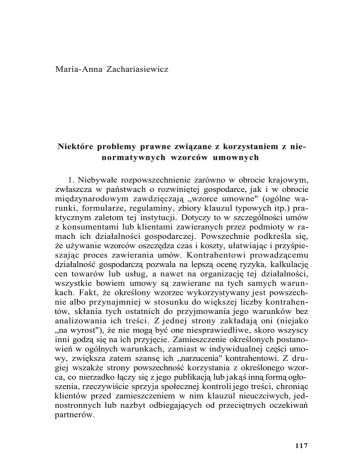 Maria-Anna Zachariasiewicz Niektóre problemy prawne związane z korzystaniem z nienormatywnych wzorców umownych 1. Niebywałe rozpowszechnienie zarówno w obrocie krajowym, zwłaszcza w państwach o rozwiniętej gospodarce, jak i w obrocie międzynarodowym zawdzięczają „wzorce umowne" (ogólne warunki, formularze, regulaminy, zbiory klauzul typowych itp.) praktycznym zaletom tej instytucji. Dotyczy to w szczególności umów z konsumentami lub klientami zawieranych przez podmioty w ramach ich działalności gospodarczej. Powszechnie podkreśla się, że używanie wzorców oszczędza czas i koszty, ułatwiając i przyśpieszając proces zawierania umów. Kontrahentowi prowadzącemu działalność gospodarczą pozwala na lepszą ocenę ryzyka, kalkulację cen towarów lub usług, a nawet na organizację tej działalności, wszystkie bowiem umowy są zawierane na tych samych warunkach. Fakt, że określony wzorzec wykorzystywany jest powszechnie albo przynajmniej w stosunku do większej liczby kontrahentów, skłania tych ostatnich do przyjmowania jego warunków bez analizowania ich treści. Z jednej strony zakładają oni (niejako „na wyrost"), że nie mogą być one niesprawiedliwe, skoro wszyscy inni godzą się na ich przyjęcie. Zamieszczenie określonych postanowień w ogólnych warunkach, zamiast w indywidualnej części umowy, zwiększa zatem szansę ich „narzucenia" kontrahentowi. Z drugiej wszakże strony powszechność korzystania z określonego wzorca, co nierzadko łączy się z jego publikacją lub jakąś inną formą ogłoszenia, rzeczywiście sprzyja społecznej kontroli jego treści, chroniąc klientów przed zamieszczeniem w nim klauzul nieuczciwych, jednostronnych lub nazbyt odbiegających od przeciętnych oczekiwań partnerów. 117 REJENT Nr 9 - wrzesień 1995 r. Korzystanie z wzorców umownych jest także zgodne z interesami obu kontrahentów. Stanowiąc etap pośredni pomiędzy wolą stron a przepisami dyspozytywnymi prawa umów i wypełniając luki istniejące pomiędzy tymi dwiema kategoriami, umożliwiają uwzględnienie specyfiki branżowej lub szczególnych warunków, w jakich działają kontrahenci. Kiedy indziej zaś stanowią jedyną regulację o charakterze szczegółowym. Chodzi tu zwłaszcza o tzw. nowe typy stosunków umownych. Zalety wzorców ujawniają się także wówczas, gdy stanowią one punkt wyjścia negocjacji. W takich wypadkach racjonalizują je, narzucając stronom określony porządek rozmów, oraz uświadamiają im wzajemne oczekiwania. Niektóre typy wzorców umownych opracowują poważne organizacje krajowe lub międzynarodowe, zrzeszenia handlowe lub przedstawiciele grup społecznych, do których należą obaj kontrahenci (np. producenci danej branży i konsumenci). Wzorce te są zazwyczaj dość neutralne i - dążąc do właściwego wyważenia interesów obu partnerów - skutecznie chronią słabszego kontrahenta. Przez dłuższe obowiązywanie przyczyniają się też do tworzenia zwyczajów handlowych, krajowych i międzynarodowych, a z czasem - nawet pisanych norm prawnych. 2. Korzystanie z wzorców umownych rodzi wiele problemów, rozwiązywanych rozmaicie w różnych systemach prawnych, z reguły w sposób nie do końca zadowalający. Zmiany gospodarcze zachodzące w naszym kraju zmuszają nas do intensyfikacji prac nad problematyką prawną wzorców umownych, a więc do zainteresowania się sposobami ich rozwiązywania w poszczególnych krajach, a wcześniej - do sformułowania odpowiednich pytań i opisania problemów, o które chodzi. Instytucja wzorców umownych - mimo jej niewątpliwych „zasług" dla obrotu gospodarczego - spotyka się z licznymi zastrzeżeniami. Ogólne warunki, regulaminy, formularze i inne wzorce lub zbiory klauzul typowych stanowiąc wyraz zasady swobody umów, nierzadko prowadzą do jej nadużywania. Dzięki wzorcom umownym kontrahent silniejszy ekonomicznie albo lepiej wykształcony czy po prostu sprytniejszy może narzucać swoją wolę drugiemu partnerowi. Praktyce tej sprzyja powszechny zwyczaj nieczytania wzorców umownych partnera, a nierzadko - także własnych. Hand- 118 Niektóre problemy prawne.. łowcy z zasady nie interesują sie problematyką prawną twierdząc - zapewne nie bez racji - że handel zamarłby, gdyby zaczęli to robić. Także spory powstałe w związku z wzorcami mają z reguły charakter wtórny w tym sensie, że ich istota dotyczy niewykonania lub nienależytego wykonania umowy, a problemy prawne odnoszące się do wzorców koncentrują się wokół ustalenia treści tej umowy albo - jak uważają niektórzy - treści stosunku umownego. Problematyka wzorców umownych to zatem zagadnienie granic swobody umów lub inaczej - próba ochrony słabszego kontrahenta przed nadużywaniem tej swobody przez silniejszego partnera. To także próba znalezienia przysłowiowego „złotego środka" pomiędzy zasadą swobody umów a postulatem ochrony pewności obrotu (różnie zresztą rozumianym w zależności od tego, czy chodzi o podejście generalne czy indywidualne) oraz zasadą swobody a naczelnym nakazem poszukiwania sprawiedliwości in concreto. Innymi słowy - to zapobieganie negatywnym skutkom faktycznej nierówności podmiotów po to, aby mechanizmy prawa umów mogły działać prawidłowo, nie przeradzając się w swoje zaprzeczenie. Tworzeniu nowych mechanizmów ochronnych nie sprzyja świadomość, że dotychczasowe, zarówno tradycyjne, ogólne instrumenty prawa umów, jak i szczególne instytucje, dotyczące wyłącznie wzorców umownych, okazały się mało skuteczne. Inicjatywa i spryt podmiotów uczestniczących w obrocie, jeśli chodzi o nowe sposoby narzucania nieuczciwych warunków umownych, zawsze wyprzedzały próby tworzenia przez ustawodawcę lub sądy środków ochrony i trudno oczekiwać zmiany tej sytuacji w przyszłości. Nie ułatwia też sprawy przekonanie, szczególnie żywe w krajach postsocjalistycznych, że tworząc owe mechanizmy ochronne, musi