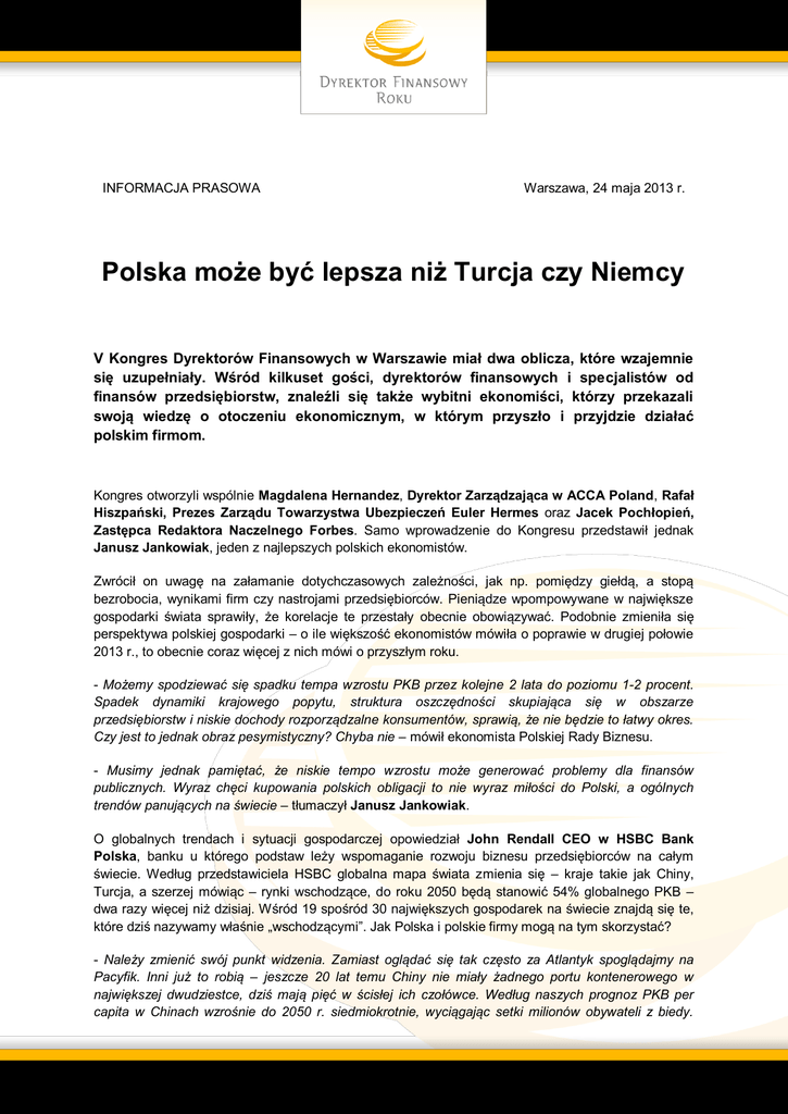 INFORMACJA PRASOWA Warszawa, 24 maja 2013 r. Polska może być lepsza niż Turcja czy Niemcy V Kongres Dyrektorów Finansowych w Warszawie miał dwa oblicza, które wzajemnie się uzupełniały. Wśród kilkuset gości, dyrektorów finansowych i specjalistów od finansów przedsiębiorstw, znaleźli się także wybitni ekonomiści, którzy przekazali swoją wiedzę o otoczeniu ekonomicznym, w którym przyszło i przyjdzie działać polskim firmom. Kongres otworzyli wspólnie Magdalena Hernandez, Dyrektor Zarządzająca w ACCA Poland, Rafał Hiszpański, Prezes Zarządu Towarzystwa Ubezpieczeń Euler Hermes oraz Jacek Pochłopień, Zastępca Redaktora Naczelnego Forbes. Samo wprowadzenie do Kongresu przedstawił jednak Janusz Jankowiak, jeden z najlepszych polskich ekonomistów. Zwrócił on uwagę na załamanie dotychczasowych zależności, jak np. pomiędzy giełdą, a stopą bezrobocia, wynikami firm czy nastrojami przedsiębiorców. Pieniądze wpompowywane w największe gospodarki świata sprawiły, że korelacje te przestały obecnie obowiązywać. Podobnie zmieniła się perspektywa polskiej gospodarki – o ile większość ekonomistów mówiła o poprawie w drugiej połowie 2013 r., to obecnie coraz więcej z nich mówi o przyszłym roku. - Możemy spodziewać się spadku tempa wzrostu PKB przez kolejne 2 lata do poziomu 1-2 procent. Spadek dynamiki krajowego popytu, struktura oszczędności skupiająca się w obszarze przedsiębiorstw i niskie dochody rozporządzalne konsumentów, sprawią, że nie będzie to łatwy okres. Czy jest to jednak obraz pesymistyczny? Chyba nie – mówił ekonomista Polskiej Rady Biznesu. - Musimy jednak pamiętać, że niskie tempo wzrostu może generować problemy dla finansów publicznych. Wyraz chęci kupowania polskich obligacji to nie wyraz miłości do Polski, a ogólnych trendów panujących na świecie – tłumaczył Janusz Jankowiak. O globalnych trendach i sytuacji gospodarczej opowiedział John Rendall CEO w HSBC Bank Polska, banku u którego podstaw leży wspomaganie rozwoju biznesu przedsiębiorców na całym świecie. Według przedstawiciela HSBC globalna mapa świata zmienia się – kraje takie jak Chiny, Turcja, a szerzej mówiąc – rynki wschodzące, do roku 2050 będą stanowić 54% globalnego PKB – dwa razy więcej niż dzisiaj. Wśród 19 spośród 30 największych gospodarek na świecie znajdą się te, które dziś nazywamy właśnie „wschodzącymi”. Jak Polska i polskie firmy mogą na tym skorzystać? - Należy zmienić swój punkt widzenia. Zamiast oglądać się tak często za Atlantyk spoglądajmy na Pacyfik. Inni już to robią – jeszcze 20 lat temu Chiny nie miały żadnego portu kontenerowego w największej dwudziestce, dziś mają pięć w ścisłej ich czołówce. Według naszych prognoz PKB per capita w Chinach wzrośnie do 2050 r. siedmiokrotnie, wyciągając setki milionów obywateli z biedy. Warto jednak pamiętać, że będzie to stanowić i tak zaledwie połowę dzisiejszego PKB na głowę w USA – tłumaczył John Rendall. - Należy więc otworzyć się na możliwości leżące za granicami kraju, kontynuować wzrost eksportu, który w 2012 r. wyniósł w Polsce 3,9%, więcej niż wzrost PKB. Perspektywicznie wyglądają takie kraje jak Turcja, Algeria czy Kazachstan – możliwości jest naprawdę wiele – mówił Dyrektor Zarządzający HSBC Bank Polska. O tym jak zagrożenia płynące z europejskiego kryzysu przekuć w szansę – choćby na rozwój na zagranicznych rynkach, rozmawiali uczestnicy panelu dyskusyjnego, który moderował Jacek Pochłopień, zastępca redaktora naczelnego Forbes. Andrzej Rzońca, członek Rady Polityki Pieniężnej, zwrócił uwagę na zróżnicowanie gospodarek na świecie, a nawet samej Europy, co stwarza zarówno szanse jaki zagrożenia. Zgodził się z wizją mapy świata przedstawioną przez HSBC, dodając – jako interesujące – także takie kraje jak Niemcy czy kraje nadbałtyckie. Ewa GrudnikSiemińska, Wiceprezes Zarządu oraz dyrektor finansowy w AIC, udowodniła z kolei, że udany rozwój firmy można przeprowadzić także w USA. Zachęcała do zmiany perspektywy patrzenia na kryzys, który oferuje nie tylko szanse, ale i „prezenty” – w postaci pobudzenia zespołów do nowych wyzwań i możliwości wprowadzenia większych oszczędności w firmie. Szanse na wzrost w kryzysie widział także Gracjan Fedorowicz, członek Zarządu w Grupie Pracuj.pl. – Kryzys traktowaliśmy jako wyzwanie i nie panikowaliśmy. Tymczasem wielu dyrektorów finansowych podeszło do kryzysu jako możliwości tylko i wyłącznie cięcia kosztów – mówił. Wtórował mu Kenny Morgan, CFO w Trinity Corporate Service, którego firma nawet nie myślała o cięciu kosztów, a wręcz przeciwnie – o dynamicznym wzroście, np. w Czechach, Rumunii czy w Polsce. Obserwacje Euler Hermes, globalnej firmy ubezpieczającej należności, przedstawił Prezes Zarządu Towarzystwa Ubezpieczeniowego Euler Hermes, Rafał Hiszpański. Według niego kryzys stwarza szanse w trzech wymiarach: rozwoju eksportu na nowe rynki, szczególnie wschodnie (Słowacja, Białoruś), optymalizacji procesów w firmach oraz w wymiarze strategicznego myślenia średnio i długoterminowego. – Często naszym przedsiębiorcom ucieka szczególnie ta średnioterminowa perspektywa, na kolejne 2-3 lata. Niewielu zastanawia się jak będzie wyglądał portfel zamówień czy konkurencja w tym okresie – powiedział. Tematyka cięcia kosztów, jako konieczności i optymalizacji, została szeroko poruszona przez Janusza Kudłaciaka, Senior Menedżera w RWE Polska. Według niego cięcia kosztów w polskich firmach są w wielu przypadkach po prostu koniecznością. Ciąć należy jednak te koszty, które mają istotny wpływ na atrakcyjność oferty firmowej. Przedstawiciel RWE Polska podał wyliczenia, według których tylko na samej energii średniej wielkości firma może zaoszczędzić dziesiątki tysięcy złot