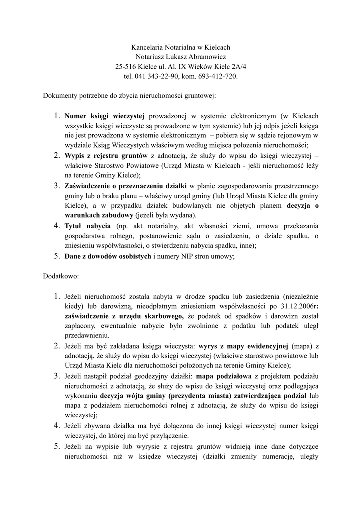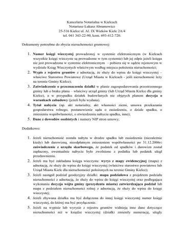 Kancelaria Notarialna w Kielcach Notariusz Łukasz Abramowicz 25-516 Kielce ul. Al. IX Wieków Kielc 2A/4 tel. 041 343-22-90, kom. 693-412-720. Dokumenty potrzebne do zbycia nieruchomości gruntowej: 1. Numer księgi wieczystej prowadzonej w systemie elektronicznym (w Kielcach 2. 3. 4. 5. wszystkie księgi wieczyste są prowadzone w tym systemie) lub jej odpis jeżeli księga nie jest prowadzona w systemie elektronicznym – pobiera się w sądzie rejonowym w wydziale Ksiąg Wieczystych właściwym według miejsca położenia nieruchomości; Wypis z rejestru gruntów z adnotacją, że służy do wpisu do księgi wieczystej – właściwe Starostwo Powiatowe (Urząd Miasta w Kielcach - jeśli nieruchomość leży na terenie Gminy Kielce); Zaświadczenie o przeznaczeniu działki w planie zagospodarowania przestrzennego gminy lub o braku planu – właściwy urząd gminy (lub Urząd Miasta Kielce dla gminy Kielce), a w przypadku działek budowlanych nie objętych planem decyzja o warunkach zabudowy (jeżeli była wydana). Tytuł nabycia (np. akt notarialny, akt własności ziemi, umowa przekazania gospodarstwa rolnego, postanowienie sądu o zasiedzeniu, o dziale spadku, o zniesieniu współwłasności, o stwierdzeniu nabycia spadku, inne); Dane z dowodów osobistych i numery NIP stron umowy; Dodatkowo: 1. Jeżeli nieruchomość została nabyta w drodze spadku lub zasiedzenia (niezależnie 2. 3. 4. 5. kiedy) lub darowizną, nieodpłatnym zniesieniem współwłasności po 31.12.2006r: zaświadczenie z urzędu skarbowego, że podatek od spadków i darowizn został zapłacony, ewentualnie nabycie było zwolnione z podatku lub podatek uległ przedawnieniu. Jeżeli ma być zakładana księga wieczysta: wyrys z mapy ewidencyjnej (mapa) z adnotacją, że służy do wpisu do księgi wieczystej (właściwe starostwo powiatowe lub Urząd Miasta Kielc dla nieruchomości położonych na terenie Gminy Kielce); Jeżeli nastąpił podział geodezyjny działki: mapa podziałowa z projektem podziału nieruchomości z adnotacją, że służy do wpisu do księgi wieczystej oraz podlegająca wykonaniu decyzja wójta gminy (prezydenta miasta) zatwierdzająca podział lub mapa z podziałem nieruchomości rolnej z adnotacją, że służy do wpisu do księgi wieczystej; Jeżeli zbywana działka ma być dołączona do innej księgi wieczystej numer księgi wieczystej, do której ma być przyłączenie. Jeżeli na wypisie lub wyrysie z rejestru gruntów widnieją inne dane dotyczące nieruchomości niż w księdze wieczystej (działki zmieniły numerację, uległy podziałowi, zmianie uległa ich powierzchnia) powinno być opisane, z czego wynikają te zmiany.