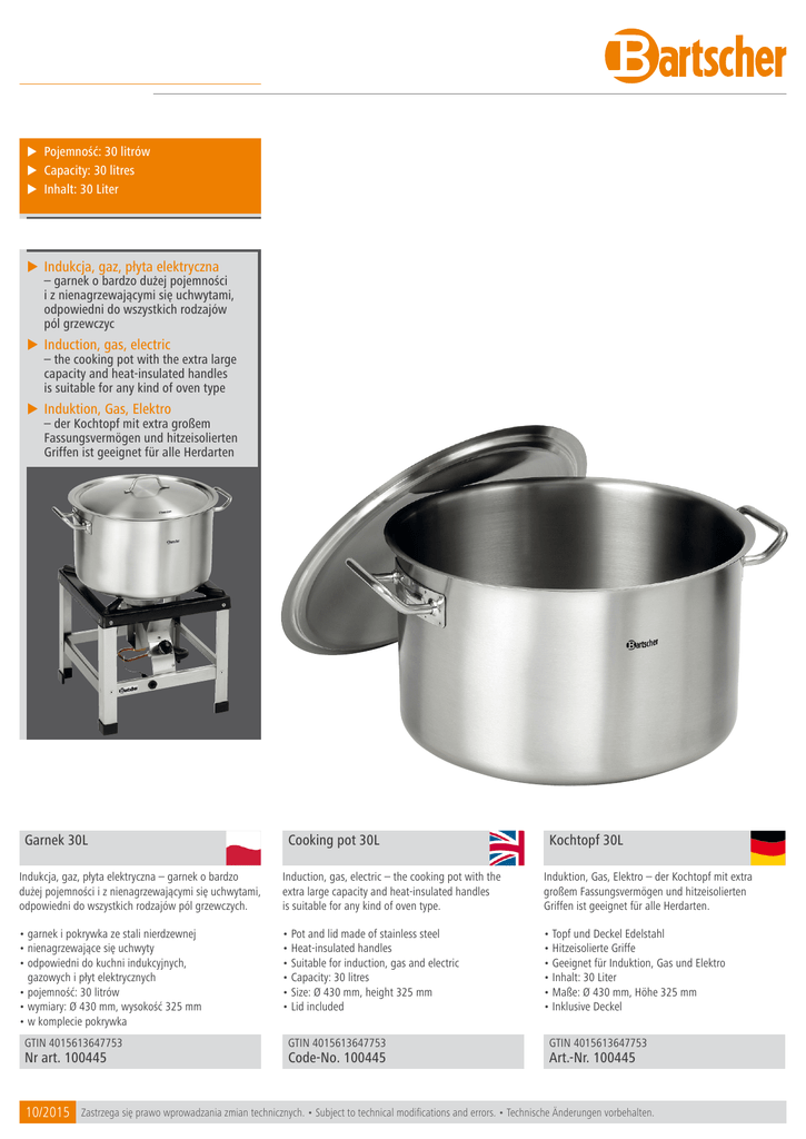 u Pojemność: 30 litrów u Capacity: 30 litres u Inhalt: 30 Liter u Indukcja, gaz, płyta elektryczna – garnek o bardzo dużej pojemności i z nienagrzewającymi się uchwytami, odpowiedni do wszystkich rodzajów pól grzewczyc u Induction, gas, electric – the cooking pot with the extra large capacity and heat-insulated handles is suitable for any kind of oven type u Induktion, Gas, Elektro – der Kochtopf mit extra großem Fassungsvermögen und hitzeisolierten Griffen ist geeignet für alle Herdarten Garnek 30L Cooking pot 30L Kochtopf 30L Indukcja, gaz, płyta elektryczna – garnek o bardzo dużej pojemności i z nienagrzewającymi się uchwytami, odpowiedni do wszystkich rodzajów pól grzewczych. Induction, gas, electric – the cooking pot with the extra large capacity and heat-insulated handles is suitable for any kind of oven type. Induktion, Gas, Elektro – der Kochtopf mit extra großem Fassungsvermögen und hitzeisolierten Griffen ist geeignet für alle Herdarten. • garnek i pokrywka ze stali nierdzewnej • nienagrzewające się uchwyty • odpowiedni do kuchni indukcyjnych, gazowych i płyt elektrycznych • pojemność: 30 litrów • wymiary: Ø 430 mm, wysokość 325 mm • w komplecie pokrywka • Pot and lid made of stainless steel • Heat-insulated handles • Suitable for induction, gas and electric • Capacity: 30 litres • Size: Ø 430 mm, height 325 mm • Lid included • Topf und Deckel Edelstahl • Hitzeisolierte Griffe • Geeignet für Induktion, Gas und Elektro • Inhalt: 30 Liter • Maße: Ø 430 mm, Höhe 325 mm • Inklusive Deckel GTIN 4015613647753 Nr art. 100445 10/2015 GTIN 4015613647753 Code-No. 100445 GTIN 4015613647753 Art.-Nr. 100445 Zastrzega się prawo wprowadzania zmian technicznych. • Subject to technical modifications and errors. • Technische Änderungen vorbehalten.