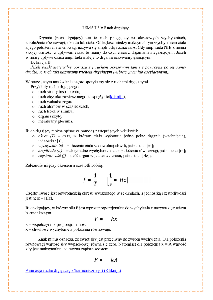 TEMAT 30: Ruch drgający. Drgania (ruch drgający) jest to ruch polegający na okresowych wychyleniach, z położenia równowagi, układu lub ciała. Odległość między maksymalnym wychyleniem ciała a jego położeniem równowagi nazywa się amplitudą i oznacza A. Gdy amplituda NIE zmienia swojej wartości z upływem czasu to mamy do czynieniea z drganiami niegasnącymi. Jeżeli w miarę upływu czasu amplituda maleje to drgania nazywamy gasnącymi. Definicja II: Jeżeli punkt materialny porusza się ruchem okresowym tam i z powrotem po tej samej drodze, to ruch taki nazywamy ruchem drgającym (wibracyjnym lub oscylacyjnym). W otaczającym nas świecie często spotykamy się z ruchami drgającymi. Przykłady ruchu drgającego: o ruch struny instrumentu, o ruch ciężarka zawieszonego na sprężynie(kliknij..), o ruch wahadła zegara, o ruch atomów w cząsteczkach, o ruch tłoka w silniku, o drgania szyby o membrany głośnika. Ruch drgający można opisać za pomocą następujących wielkości: o okres (T) – czas, w którym ciało wykonuje jedno pełne drganie (wachnięcie), jednostka: [s]; o wychylenie (x) – położenie ciała w dowolnej chwili, jednostka: [m]; o amplituda (A) – maksymalne wychylenie ciała z położenia równowagi, jednostka: [m]; o częstotliwość (f) – ilość drgań w jednostce czasu, jednostka: [Hz];. Zależność między okresem a częstotliwością: = 1 1 = Częstotliwość jest odwrotnością okresu wyrażonego w sekundach, a jednostką częstotliwości jest herc – [Hz]. Ruch drgający, w którym siła F jest wprost proporcjonalna do wychylenia x nazywa się ruchem harmonicznym. = − k – współczynnik proporcjonalności, x – chwilowe wychylenie z położenia równowagi. Znak minus oznacza, że zwrot siły jest przeciwny do zwrotu wychylenia. Dla położenia równowagi wartość siły wypadkowej równa się zero. Natomiast dla położenia x = A wartość siły jest maksymalna, co można zapisać wzorem: = − Animacja ruchu drgającego (harmonicznego) (Kliknij..) ZADANIA: 1. Oblicz amplitudę drgań obciążnika zawieszonego na sprężynie, jeżeli różnica pomiędzy najwyższym i najniższym skrajnym położeniem wynosi 20 cm. 2. Tętno człowieka średnio wynosi 80 razy na minutę. Jaka jest częstotliwość uderzeń serca? 3. Częstotliwość drgań wahadła wynosi 10 Hz. Ile wynosi okres drgań tego wahadła? 4. Dwa obciążniki zawieszono na dwóch sprężynach. Częstotliwość drgań obciążnika na pierwszej sprężynie wynosi 0,5 Hz, a okres drgań drugiego obciążnika wynosi 0,5 s. Oblicz ile drgań w ciągu minuty wykonuje każdy obciążnik. 5. Huśtające się dziecko wykonuje 10 pełnych wahnięć w ciągu 30 s. Ile wynosi okres drgań huśtawki?