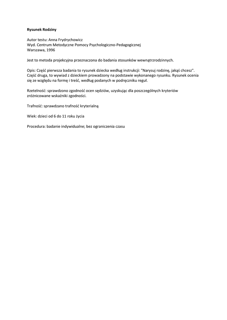 Rysunek Rodziny Autor testu: Anna Frydrychowicz Wyd. Centrum Metodyczne Pomocy Psychologiczno-Pedagogicznej Warszawa, 1996 Jest to metoda projekcyjna przeznaczona do badania stosunków wewnątrzrodzinnych. Opis: Część pierwsza badania to rysunek dziecka według instrukcji: "Narysuj rodzinę, jakąś chcesz". Część druga, to wywiad z dzieckiem prowadzony na podstawie wykonanego rysunku. Rysunek ocenia się ze względu na formę i treść, według podanych w podręczniku reguł. Rzetelność: sprawdzono zgodność ocen sędziów, uzyskując dla poszczególnych kryteriów zróżnicowane wskaźniki zgodności. Trafność: sprawdzano trafność kryterialną Wiek: dzieci od 6 do 11 roku życia Procedura: badanie indywidualne; bez ograniczenia czasu