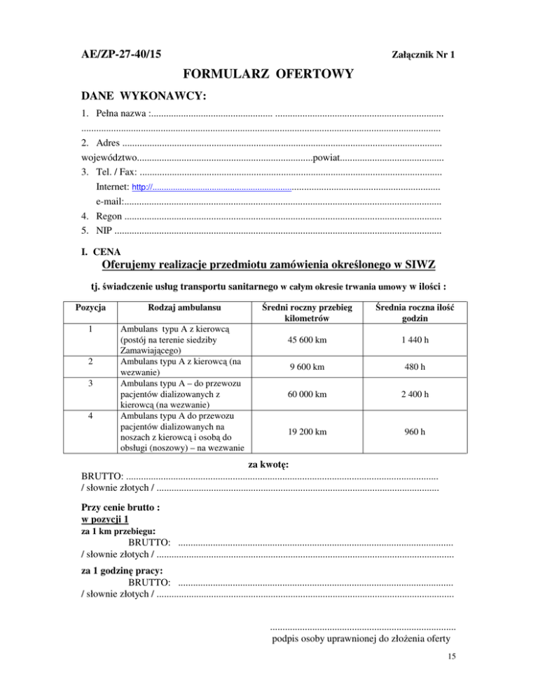 AE/ZP-27-40/15 Załącznik Nr 1 FORMULARZ OFERTOWY DANE WYKONAWCY: 1. Pełna nazwa :................................................. .................................................................... ................................................................................................................................................. 2. Adres ................................................................................................................................. województwo.......................................................................powiat.......................................... 3. Tel. / Fax: .......................................................................................................................... Internet: http://......................................................................................................................... e-mail:................................................................................................................................ 4. Regon ................................................................................................................................ 5. NIP .................................................................................................................................... I. CENA Oferujemy realizacje przedmiotu zamówienia określonego w SIWZ tj. świadczenie usług transportu sanitarnego w całym okresie trwania umowy w ilości : Pozycja Rodzaj ambulansu 1 Ambulans typu A z kierowcą (postój na terenie siedziby Zamawiającego) Ambulans typu A z kierowcą (na wezwanie) Ambulans typu A – do przewozu pacjentów dializowanych z kierowcą (na wezwanie) Ambulans typu A do przewozu pacjentów dializowanych na noszach z kierowcą i osobą do obsługi (noszowy) – na wezwanie 2 3 4 Średni roczny przebieg kilometrów Średnia roczna ilość godzin 45 600 km 1 440 h 9 600 km 480 h 60 000 km 2 400 h 19 200 km 960 h za kwotę: BRUTTO: .............................................................................................................................. / słownie złotych / .................................................................................................................. Przy cenie brutto : w pozycji 1 za 1 km przebiegu: BRUTTO: ............................................................................................................... / słownie złotych / ........................................................................................................................ za 1 godzinę pracy: BRUTTO: ............................................................................................................... / słownie złotych / ........................................................................................................................ ........................................................................... podpis osoby uprawnionej do złożenia oferty 15 w pozycji 2 za 1 km przebiegu: BRUTTO: ............................................................................................................... / słownie złotych / ........................................................................................................................ za 1 godzinę pracy: BRUTTO: ............................................................................................................... / słownie złotych / ........................................................................................................................ w pozycji 3 za 1 km przebiegu: BRUTTO: ............................................................................................................... / słownie złotych / ........................................................................................................................ za 1 godzinę pracy: BRUTTO: ............................................................................................................... / słownie złotych / ........................................................................................................................ w pozycji 4 za 1 km przebiegu: BRUTTO: ............................................................................................................... / słownie złotych / ........................................................................................................................ za 1 godzinę pracy: BRUTTO: ............................................................................................................... / słownie złotych / ........................................................................................................................ II. KSZTAŁTOWANIE SIĘ CEN W OKRESIE TRWANIA UMOWY 1. Cena brutto określona w punkcie I nie ulegnie zmianie przez okres obowiązywania umowy – nie dotyczy to zmian cen wynikających ze zmiany przepisów lub wprowadzonych drogą decyzji właściwych organów administracji państwowej, w tym zmiany stawki VAT. 2. Zmianę cen w oparciu o w/w przyczyny – Wykonawca udokumentuje III. OFEROWANE WARUNKI ROZLICZANIA SIĘ Z WYKONAWCĄ ZA ZREALIZOAWANE USŁUGI ZAMAWIAJĄCEGO 1. Termin zapłaty od dnia wystawienia faktury Zamawiającemu - ................................ dni (nie krótszy niż 30 dni). 2. Wysokość odsetek z tytułu nieterminowej zapłaty - ....................... w stosunku rocznym (nie wyższe niż ustawowe, w przypadku odsetek w wysokości aktualnie obowiązujących odsetek ustawowych należy wpisać „odsetki ustawowe”). 3. Część zamówienia, której wykonanie Wykonawca powierzy podwykonawcom (patrz oświadczenia pkt IV.4.1 SIWZ) ………………………………………………………… ……………………………………………………………………………………………… ……………………………………………………………………………………………… ................................................