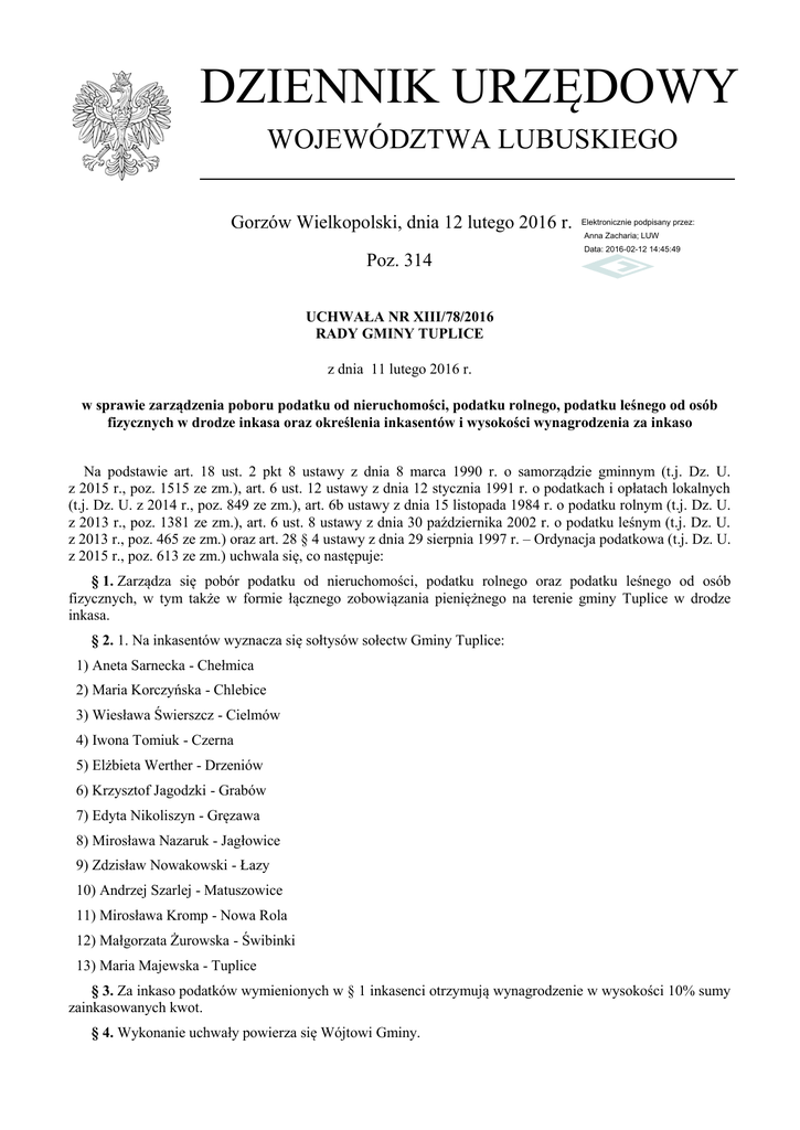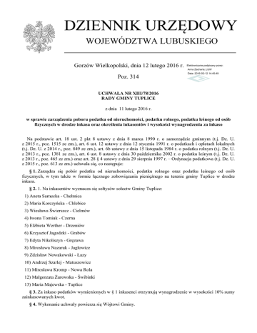 DZIENNIK URZĘDOWY WOJEWÓDZTWA LUBUSKIEGO Gorzów Wielkopolski, dnia 12 lutego 2016 r. Elektronicznie podpisany przez: Anna Zacharia; LUW Poz. 314 Data: 2016-02-12 14:45:49 UCHWAŁA NR XIII/78/2016 RADY GMINY TUPLICE z dnia 11 lutego 2016 r. w sprawie zarządzenia poboru podatku od nieruchomości, podatku rolnego, podatku leśnego od osób fizycznych w drodze inkasa oraz określenia inkasentów i wysokości wynagrodzenia za inkaso Na podstawie art. 18 ust. 2 pkt 8 ustawy z dnia 8 marca 1990 r. o samorządzie gminnym (t.j. Dz. U. z 2015 r., poz. 1515 ze zm.), art. 6 ust. 12 ustawy z dnia 12 stycznia 1991 r. o podatkach i opłatach lokalnych (t.j. Dz. U. z 2014 r., poz. 849 ze zm.), art. 6b ustawy z dnia 15 listopada 1984 r. o podatku rolnym (t.j. Dz. U. z 2013 r., poz. 1381 ze zm.), art. 6 ust. 8 ustawy z dnia 30 października 2002 r. o podatku leśnym (t.j. Dz. U. z 2013 r., poz. 465 ze zm.) oraz art. 28 § 4 ustawy z dnia 29 sierpnia 1997 r. – Ordynacja podatkowa (t.j. Dz. U. z 2015 r., poz. 613 ze zm.) uchwala się, co następuje: § 1. Zarządza się pobór podatku od nieruchomości, podatku rolnego oraz podatku leśnego od osób fizycznych, w tym także w formie łącznego zobowiązania pieniężnego na terenie gminy Tuplice w drodze inkasa. § 2. 1. Na inkasentów wyznacza się sołtysów sołectw Gminy Tuplice: 1) Aneta Sarnecka - Chełmica 2) Maria Korczyńska - Chlebice 3) Wiesława Świerszcz - Cielmów 4) Iwona Tomiuk - Czerna 5) Elżbieta Werther - Drzeniów 6) Krzysztof Jagodzki - Grabów 7) Edyta Nikoliszyn - Gręzawa 8) Mirosława Nazaruk - Jagłowice 9) Zdzisław Nowakowski - Łazy 10) Andrzej Szarlej - Matuszowice 11) Mirosława Kromp - Nowa Rola 12) Małgorzata Żurowska - Świbinki 13) Maria Majewska - Tuplice § 3. Za inkaso podatków wymienionych w § 1 inkasenci otrzymują wynagrodzenie w wysokości 10% sumy zainkasowanych kwot. § 4. Wykonanie uchwały powierza się Wójtowi Gminy. Dziennik Urzędowy Województwa Lubuskiego –2– Poz. 314 § 5. Traci moc uchwała Nr IV/19/2015 Rady Gminy Tuplice z dnia 24 lutego 2015 r. w sprawie zarządzenia poboru podatku od nieruchomości, podatku rolnego, podatku leśnego od osób fizycznych w drodze inkasa oraz określenia inkasentów i wysokości wynagrodzenia za inkaso, uchwała Nr VII/40/2015 Rady Gminy Tuplice z dnia 30 czerwca 2015 r. w sprawie wprowadzenia zmian w uchwale Nr IV/19/2015 Rady Gminy Tuplice z dnia 24 lutego 2015 r. w sprawie zarządzenia poboru podatku od nieruchomości, podatku rolnego, podatku leśnego od osób fizycznych w drodze inkasa oraz określenia inkasentów i wysokości wynagrodzenia za inkaso, a także uchwała Nr VIII/43/2015 Rady Gminy Tuplice z dnia 21 lipca 2015 r. w sprawie wprowadzenia zmian w uchwale Nr IV/19/2015 Rady Gminy Tuplice z dnia 24 lutego 2015 r. w sprawie zarządzenia poboru podatku od nieruchomości, podatku rolnego, podatku leśnego od osób fizycznych w drodze inkasa oraz określenia inkasentów i wysokości wynagrodzenia za inkaso. § 6. Uchwała wchodzi w życie po upływie 14 dni od dnia ogłoszenia w Dzienniku Urzędowym Województwa Lubuskiego. Przewodniczący Rady Sylwester Kazimierz Mazurkiewicz