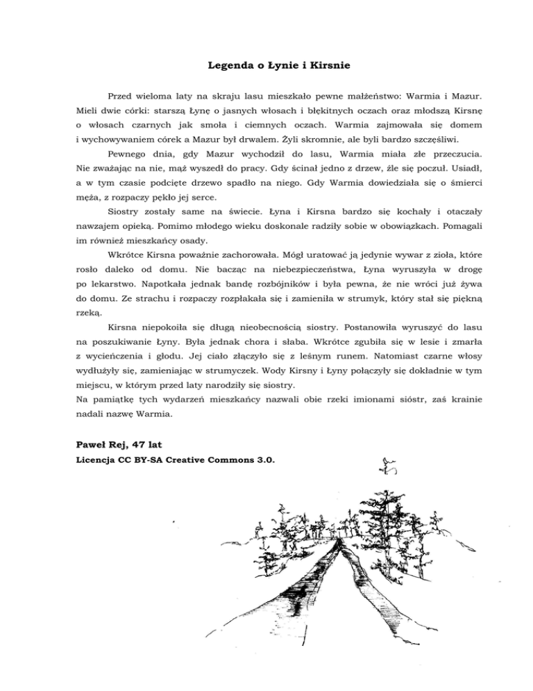 Legenda o Łynie i Kirsnie Przed wieloma laty na skraju lasu mieszkało pewne małżeństwo: Warmia i Mazur. Mieli dwie córki: starszą Łynę o jasnych włosach i błękitnych oczach oraz młodszą Kirsnę o włosach czarnych jak smoła i ciemnych oczach. Warmia zajmowała się domem i wychowywaniem córek a Mazur był drwalem. Żyli skromnie, ale byli bardzo szczęśliwi. Pewnego dnia, gdy Mazur wychodził do lasu, Warmia miała złe przeczucia. Nie zważając na nie, mąż wyszedł do pracy. Gdy ścinał jedno z drzew, źle się poczuł. Usiadł, a w tym czasie podcięte drzewo spadło na niego. Gdy Warmia dowiedziała się o śmierci męża, z rozpaczy pękło jej serce. Siostry zostały same na świecie. Łyna i Kirsna bardzo się kochały i otaczały nawzajem opieką. Pomimo młodego wieku doskonale radziły sobie w obowiązkach. Pomagali im również mieszkańcy osady. Wkrótce Kirsna poważnie zachorowała. Mógł uratować ją jedynie wywar z zioła, które rosło daleko od domu. Nie bacząc na niebezpieczeństwa, Łyna wyruszyła w drogę po lekarstwo. Napotkała jednak bandę rozbójników i była pewna, że nie wróci już żywa do domu. Ze strachu i rozpaczy rozpłakała się i zamieniła w strumyk, który stał się piękną rzeką. Kirsna niepokoiła się długą nieobecnością siostry. Postanowiła wyruszyć do lasu na poszukiwanie Łyny. Była jednak chora i słaba. Wkrótce zgubiła się w lesie i zmarła z wycieńczenia i głodu. Jej ciało złączyło się z leśnym runem. Natomiast czarne włosy wydłużyły się, zamieniając w strumyczek. Wody Kirsny i Łyny połączyły się dokładnie w tym miejscu, w którym przed laty narodziły się siostry. Na pamiątkę tych wydarzeń mieszkańcy nazwali obie rzeki imionami sióstr, zaś krainie nadali nazwę Warmia. Paweł Rej, 47 lat Licencja CC BY-SA Creative Commons 3.0.