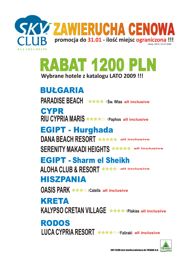 ZAWIERUCHA CENOWA promocja do 31.01 - ilość miejsc ograniczona !!! oferta: ZA12 / 01.01.2009 RABAT 1200 PLN Wybrane hotele z katalogu LATO 2009 !!! BUŁGARIA Św. Wlas all inclusive PARADISE BEACH CYPR Paphos all inclusive RIU CYPRIA MARIS EGIPT - Hurghada DANA BEACH RESORT SERENITY MAKADI HEIGHTS EGIPT - Sharm el Sheikh ALOHA CLUB & RESORT HISZPANIA Calella all inclusive OASIS PARK KRETA Plakias all inclusive KALYPSO CRETAN VILLAGE / / all inclusive DZIECKO 2-14 LAT all inclusive all inclusive / / RODOS LUCA CYPRIA RESORT / Faliraki all inclusive SKY CLUB jest marką należącą do TRIADA S.A. ZAWIERUCHA CENOWA promocja do 31.01 - ilość miejsc ograniczona !!! oferta: ZA12 / 01.01.2009 RABAT 1200 PLN Wybrane hotele z katalogu LATO 2009 !!! MAJORKA SIMAR / Cala San Vincente all inclusive MAROKO ROYAL DECAMERON TAFOUKT / Agadir all inclusive TURCJA- Riwiera Egejska Marmaris all inclusive PINETA CLUB DE LUX TURCJA- Riwiera Turecka HOLIDAY GARDEN RESORT / all inclusive TUNEZJA DELPHIN EL HABIB DELPHIN EXEL / Monastir / Hammamet all inclusive - Yasmine all inclusive ZAKHYNTOS ZANTE VILLAGE / Alykanas all inclusive SKY CLUB jest marką należącą do TRIADA S.A.