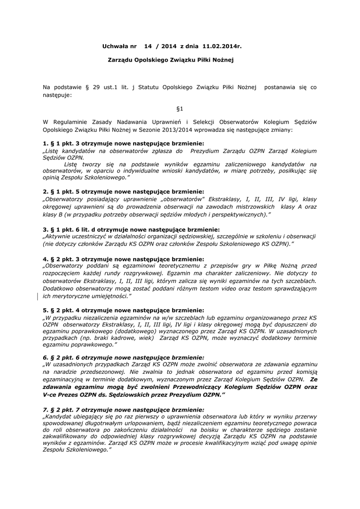 Uchwała nr 14 / 2014 z dnia 11.02.2014r. Zarządu Opolskiego