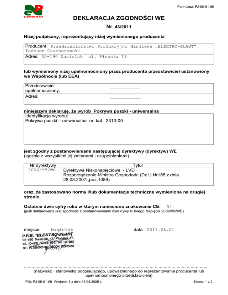 Formularz: PJ-06-01-06 DEKLARACJA ZGODNOŚCI WE Nr 43/2011 Niżej podpisany, reprezentujący niżej wymienionego producenta Producent: Przedsiębiorstwo Produkcyjno Handlowe „ELEKTRO-PLAST” Tadeusz Czachorowski Adres: 05-190 Nasielsk ul. Płońska 18 lub wymieniony niżej upełnomocniony przez producenta przedstawiciel ustanowiony we Wspólnocie (lub EEA) Przedstawiciel upełnomocniony: Adres: ___________ ___________ niniejszym deklaruję, że wyrób Pokrywa puszki - uniwersalna Identyfikacja wyrobu: Pokrywa puszki – uniwersalna nr. kat. 3313-00 jest zgodny z postanowieniami następującej dyrektywy (dyrektyw) WE (łącznie z wszystkimi jej zmianami i uzupełnieniami) Nr dyrektywy 2006/95/WE Tytuł Dyrektywa Niskonapięciowa - LVD Rozporządzenie Ministra Gospodarki (Dz.U.Nr155 z dnia 28.08.2007r,poz.1089) oraz, że zastosowano normy i/lub dokumentacje techniczne wymienione na drugiej stronie. Ostatnie dwie cyfry roku w którym naniesiono znakowanie CE: 04 (jeśli deklarowana jest zgodność z postanowieniami dyrektywy Niskiego Napięcia 2006/95/WE) miejsce Nasielsk data 2011.08.01 ............................................ (podpis) ................................................................................................................................................ (nazwisko i stanowisko podpisującego, upoważnionego do reprezentowania producenta lub upełnomocnionego przedstawiciela) Plik: PJ-06-01-06 Wydanie 3 z dnia 15.04.2005 r. Strona 1 z 2 Formularz: PJ-06-01-06 DEKLARACJA ZGODNOŚCI WE Nr 43/2011 Normy i/lub dokumentacje techniczne lub ich części zastosowane do wyrobu, którego dotyczy niniejsza deklaracja zgodności: - normy zharmonizowane: Nr Wydanie Tytuł Inne dokumenty nie występują Część*) - inne normy i/lub dokumentacje techniczne: Nr PN-E-93208 Wydanie 1997 Tytuł Puszki instalacyjne Część*) - inne rozwiązania techniczne, szczegóły, które zostały włączone do dokumentacji technicznej lub konstrukcyjnej: Pokrywa puszki – uniwersalna nr. kat. 3313-00 Inne dokumenty lub informacje wymagane właściwą dyrektywą (dyrektywami) WE: Inne dokumenty nie występują ................................................................................................................................................... ................................................................................................................................................... ................................................................................................................................................... ................................................................................................................................................... *) Należy wypełnić w przypadku powoływania się na części lub rozdziały normy lub dokumentacji technicznej Plik: PJ-06-01-06 Wydanie 3 z dnia 15.04.2005 r. Strona 2 z 2