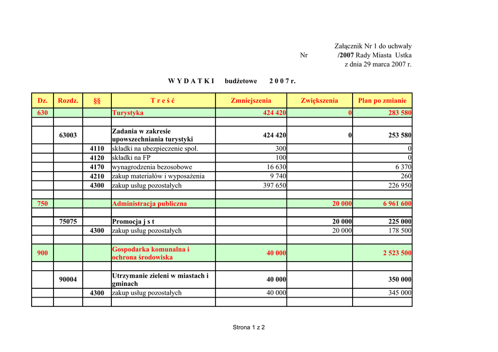 Nr WYDATKI Dz. Rozdz. §§ 630 Treść Turystyka 63003 4110 4120 4170 4210 4300 750 75075 4300 Zadania w zakresie upowszechniania turystyki składki na ubezpieczenie społ. składki na FP wynagrodzenia bezosobowe zakup materiałów i wyposażenia zakup usług pozostałych budżetowe 2 0 0 7 r. Zmniejszenia 90004 4300 Zwiększenia Plan po zmianie 424 420 0 283 580 424 420 0 253 580 300 100 16 630 9 740 397 650 0 0 6 370 260 226 950 Administracja publiczna 20 000 6 961 600 Promocja j s t zakup usług pozostałych 20 000 20 000 225 000 178 500 Gospodarka komunalna i ochrona środowiska 900 Załącznik Nr 1 do uchwały /2007 Rady Miasta Ustka z dnia 29 marca 2007 r. Utrzymanie zieleni w miastach i gminach zakup usług pozostałych Strona 1 z 2 40 000 2 523 500 40 000 350 000 40 000 345 000 Kultura i ochrona dziedzictwa narodowego 921 92120 4300 926 92604 4010 4110 4120 4210 4300 40 000 1 088 000 40 000 90 000 40 000 90 000 Kultura fizyczna i sport 404 420 1 021 620 Instytucje kultury fizycznej wynagrodzenia osobowe pracownikow składki na ubezp. społ. składki na FP zakup materiałów i wyposażenia zakup usług pozostałych 404 420 686 120 49 800 211 100 8 800 1 200 9 700 334 920 39 900 5 500 9 700 334 920 464 420 0 Ochrona zabytków i opieka nad zabytkami zakup usług pozostałych Ogółem: 464 420 Strona 2 z 2