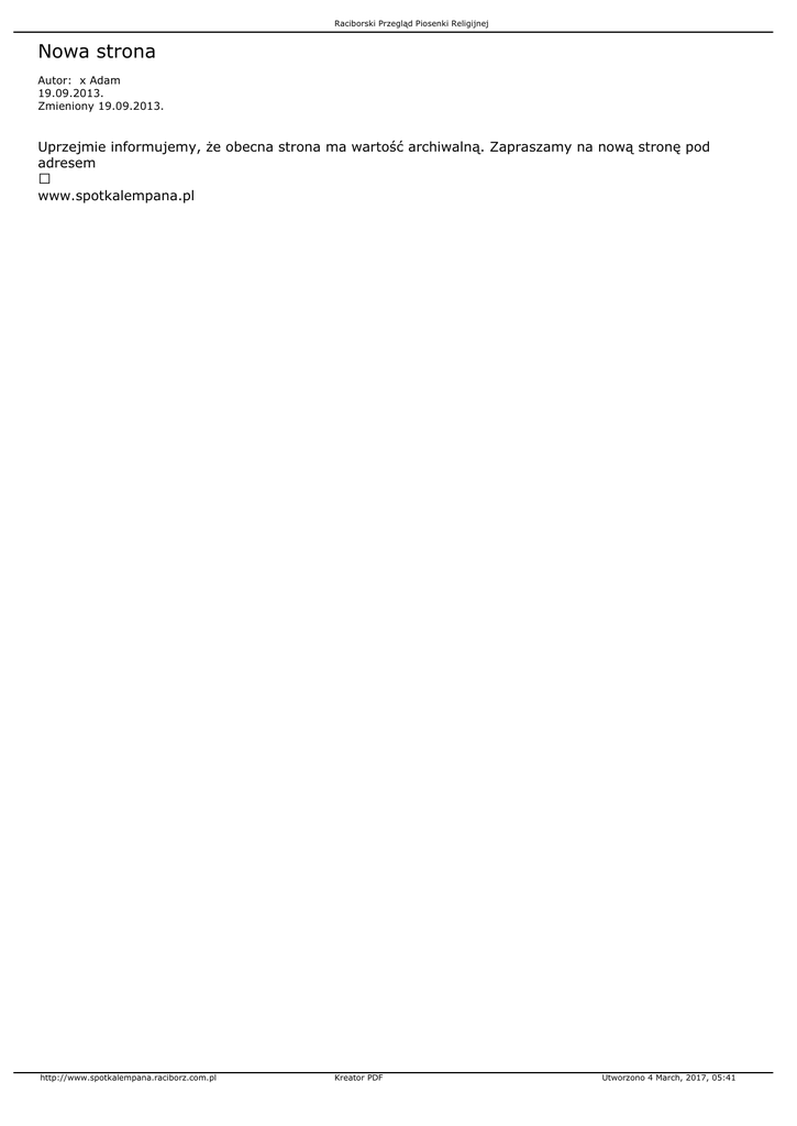 Raciborski Przegląd Piosenki Religijnej Nowa strona Autor: x Adam 19.09.2013. Zmieniony 19.09.2013. Uprzejmie informujemy, że obecna strona ma wartość archiwalną. Zapraszamy na nową stronę pod adresem www.spotkalempana.pl http://www.spotkalempana.raciborz.com.pl Kreator PDF Utworzono 4 March, 2017, 05:41