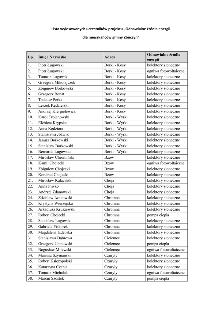 Lista wylosowanych uczestników projektu „Odnawialne źródła energii dla mieszkańców gminy Zbuczyn” Lp. Imię i Nazwisko Adres 1. 2. 3. 4. 5. 6. 7. 8. 9. 10. 11. 12. 13. 14. 15. 16. 17. 18. 19. 20. 21. 22. 23. 24. 25. 26. 27. 28. 29. 30. 31. 32. 33. 34. 35. 36. 37. 38. Piotr Ługowski Piotr Ługowski Tomasz Ługowski Grzegorz Mikołajczuk Zbigniew Borkowski Grzegorz Bonat Tadeusz Perka Leszek Kędzierski Andrzej Kiergielewicz Karol Trojanowski Elżbieta Krypska Anna Kędziora Stanisława Jóźwik Janusz Borkowski Stanisław Borkowski Bernarda Ługowska Mirosław Chromiński Kamil Chojecki Zbigniew Chojecki Kondrad Chojecki Mirosław Kalaciński Anna Piwko Andrzej Zdanowski Zdzisław Iwanowski Krystyna Wierzejska Arkadiusz Kruszewski Robert Chojecki Stanisław Ługowski Gabriela Piskorek Magdalena Izdebska Stanisława Dąbrowa Grzegorz Ułanowski Bogusław Milewski Mariusz Szymański Robert Księżopolski Katarzyna Czapla Tomasz Michalak Marcin Szostek Borki - Kosy Borki - Kosy Borki - Kosy Borki - Kosy Borki - Kosy Borki - Kosy Borki - Kosy Borki - Kosy Borki - Kosy Borki - Wyrki Borki - Wyrki Borki - Wyrki Borki - Wyrki Borki - Wyrki Borki - Wyrki Borki - Wyrki Bzów Bzów Bzów Bzów Choja Choja Choja Chromna Chromna Chromna Chromna Chromna Chromna Chromna Cielemęc Cielemęc Cielemęc Czuryły Czuryły Czuryły Czuryły Czuryły Odnawialne źródła energii kolektory słoneczne ogniwa fotowoltaiczne kolektory słoneczne kolektory słoneczne kolektory słoneczne kolektory słoneczne kolektory słoneczne kolektory słoneczne kolektory słoneczne kolektory słoneczne kolektory słoneczne kolektory słoneczne kolektory słoneczne kolektory słoneczne kolektory słoneczne kolektory słoneczne kolektory słoneczne ogniwa fotowoltaiczne kolektory słoneczne kolektory słoneczne kolektory słoneczne kolektory słoneczne kolektory słoneczne kolektory słoneczne kolektory słoneczne kolektory słoneczne pompa ciepła kolektory słoneczne kolektory słoneczne kolektory słoneczne kolektory słoneczne pompa ciepła ogniwa fotowoltaiczne kolektory słoneczne kolektory słoneczne kolektory słoneczne ogniwa fotowoltaiczne pompa ciepła 39. 40. 41. 42. 43. 44. 45. 46. 47. 48. 49. 50. 51. 52. 53. 54. 55. 56. 57. 58. 59. 60. 61. 62. 63. 64. 65. 66. 67. 68. 69. 70. 71. 72. 73. 74. 75. 76. 77. 78. 79. 80. 81. 82. 83. Jarosław Chromiński Zbigniew Celiński Łukasz Ziarek Dariusz Przeździak Paweł Borkowski Bogusława Grodzicka Grzegorz Chromiński Marta Dorosz Tomasz Nowosielski Andrzej Okniński Kamil Próżanin Marek Pietruszewski Andrzej Chromiński Dariusz Prochenka Jarosław Prochenka Bożena Jankowska Wiesław Koziestański Mariusz Jastrzębski Mirosław Marczuk Barbara Kędziora Tadeusz Grodzicki Marek Borkowski Halina Bierkat Agnieszka Karczewska Grzegorz Chromiński Marek Furman Mirosław Grochowski Kamil Nowosielski Cezary Grochowski Krzysztof Grochowski Wiesław Krasuski Agata Grochowska Grzegorz Wróbel Ryszard Dziewulski Paweł Wysokiński Łukasz Gawinkowski Ireneusz Sobiczewski Janusz Ługowski Andrzej Radzikowski Sławomir Głuchowski Maria Wysokińska Małgorzata Gorzkowska Mirosław Michalak Zenon Zbieć Piotr Wysokiński Czuryły Dziewule Dziewule Dziewule Dziewule Dziewule Dziewule Dziewule Dziewule Dziewule Dziewule Dziewule Dziewule Dziewule Dziewule Dziewule Dziewule Dziewule Dziewule Dziewule Dziewule Dziewule Dziewule Dziewule Dziewule Dziewule Grochówka Grochówka Grochówka Grochówka Grochówka Grochówka Grodzisk Grodzisk Grodzisk Grodzisk Izdebki - Błażeje Izdebki - Błażeje Izdebki - Błażeje Izdebki - Błażeje Izdebki - Kośmidry Izdebki - Kośmidry Izdebki - Kośmidry Izdebki - Kośmidry Izdebki Kosny ogniwa fotowoltaiczne kolektory słoneczne kolektory słoneczne kolektory słoneczne kolektory słoneczne kolektory słoneczne kolektory słoneczne kolektory słoneczne kolektory słoneczne ogniwa fotowoltaiczne pompa ciepła kolektory słoneczne kolektory słoneczne kolektory słoneczne kolektory słoneczne kolektory słoneczne kolektory słoneczne kolektory słoneczne kolektory słoneczne kolektory słoneczne kolektory słoneczne kolektory słoneczne kolektory słoneczne kolektory słoneczne kolektory słoneczne kolektory słoneczne kolektory słoneczne ogniwa fotowoltaiczne kolektory słoneczne kolektory słoneczne kolektory słoneczne kolektory słoneczne ogniwa fotowoltaiczne kolektory słoneczne kolektory słoneczne pompa ciepła ogniwa fotowoltaiczne kolektory słoneczne ogniwa fotowoltaiczne kolektory słoneczne kolektory słoneczne kolektory słoneczne kolektory słoneczne kolektory słoneczne kolektory słoneczne 84. 85. 86. 87. 88. 89. 90. 91. 92. 93. 94. 95. 96. 97. 98. Krzysztof Jerzykowski Marek Marczak Stanisław Kędzierski Waldemar Siwiak Grzegorz Krasuski Dorota Kędzierska Michał Krasuski Marcin Jasiński Artur Dziewulski Irena Moskwiak Tomasz Orzyłowski Adam Wiszniewski Roman Jaszczuk Anna Zielińska Adrian Chromiński Januszówka Januszówka Januszówka Januszówka Januszówka Januszówka Jasionka Jasionka Jasionka Jasionka Jasionka Jasionka Karcze Karcze Karcze kolektory słoneczne kolektory słoneczne pompa ciepła pompa ciepła pompa ciepła pompa ciepła kolektory słoneczne kolektory słoneczne kolektory słoneczne kolektory słoneczne kolektory słoneczne kolektory słoneczne kolektory słoneczne kolektory słoneczne pompa ciepła 99. Karol Cisak Krzesk - Królowa Niwa kolektory słoneczne 100. 101. 102. 103. 104. 105. 106. 107. 108. 109. 110. 111. 112. 113. 114. 115. 116. 117. 118. 119. 120. 121. 122. 123. 124. 125. 126. 127. 128. Mirosław Dziedzic Jan Gochnio Krzysztof Krypa Dorota Wawrzyszczuk Stanisław Golec Lech Duda Jadwiga Radzikowska Maciej Gładkowski Andrzej Pogonowski Wiesław Mamcarz Krzysztof Grodzicki Mariusz Mikołajczuk Robert Lipiński Andrzej Marczak Piotr Ignatowicz Zbigniew Jasiński Michał Krasuski Andrzej Młynarz Iwona Szaniawska Henryk Borkowski Wiesław Ługowski Wojciech Ługowski Zbigniew Nowosielsk