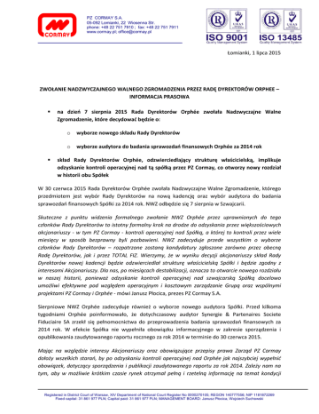 PZ CORMAY S.A. 05-092 Lomianki, 22 Wiosenna Str. phone: +48 22 751 7910 ; fax: +48 22 751 7911 www.cormay.pl; [email protected] Łomianki, 1 lipca 2015 ZWOŁANIE NADZWYCZAJNEGO WALNEGO ZGROMADZENIA PRZEZ RADĘ DYREKTORÓW ORPHEE – INFORMACJA PRASOWA na dzień 7 sierpnia 2015 Rada Dyrektorów Orphée zwołała Nadzwyczajne Walne Zgromadzenie, które decydować będzie o: o wyborze nowego składu Rady Dyrektorów o wyborze audytora do badania sprawozdań finansowych Orphée za 2014 rok skład Rady Dyrektorów Orphée, odzwierciedlający strukturę właścicielską, implikuje odzyskanie kontroli operacyjnej nad tą spółką przez PZ Cormay, co otworzy nowy rozdział w historii obu Spółek W 30 czerwca 2015 Rada Dyrektorów Orphée zwołała Nadzwyczajne Walne Zgromadzenie, którego przedmiotem jest wybór Rady Dyrektorów na nową kadencję oraz wybór audytora do badania sprawozdań finansowych Spółki za 2014 rok. NWZ odbędzie się 7 sierpnia w Szwajcarii. Skuteczne z punktu widzenia formalnego zwołanie NWZ Orphée przez uprawnionych do tego członków Rady Dyrektorów to istotny formalny krok na drodze do odzyskania przez większościowych akcjonariuszy - w tym PZ Cormay - kontroli operacyjnej nad Spółką, a której to kontroli przez wiele miesięcy w sposób bezprawny byli pozbawieni. NWZ zadecyduje przede wszystkim o wyborze członków Rady Dyrektorów – rozpatrzone zostaną kandydatury zgłoszone zarówno przez obecną Radę Dyrektorów, jak i przez TOTAL FIZ. Wierzymy, że w wyniku decyzji akcjonariuszy skład Rady Dyrektorów nowej kadencji będzie odzwierciedlał strukturę właścicielską Spółki i będzie zgodny z interesami Akcjonariuszy. Dla nas, po miesiącach destabilizacji, oznacza to otwarcie nowego rozdziału w naszej historii, ponieważ odzyskanie kontroli operacyjnej nad szwajcarską Spółką docelowo umożliwi efektywne pod względem operacyjnym i kosztowym zarządzanie Grupą oraz wspólnymi projektami PZ Cormay i Orphée - mówi Janusz Płocica, prezes PZ Cormay S.A. Sierpniowe NWZ Orphée zadecyduje również o wyborze nowego audytora Spółki. Przed kilkoma tygodniami Orphée poinformowało, że dotychczasowy audytor Synergie & Partenaires Societe Fiduciaire SA zrzekł się pełnomocnictwa do przeprowadzenia badania sprawozdań finansowych za 2014 rok. W efekcie Spółka nie wypełniła obowiązku informacyjnego w zakresie sporządzenia i opublikowania zaudytowanego raportu rocznego za rok 2014 w terminie do 30 czerwca 2015. Mając na względzie interesy Akcjonariuszy oraz obowiązujące przepisy prawa Zarząd PZ Cormay dołoży wszelkich starań, by po odzyskaniu kontroli operacyjnej nad Orphée jak najszybciej wypełnić obowiązek, dotyczący sporządzenia i publikacji zaudytowanego raportu za rok 2014. Zależy nam na tym, aby w możliwie krótkim czasie rynek otrzymał pełną i rzetelną informację na temat kondycji Registered in District Court of Warsaw, XIV Department of National Court Register No 0000270105; REGON 140777556; NIP 1181872269 Fixed capital: 31 861 977 PLN; Capital paid: 31 861 977 PLN; MANAGEMENT BOARD: Janusz Płocica, Wojciech Suchowski finansowej Orphée. Naszą intencją jest tym samym doprowadzenie do ograniczenia ewentualnych sankcji przewidzianej za naruszenie przepisów– tłumaczy Janusz Płocica. dodatkowych informacji udziela: Katarzyna Sadowska CC Group Sp. z o.o. Telefon: +48 22 440 14 40 Mobile: +48 697 613 020 *** Grupa PZ Cormay to notowany na Giełdzie Papierów Wartościowych w Warszawie producent i dystrybutor najwyższej klasy odczynników diagnostycznych oraz aparatury medycznej. Produkuje i sprzedaje testy diagnostyczne dla chemii klinicznej, hematologii, koagulologii, immunologii. W swojej ofercie posiada automatyczne analizatory biochemiczne, hematologiczne oraz immunologiczne. Oferuje w pełni zautomatyzowane systemy do analizy parazytologicznej, a także próżniowy system pobierania krwi. Grupa PZ Cormay oferuje swoje produkty pod cenionymi markami PZ Cormay, Orphée (Szwajcaria), Audit Diagnostics (Irlandia) oraz Diesse (Włochy). Innowacyjność Grupy PZ Cormay wspiera doświadczony, międzynarodowy zespół badawczo-rozwojowy, a jej produkty są eksportowane do ponad 150 krajów świata. Registered in District Court of Warsaw, XIV Department of National Court Register No 0000270105; REGON 140777556; NIP 1181872269 Fixed capital: 31 861 977 PLN; Capital paid: 31 861 977 PLN; MANAGEMENT BOARD: Janusz Płocica, Wojciech Suchowski