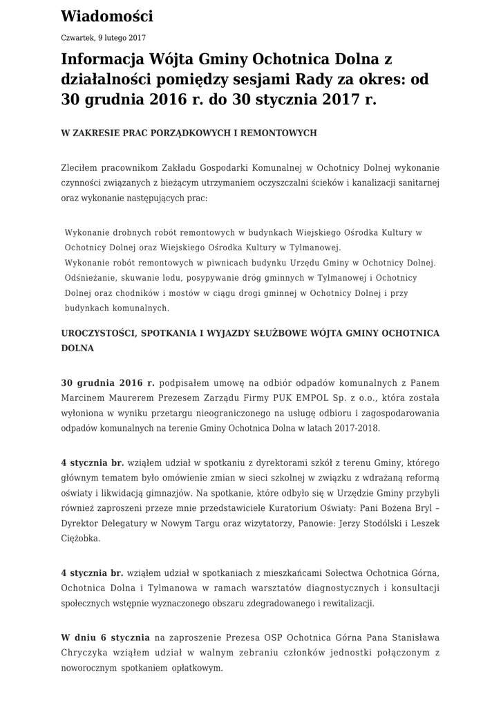 Wiadomości Czwartek, 9 lutego 2017 Informacja Wójta Gminy Ochotnica Dolna z działalności pomiędzy sesjami Rady za okres: od 30 grudnia 2016 r. do 30 stycznia 2017 r. W ZAKRESIE PRAC PORZĄDKOWYCH I REMONTOWYCH Zleciłem pracownikom Zakładu Gospodarki Komunalnej w Ochotnicy Dolnej wykonanie czynności związanych z bieżącym utrzymaniem oczyszczalni ścieków i kanalizacji sanitarnej oraz wykonanie następujących prac: Wykonanie drobnych robót remontowych w budynkach Wiejskiego Ośrodka Kultury w Ochotnicy Dolnej oraz Wiejskiego Ośrodka Kultury w Tylmanowej. Wykonanie robót remontowych w piwnicach budynku Urzędu Gminy w Ochotnicy Dolnej. Odśnieżanie, skuwanie lodu, posypywanie dróg gminnych w Tylmanowej i Ochotnicy Dolnej oraz chodników i mostów w ciągu drogi gminnej w Ochotnicy Dolnej i przy budynkach komunalnych. UROCZYSTOŚCI, SPOTKANIA I WYJAZDY SŁUŻBOWE WÓJTA GMINY OCHOTNICA DOLNA 30 grudnia 2016 r. podpisałem umowę na odbiór odpadów komunalnych z Panem Marcinem Maurerem Prezesem Zarządu Firmy PUK EMPOL Sp. z o.o., która została wyłoniona w wyniku przetargu nieograniczonego na usługę odbioru i zagospodarowania odpadów komunalnych na terenie Gminy Ochotnica Dolna w latach 2017-2018. 4 stycznia br. wziąłem udział w spotkaniu z dyrektorami szkół z terenu Gminy, którego głównym tematem było omówienie zmian w sieci szkolnej w związku z wdrażaną reformą oświaty i likwidacją gimnazjów. Na spotkanie, które odbyło się w Urzędzie Gminy przybyli również zaproszeni przeze mnie przedstawiciele Kuratorium Oświaty: Pani Bożena Bryl – Dyrektor Delegatury w Nowym Targu oraz wizytatorzy, Panowie: Jerzy Stodólski i Leszek Ciężobka. 4 stycznia br. wziąłem udział w spotkaniach z mieszkańcami Sołectwa Ochotnica Górna, Ochotnica Dolna i Tylmanowa w ramach warsztatów diagnostycznych i konsultacji społecznych wstępnie wyznaczonego obszaru zdegradowanego i rewitalizacji. W dniu 6 stycznia na zaproszenie Prezesa OSP Ochotnica Górna Pana Stanisława Chryczyka wziąłem udział w walnym zebraniu członków jednostki połączonym z noworocznym spotkaniem opłatkowym. W dniu 8 stycznia zorganizowałem pierwsze spotkanie dotyczące planowanej budowy wyciągów narciarskich w Ochotnicy Górnej. Na spotkanie, które miało miejsce w Wiejskim Ośrodku Kultury w Ochotnicy Górnej przybyli potencjalni inwestorzy, mieszkańcy, firmy, osoby prywatne. 13 stycznia spotkałem się z zawodnikami i działaczami prężnie działającego i osiągającego sukcesy Motocyklowego Klubu Sportowego MKS TRIAL Ochotnica. Podczas spotkania przedstawiciele klubu podziękowali za okazane wsparcie finansowe w sezonie 2016, dzięki któremu klubowi udało się wywalczyć III miejsce w Pucharze Polski w trialu motocyklowym. 12 stycznia br. uczestniczyłem w spotkaniu Rady Sołeckiej Sołectwa Tylmanowa 14 stycznia wziąłem udział w Opłatku Noworocznym Strażaków OSP w Ochotnicy Dolnej 15 stycznia uczestniczyłem w Spotkaniu Opłatkowym dla osób starszych zorganizowanym przez księży z Parafii pw. Znalezienia Krzyża Świętego w Ochotnicy Dolnej, Caritas przy współpracy WOK w Ochotnicy Dolnej 15 stycznia wziąłem udział w Spotkaniu Opłatkowym Gorczańskiego Oddziału Związku Podhalan i Koła Gospodyń Wiejskich w Ochotnicy Górnej 17 stycznia uczestniczyłem w Spotkaniu Noworocznym w Zakopanem z Marszałkiem Województwa Małopolskiego Panem Jackiem Krupą. 18 stycznia wziąłem udział w przedstawieniu „W Aniołowie” przygotowanym przez uczniów Ośrodka Rehabilitacyjno – Edukacyjno –Wychowawczego oraz Szkoły Przysposabiającej do Pracy w Ochotnicy Dolnej, które miało miejsce w Wiejskim Ośrodku Kultury w Ochotnicy Dolnej. 21 stycznia br. uczestniczyłem uw tradycyjnym Opłatku Związku Podhalan Oddziału w Tylmanowej 22 stycznia br. wziąłem udział w obchodach 5-lecia istnienia Radia RDN Nowy Sącz 23 i 25 stycznia uczestniczyłem w spotkaniu z P. Robertem Waniczkiem Dyrektorem Powiatowego Zarządu Dróg w Nowym Targu, podczas którego omówiony został projekt koncepcyjny budowy chodników oraz została podjęta decyzja o wyborze wariantu do dalszego opracowania. W efekcie podpisanego przeze mnie porozumienia wiosnę ruszą prace przy budowie dwóch nowych odcinków chodników dla pieszych na terenie Gminy Ochotnica Dolna. 24 stycznia wziąłem udział w spotkaniu w Centrum Energetyki AGH w Krakowie, dotyczącym uczestnictwa Gminy Ochotnica Dolna w pilotażowym programie powstania na terenie Gminy nowoczesnego bilansowania energii w ramach Klastra Energii „Zielone Podhale”. 28 stycznia uczestniczyłem w Walnym Zebraniu Sprawozdawczym Zarządu OSP Tylmanowa 29 stycznia br. wziąłem udział w uroczystościach Jubileuszu 25-lecia powstania Związku Podhalan w Ochotnicy Dolnej połączonych ze spotkaniem opłatkowym W ZAKRESIE POMOCY SPOŁECZNEJ Na bieżąco realizuję zadania w ramach ustawy o pomocy społecznej (wywiady środowiskowe na wniosek stron i z urzędu, praca socjalna, pomoc w sporządzaniu pism do sądu , organów rentowych, administracyjnych itp., rozliczanie i bieżąca kontrola wydawanych posiłków w szkołach, sporządzanie analiz, sprawozdań, zapotrzebowań finansowych na realizację świadczeń, wydawanie zaświadczeń). Planowana wypłata świadczeń w styczniu: Zasiłek z programu pomoc państwa w zakresie dożywiania - 9 osób na kwotę 3.167,00zł Finansowanie posiłków w szkołach dla 149 uczniów Zasiłek okresowy – 14 osób na kwotę 9.095,87zł Zasiłki celowe - 21 osób na kwotę 9.650,00 zł Zasiłki stałe – 17 osób na kwotę 8.294,89zł Zapłacono odpłatność za pobyt w Domach Pomocy Społecznej - 3 osoby odpłatność 7.409,19zł Na bieżąco realizuję świadczenia rodzinne, alimentacyjne, dodatki mieszkaniowe i energetyczne oraz świadczenia wychowawcze (realizacja nowych wniosków, przygotowywanie na ich podstawie decyzji, zmiany decyzji, współpraca z ROPS, ZUS, KRUS, US, sporządzanie miesięczny