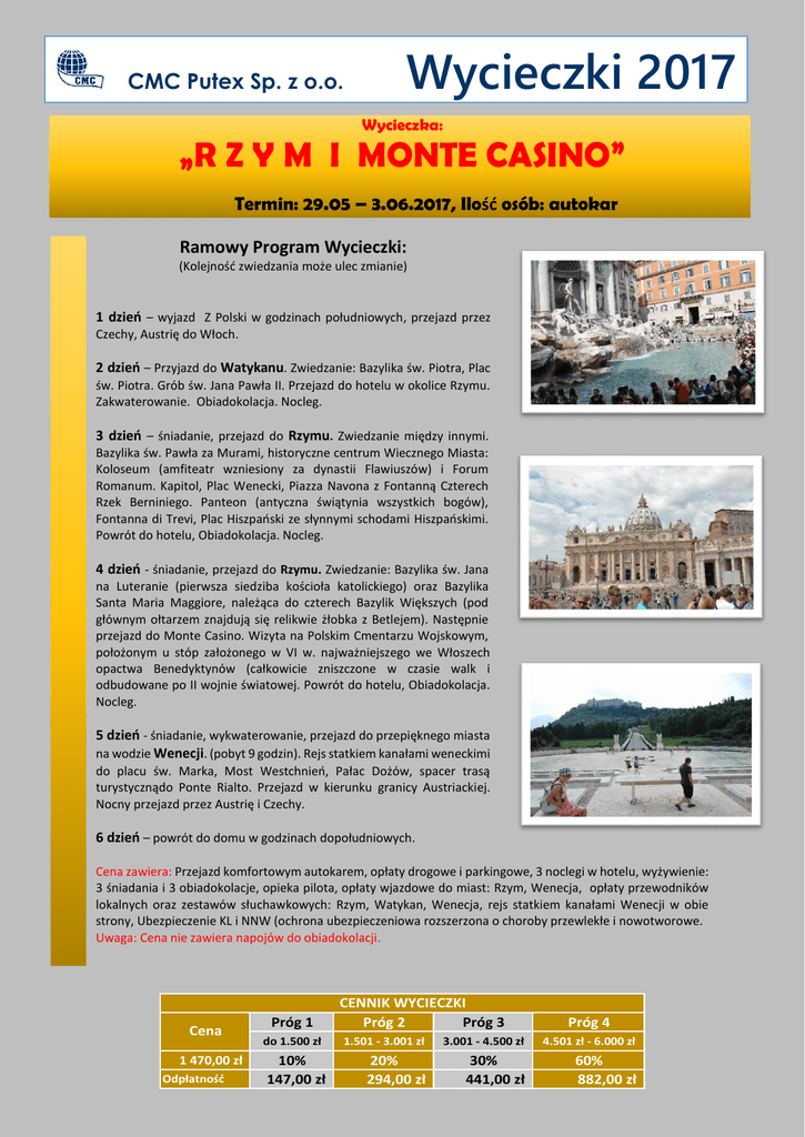 Wycieczki 2017 Wycieczki Ogólnozakładowe CMC Zawiercie SA CMC Putex Sp. z o.o. Wycieczka: „R Z Y M I MONTE CASINO” Termin: 29.05 – 3.06.2017, Ilość osób: autokar Ramowy Program Wycieczki: (Kolejność zwiedzania może ulec zmianie) 1 dzień – wyjazd Z Polski w godzinach południowych, przejazd przez Czechy, Austrię do Włoch. 2 dzień – Przyjazd do Watykanu. Zwiedzanie: Bazylika św. Piotra, Plac św. Piotra. Grób św. Jana Pawła II. Przejazd do hotelu w okolice Rzymu. Zakwaterowanie. Obiadokolacja. Nocleg. 3 dzień – śniadanie, przejazd do Rzymu. Zwiedzanie między innymi. Bazylika św. Pawła za Murami, historyczne centrum Wiecznego Miasta: Koloseum (amfiteatr wzniesiony za dynastii Flawiuszów) i Forum Romanum. Kapitol, Plac Wenecki, Piazza Navona z Fontanną Czterech Rzek Berniniego. Panteon (antyczna świątynia wszystkich bogów), Fontanna di Trevi, Plac Hiszpański ze słynnymi schodami Hiszpańskimi. Powrót do hotelu, Obiadokolacja. Nocleg. 4 dzień - śniadanie, przejazd do Rzymu. Zwiedzanie: Bazylika św. Jana na Luteranie (pierwsza siedziba kościoła katolickiego) oraz Bazylika Santa Maria Maggiore, należąca do czterech Bazylik Większych (pod głównym ołtarzem znajdują się relikwie żłobka z Betlejem). Następnie przejazd do Monte Casino. Wizyta na Polskim Cmentarzu Wojskowym, położonym u stóp założonego w VI w. najważniejszego we Włoszech opactwa Benedyktynów (całkowicie zniszczone w czasie walk i odbudowane po II wojnie światowej. Powrót do hotelu, Obiadokolacja. Nocleg. 5 dzień - śniadanie, wykwaterowanie, przejazd do przepięknego miasta na wodzie Wenecji. (pobyt 9 godzin). Rejs statkiem kanałami weneckimi do placu św. Marka, Most Westchnień, Pałac Dożów, spacer trasą turystycznądo Ponte Rialto. Przejazd w kierunku granicy Austriackiej. Nocny przejazd przez Austrię i Czechy. 6 dzień – powrót do domu w godzinach dopołudniowych. Cena zawiera: Przejazd komfortowym autokarem, opłaty drogowe i parkingowe, 3 noclegi w hotelu, wyżywienie: 3 śniadania i 3 obiadokolacje, opieka pilota, opłaty wjazdowe do miast: Rzym, Wenecja, opłaty przewodników lokalnych oraz zestawów słuchawkowych: Rzym, Watykan, Wenecja, rejs statkiem kanałami Wenecji w obie strony, Ubezpieczenie KL i NNW (ochrona ubezpieczeniowa rozszerzona o choroby przewlekłe i nowotworowe. Uwaga: Cena nie zawiera napojów do obiadokolacji. Cena 1 470,00 zł Odpłatność Próg 1 do 1.500 zł 10% 147,00 zł CENNIK WYCIECZKI Próg 2 Próg 3 Próg 4 1.501 - 3.001 zł 3.001 - 4.500 zł 4.501 zł - 6.000 zł 20% 294,00 zł 30% 441,00 zł 60% 882,00 zł