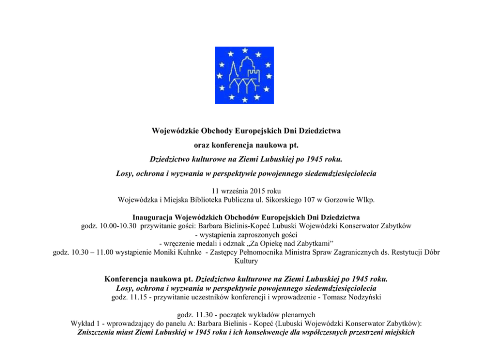 Wojewódzkie Obchody Europejskich Dni Dziedzictwa oraz konferencja naukowa pt. Dziedzictwo kulturowe na Ziemi Lubuskiej po 1945 roku. Losy, ochrona i wyzwania w perspektywie powojennego siedemdziesięciolecia 11 września 2015 roku Wojewódzka i Miejska Biblioteka Publiczna ul. Sikorskiego 107 w Gorzowie Wlkp. Inauguracja Wojewódzkich Obchodów Europejskich Dni Dziedzictwa godz. 10.00-10.30 przywitanie gości: Barbara Bielinis-Kopeć Lubuski Wojewódzki Konserwator Zabytków - wystąpienia zaproszonych gości - wręczenie medali i odznak „Za Opiekę nad Zabytkami” godz. 10.30 – 11.00 wystąpienie Moniki Kuhnke - Zastępcy Pełnomocnika Ministra Spraw Zagranicznych ds. Restytucji Dóbr Kultury Konferencja naukowa pt. Dziedzictwo kulturowe na Ziemi Lubuskiej po 1945 roku. Losy, ochrona i wyzwania w perspektywie powojennego siedemdziesięciolecia godz. 11.15 - przywitanie uczestników konferencji i wprowadzenie - Tomasz Nodzyński godz. 11.30 - początek wykładów plenarnych Wykład 1 - wprowadzający do panelu A: Barbara Bielinis - Kopeć (Lubuski Wojewódzki Konserwator Zabytków): Zniszczenia miast Ziemi Lubuskiej w 1945 roku i ich konsekwencje dla współczesnych przestrzeni miejskich Wykład 2 - wprowadzający do panelu B: Czesław Osękowski (Uniwersytet Zielonogórski): Bariery akceptacji przez polskich osadników dziedzictwa kulturowego zastanego na Ziemi Lubuskiej po 1945 roku Wykład 3 - wprowadzający do panelu C - Beata Halicka (Polsko-Niemiecki Instytut Badawczy w Słubicach): „Polski Dziki Zachód”. Początki życia społecznego na obszarze Nadodrza w 1945 roku godz. 12. 30- 13.00 – przerwa na kawę godz. 13.00 - do 17.00 Równoległe panele tematyczne oraz dyskusje: Panel A: Losy dziedzictwa materialnego Panel B: Kreowanie tożsamości wokół dziedzictwa Panel C: Powojenne życie społeczne i kulturalne Przerwa obiadowa w godzinach 14.00 - 14.30 Panel A: Losy dziedzictwa materialnego Czas wykładów 15 min. Zbigniew Bujkiewicz Baza lokalowa szkolnictwa polskiego na Ziemi Lubuskiej w latach 1945-1950 - przejęte dziedzictwo kulturowe Agnieszka Dębska Kościół Mariacki w Gorzowie Wielkopolskim po 1945 roku Losy architektury i wystroju wnętrza Longin Dzieżyc Tradycje winiarskie i ich znaczenie w kształtowaniu tożsamości kulturowej Zielonej Góry i regionu w latach 1945-2015 Janusz Opaska Architektura i urbanistyka okresu realizmu socjalistycznego w Zielonej Górze. Zasób, jego znaczenia i wartości oraz potrzeby i zakres ochrony Agnieszka Gontaszewska Losy kopalni węgla brunatnego na Ziemi Lubuskiej w powojennej Polsce Maciej Siwicki Założenia rezydencjonalne - istotny fragment krajobrazu kulturowego Ziemi Lubuskiej. Analiza stanu zachowania wybranych obiektów w latach 1945 - 2015 Dyskusja Przemysław Słowiński Nekropolie wojenne na terenie województwa lubuskiego Kinga Olimpia Zawadzka Cmentarze jako miejsca pamięci na terenie Zielonej Góry Magdalena Kulczyk Pomnik chłopca z konikiem sprzed zielonogórskiej Palmiarni w przestrzeni historycznej Krosna Odrzańskiego i Zielonej Góry Tomasz Jędraszak, Tomasz Nodzyński, Jolanta Skierska Krajobraz przemysłowy i poprzemysłowy na terenie dzisiejszego (od 2004 r.) tzw. Lubuskiego Trójmiasta po 1945 roku Marceli Tureczek Układ urbanistyczny Międzyrzecza w perspektywie powojennego siedemdziesięciolecia. Przemiany i problemy w zakresie ochrony historycznego miasta Grzegorz Urbanek Losy dziedzictwa kulturowego w Skwierzynie i okolicach w kontekście 1945 roku oraz pierwszych lat powojennych Dyskusja Panel B: Kreowanie tożsamości wokół dziedzictwa Czas wykładów max. 15 min. Alexander Tölle Kształtowanie przestrzeni publicznej a kreowanie tożsamości lokalnej w podzielonych miastach nadodrzańskich i nadnyskich Izabela Korniluk (Nie)chciane dziedzictwo? (Nie)chciana tożsamość? Zielona Góra oczami pierwszych osadników Olgierd Kiec Pęknięta tożsamość. Ziemia Lubuska pomiędzy tradycjami Śląska i Nowej Marchii Sylwester Woźniak Kształtowanie się tożsamości religijnej na Ziemi Lubuskiej po 1945 roku na przykładzie placówki rzymskokatolickiej Sieniawie Lubuskiej Bohdan Halczak: Mniejszość ukraińska na Ziemi Lubuskiej w latach 1956 – 2014 Dyskusja Danuta Nowak Regionalizm w edukacji historycznej na Ziemi Lubuskiej po 1945 roku Krzysztof Wasilewski Przemiany pamięci zbiorowej mieszkańców Ziemi Lubuskiej Ksymena Filipowicz – Tokarska Relacje między władzą a obywatelami w narracjach założycielskich lubuskich pisarek Marta Bąkiewicz Polsko-niemiecki dyskurs literaturoznawczy wokół regionu nad Środkową Odrą – próba bilansu Aleksandra Ibragimow Tytuł: Pamięć, integracja i dziedzictwo kulturowe - studium przypadku na przykładzie granicznego odcinka rzeki Odry Dyskusja Panel C: Powojenne życie społeczne i kulturalne Czas wykładów max. 15 min. Leszek Kania Sztuka współczesna w Muzeum Ziemi Lubuskiej w Zielonej Górze jako element kształtowania tożsamości regionalnej Longin Dzieżyc Tradycje winiarskie i ich znaczenie w kształtowaniu tożsamości kulturowej Zielonej Góry i regionu w latach 1945-2015 Arkadiusz Cincio Gromadzenie i prezentacja niemieckiego dziedzictwa kulturowego przez Muzeum Ziemi Lubuskiej w Zielonej Górze Grzegorz Biszczanik Lubuskie w ikonografii dawnych kart pocztowych pierwszej powojennej dekady Alina Polak Rękopisy z okresu XVI-XVIII w. ze zbiorów Muzeum Ziemi Lubuskiej w Zielonej Górze w procesie badania tożsamości regionalnej Dyskusja Natalia Gorzkiewicz Gorzowska ,,babokracja’’, czyli kobiety w rozwoju kulturalnym miasta Gorzowa Wlkp. w latach 1945-1968 r. Grzegorz Wanatko Nieudana próba wyświęcenia greckokatolickiego księdza Władysława Pajtasza Michał Trojanowski Kształtowanie się nielegalnej wymiany handlowej na pograniczu polsko-niemieckim w latach 1945-1955, na przykładzie działalności Lubuskich Brygady WOP Anitta Maksymowicz Fragmenty lustra - trzy nowe wystawy stałe w zielonogórskim Muzeum jako od