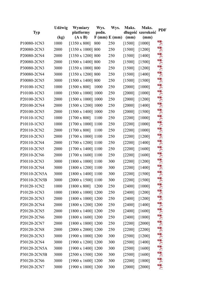 Udźwig Typ P10080-1CN3 P20080-2CN3 P20080-2CN4 P20080-2CN5 P30080-2CN3 P30080-2CN4 P30080-2CN5 P10100-1CN2 P10100-1CN3 P20100-2CN3 P20100-2CN4 P20100-2CN5 P10110-1CN2 P10110-1CN3 P20110-2CN2 P20110-2CN3 P20110-2CN4 P20110-2CN5 P20110-2CN6 P30110-2CN3 P30110-2CN4 P30110-2CN5A P30110-2CN5B P10120-1CN2 P10120-1CN3 P20120-2CN3 P20120-2CN4 P20120-2CN5 P20120-2CN6 P20120-2CN7 P20120-2CN8 P30120-2CN3 P30120-2CN4 P30120-2CN5A P30120-2CN5B P30120-2CN6 P30120-2CN7 (kg) 1000 2000 2000 2000 3000 3000 3000 1000 1000 2000 2000 2000 1000 1000 2000 2000 2000 2000 2000 3000 3000 3000 3000 1000 1000 2000 2000 2000 2000 2000 2000 3000 3000 3000 3000 3000 3000 Wymiary platformy (A x B) [1350 x 800] [1350 x 1000] [1350 x 1200] [1500 x 1400] [1350 x 1000] [1350 x 1200] [1500 x 1400] [1500 x 800] [1500 x 1000] [1500 x 1000] [1500 x 1200] [1500 x 1400] [1700 x 800] [1700 x 1000] [1700 x 800] [1700 x 1000] [1700 x 1200] [1700 x 1400] [1700 x 1600] [1800 x 1000] [1800 x 1200] [1800 x 1400] [2000 x 1500] [1800 x 800] [1800 x 1000] [1800 x 1000] [1800 x 1200] [1800 x 1400] [1800 x 1600] [1800 x 1800] [2000 x 2000] [1900 x 1000] [1900 x 1200] [1900 x 1400] [2500 x 1500] [1900 x 1600] [1900 x 1800] Wys. Wys. Maks. podn. długość F (mm) E (mm) (mm) 800 250 [1500] 800 250 [1500] 800 250 [1500] 800 250 [1500] 800 250 [1500] 800 250 [1500] 800 250 [1500] 1000 250 [2000] 1000 250 [2000] 1000 250 [2000] 1000 250 [2000] 1000 250 [2000] 1100 250 [2200] 1100 250 [2200] 1100 250 [2200] 1100 250 [2200] 1100 250 [2200] 1100 250 [2200] 1100 250 [2200] 1100 300 [2200] 1100 300 [2200] 1100 300 [2200] 1100 300 [2200] 1200 250 [2400] 1200 250 [2400] 1200 250 [2400] 1200 250 [2400] 1200 250 [2400] 1200 250 [2400] 1200 250 [2200] 1200 250 [2200] 1200 300 [2500] 1200 300 [2500] 1200 300 [2500] 1200 300 [2500] 1200 300 [2200] 1200 300 [2000] Maks. PDF szerokość (mm) [1000] [1200] [1400] [1500] [1200] [1400] [1500] [1000] [1000] [1200] [1400] [1500] [1000] [1000] [1000] [1200] [1400] [1600] [1600] [1200] [1400] [1500] [1500] [1000] [1200] [1200] [1400] [1600] [1800] [2000] [2200] [1200] [1400] [1600] [1600] [1800] [2000] Udźwig Typ P30120-2CN8 P10130-1CN2 P20130-2CN3 P20130-2CN4 P20130-2CN5A P20130-2CN5B P20130-2CN6 P20130-2CN7 P20130-2CN8A P20130-2CN8B P30130-2CN3 P30130-2CN4 P30130-2CN5A P30130-2CN5B P30130-2CN6 P30130-2CN7 P30130-2CN8A P30130-2CN8B P40130-2CN3 P40130-2CN4 P40130-2CN5A P40130-2CN5B P40130-2CN5C P50130-2CN4 P50130-2CN5A P50130-2CN5B P50130-2CN6 P50130-2CN7 P50130-2CN8A P50130-2CN8B P10160-2CN3 P10160-2CN4 P10160-2CN5A P10160-2CN5B P10160-2CN5C P10160-2CN6 P20160-2CN3 P20160-2CN4 (kg) 3000 1000 2000 2000 2000 2000 2000 2000 2000 2000 3000 3000 3000 3000 3000 3000 3000 3000 4000 4000 4000 4000 4000 5000 5000 5000 5000 5000 5000 5000 1000 1000 1000 1000 1000 1000 2000 2000 Wymiary platformy (A x B) [2000 x 2000] [2000 x 800] [2000 x 1000] [2000 x 1200] [2000 x 1400] [2000 x 1500] [2000 x 1600] [2000 x 1800] [2000 x 2000] [2500 x 2000] [2000 x 1000] [2000 x 1200] [2000 x 1400] [2500 x 1500] [2000 x 1600] [2000 x 1800] [2000 x 2000] [2500 x 2000] [2000 x 1000] [2000 x 1200] [2000 x 1400] [2000 x 1500] [2500 x 1500] [2200 x 1200] [2200 x 1400] [2500 x 1500] [2200 x 1600] [2200 x 1800] [2200 x 2000] [2500 x 2000] [2200 x 1000] [2200 x 1200] [2200 x 1400] [2200 x 1500] [2500 x 1500] [2200 x 1600] [2250 x 1000] [2250 x 1200] Wys. Wys. Maks. podn. długość F (mm) E (mm) (mm) 1200 300 [2000] 1300 240 [2700] 1300 250 [2700] 1300 250 [2700] 1300 250 [2700] 1300 250 [2700] 1300 250 [2700] 1300 250 [2500] 1300 250 [2500] 1300 250 [2500] 1300 300 [2500] 1300 300 [2500] 1300 300 [2500] 1300 300 [2500] 1300 300 [2500] 1300 300 [2500] 1300 300 [2500] 1300 300 [2500] 1300 300 [2500] 1300 300 [2500] 1300 300 [2500] 1300 300 [2500] 1300 300 [2500] 1300 370 [2700] 1300 370 [2700] 1300 370 [2700] 1300 370 [2700] 1300 370 [2700] 1300 370 [2700] 1300 370 [2700] 1600 250 [2700] 1600 250 [2700] 1600 250 [2700] 1600 250 [2700] 1600 250 [2700] 1600 250 [2700] 1600 300 [2800] 1600 300 [2800] Maks. PDF szerokość (mm) [2000] [1000] [1200] [1400] [1600] [1600] [1800] [2000] [2000] [2000] [1200] [1400] [1600] [1600] [1800] [2000] [2200] [2200] [1200] [1400] [1600] [1600] [1600] [1400] [1600] [1600] [1800] [2000] [2200] [2200] [1200] [1400] [1600] [1600] [1600] [2000] [1200] [1400] Udźwig Typ P20160-2CN5A P20160-2CN5B P20160-2CN5C P20160-2CN6 P20160-2CN7 P20160-2CN8A P20160-2CN8B P30160-2CN3 P30160-2CN4 P30160-2CN5A P30160-2CN5B P30160-2CN6 P30160-2CN7 P30160-2CN8A P30160-2CN8B P30160-2CN8C P30160-2CN9 P30160-2CN10 P50160-2CN4A P50160-2CN4B P50160-2CN5A P50160-2CN5B P50160-2CN5C P50160-2CN6A P50160-2CN6B P50160-2CN7A P50160-2CN7B P50160-2CN8A P50160-2CN8B P50160-2CN8C P50160-2CN9 P50160-2CN10 P15180-2CN3A P15180-2CN3B P15180-2CN4A P15180-2CN4B P15180-2CN5A P15180-2CN5B (kg) 2000 2000 2000 2000 2000 2000 2000 3000 3000 3000 3000 3000 3000 3000 3000 3000 3000 3000 5000 5000 5000 5000 5000 5000 5000 5000 5000 5000 5000 5000 5000 5000 1500 1500 1500 1500 1500 1500 Wymiary platformy (A x B) [2250 x 1400] [2250 x 1500] [2500 x 1500] [2250 x 1600] [2250 x 1800] [2250 x 2000] [2500 x 2000] [2250 x 1000] [2250 x 1200] [2250 x 1400] [2500 x 1500] [2250 x 1600] [2250 x 1800] [2250 x 2000] [2500 x 2000] [3000 x 2000] [2500 x 2200] [3000 x 2400] [2500 x 1200] [3000 x 1200] [2500 x 1400] [2500 x 1500] [3000 x 1500] [2500 x 1600] [3000 x 1600] [2500 x 1800] [3000 x 1800] [2250 x 2000] [2500 x 2000] [3000 x 2000] [2500 x 2200] [3000 x 2400] [2500 x 1000] [3000 x 1000] [2500 x 1200] [3000 x 1200] [2500 x 1400] [2500 x 1500] Wys. Wys. Maks. podn. długość F (mm) E (mm) (mm) 1600 300 [2800] 1600 300 [2800] 1600 300 [2800] 1600 300 [2800] 1600 300 [2800] 1600 300 [2800] 1600 300 [2800] 1600 300 [3000] 1600 300 [3000] 1600 300 [3000] 1600 300 [3000] 1600 300 [3000] 1600 300 [3000] 1600 300 [3000] 1600 300 [3000] 1600 300 [3000] 1600 300 [3000] 1600 300 [3000] 1600 370 [3200] 1600 370 [3200] 1600 370 [3200] 1600 370 [3200] 1600 370 [3200] 1600 370 [3200] 1600 370 [