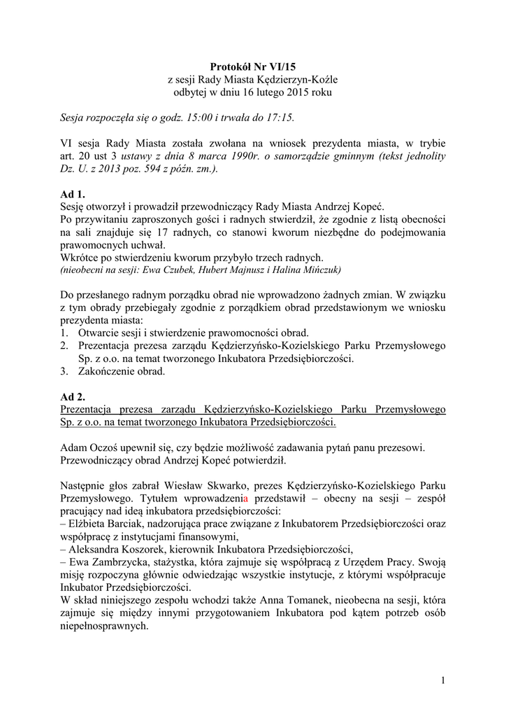 Protokół Nr VI/15 z sesji Rady Miasta Kędzierzyn-Koźle odbytej w dniu 16 lutego 2015 roku Sesja rozpoczęła się o godz. 15:00 i trwała do 17:15. VI sesja Rady Miasta została zwołana na wniosek prezydenta miasta, w trybie art. 20 ust 3 ustawy z dnia 8 marca 1990r. o samorządzie gminnym (tekst jednolity Dz. U. z 2013 poz. 594 z późn. zm.). Ad 1. Sesję otworzył i prowadził przewodniczący Rady Miasta Andrzej Kopeć. Po przywitaniu zaproszonych gości i radnych stwierdził, że zgodnie z listą obecności na sali znajduje się 17 radnych, co stanowi kworum niezbędne do podejmowania prawomocnych uchwał. Wkrótce po stwierdzeniu kworum przybyło trzech radnych. (nieobecni na sesji: Ewa Czubek, Hubert Majnusz i Halina Mińczuk) Do przesłanego radnym porządku obrad nie wprowadzono żadnych zmian. W związku z tym obrady przebiegały zgodnie z porządkiem obrad przedstawionym we wniosku prezydenta miasta: 1. Otwarcie sesji i stwierdzenie prawomocności obrad. 2. Prezentacja prezesa zarządu Kędzierzyńsko-Kozielskiego Parku Przemysłowego Sp. z o.o. na temat tworzonego Inkubatora Przedsiębiorczości. 3. Zakończenie obrad. Ad 2. Prezentacja prezesa zarządu Kędzierzyńsko-Kozielskiego Parku Przemysłowego Sp. z o.o. na temat tworzonego Inkubatora Przedsiębiorczości. Adam Oczoś upewnił się, czy będzie możliwość zadawania pytań panu prezesowi. Przewodniczący obrad Andrzej Kopeć potwierdził. Następnie głos zabrał Wiesław Skwarko, prezes Kędzierzyńsko-Kozielskiego Parku Przemysłowego. Tytułem wprowadzenia przedstawił – obecny na sesji – zespół pracujący nad ideą inkubatora przedsiębiorczości: – Elżbieta Barciak, nadzorująca prace związane z Inkubatorem Przedsiębiorczości oraz współpracę z instytucjami finansowymi, – Aleksandra Koszorek, kierownik Inkubatora Przedsiębiorczości, – Ewa Zambrzycka, stażystka, która zajmuje się współpracą z Urzędem Pracy. Swoją misję rozpoczyna głównie odwiedzając wszystkie instytucje, z którymi współpracuje Inkubator Przedsiębiorczości. W skład niniejszego zespołu wchodzi także Anna Tomanek, nieobecna na sesji, która zajmuje się między innymi przygotowaniem Inkubatora pod kątem potrzeb osób niepełnosprawnych. 1 W dalszej części prezes Wiesław Skwarko przybliżył genezę KędzierzyńskoKozielskiego Parku Przemysłowego i jego cele. Misję i założenia Inkubatora Przedsiębiorczości omówiła Elżbieta Barciak. Aleksandra Koszorek przedstawiła ofertę Inkubatora oraz wyjaśniła do kogo jest adresowana. Dla pełnego zobrazowania tematu i zagadnień radnym została przedstawiona prezentacja, którą kolejno omówili przedstawiciele Inkubatora Przedsiębiorczości. (Prezentację tę radni otrzymali wraz z zawiadomieniem o zwołaniu sesji.) Budynek zlokalizowany przy ul. Szkolnej 17, w którym znajduje się Inkubator Przedsiębiorczości, ma powierzchnię 1311m2. Są tam lokale biurowe o powierzchni od 12m2 do 40m2. Na II piętrze jest około 254m2 do wynajęcia, jest tam 12 pokoi. Na I piętrze jest również 12 pokoi, a powierzchnia wynosi 247m2. Na parterze jest część komercyjna, na której znajduje się pięć pokoi oraz nowocześnie wyposażona i klimatyzowana sala konferencyjna o powierzchni ok. 42m2. W Inkubatorze proponowane są preferencyjne stawki, które kształtują się następująco: Stawką wyjściową jest 32,00 zł. W pierwszym roku pobytu proponowana jest stawka w wys. 12,80 zł. (40% stawki wyjściowej), w drugim roku stawka wynosi 19,20 zł (60% stawki wyjściowej), a w trzecim roku stawka wynosi 25,60 zł (80% stawki wyjściowej). Wszystko jest liczone w cenach netto. Cena obejmuje wszystkie koszty związane z funkcjonowaniem firmy w budynku oraz cały pakiet usług, które Inkubator będzie świadczyć. Do stawki czynszu wliczone zostały opłaty za media (zużycie energii elektrycznej i wody, ogrzewanie, zagospodarowanie odpadów komunalnych, podatek od nieruchomości, ochrona budynku, sprzątanie wspólnych powierzchni, dostęp do internetu). W ciągu miesiąca inkubowany będzie miał możliwość skorzystać z dwóch godzin porad prawnych i 10 dokumentów księgowych. Usługa ta będzie wykonana nieodpłatnie. Ponadto oferta Inkubatora Przedsiębiorczości obejmuje: – pełne zaplecze i usługi administracyjno-sekretaryjne, – obsługę i pakiet usług księgowych, – promocję i reklamę firm, – pomoc w ubieganiu się o dotacje oraz fundusze na powstanie i rozwój firmy, – kursy, szkolenia i warsztaty, – wynajem nowoczesnej sali szkoleniowo-konferencyjnej z pełnym wyposażeniem, – doradztwo i konsultacje prawne, – udział w konferencjach organizowanych przez KKPP. Andrzej Kopeć, przewodniczący Rady Miasta, poinformował, że 26 lutego planowana jest sesja, na którą zaprasza także prezesa KKPP. W porządku obrad przewiduje punkt, na którym planuje jeszcze raz porozmawiać na temat Inkubatora Przedsiębiorczości oraz o działalności samego Parku. W związku z tym poprosił o dostarczenie do Biura Rady Miasta prezentacji w celu przekazania jej radnym. Ustalono, że radni otrzymają prezentację w wersji papierowej i elektronicznej. 2 W dalszej części przewodniczący obrad Andrzej Kopeć poprosił o bliższą informację na temat potencjalnego adresata oferty Inkubatora oraz jakie kryteria należy spełnić, aby skorzystać z Inkubatora. Wiesław Skwarko poinformował, że jest część formalna: Inkubator jest adresowany do osób, które rozpoczynają działalność lub prowadzą ją od niedawna (cezurą czasową jest okres trzech lat). Natomiast ze względu na lokalizację Inkubatora oraz charakter budynku – jest to powierzchnia biurowa, a nie produkcyjna, handlowa lub gastronomiczna – oferta adresowana jest do osób, które będą świadczyć swoje usługi związane albo z działalnością na rzecz innych przedsiębiorstw, albo związane z biznesem internetowym lub zamierzają prowadzić działalność, która nie wyma
