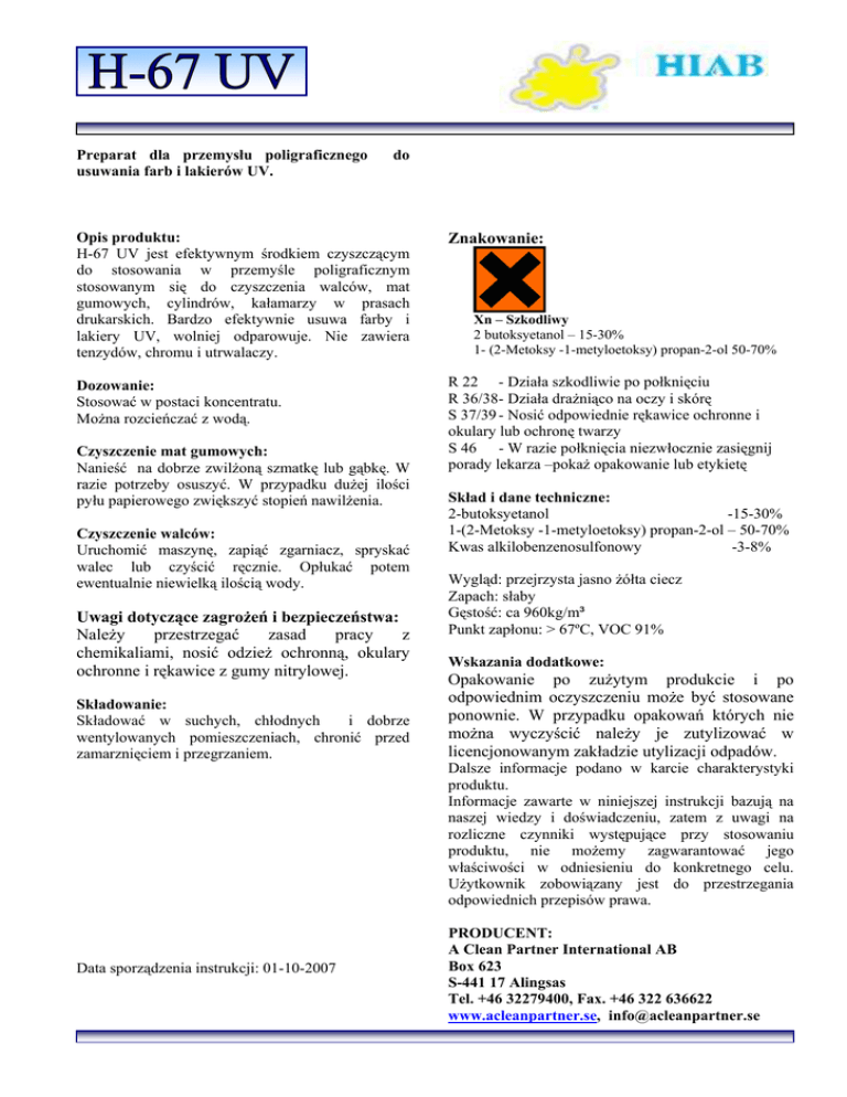 Preparat dla przemysłu poligraficznego usuwania farb i lakierów UV. do Opis produktu: H-67 UV jest efektywnym środkiem czyszczącym do stosowania w przemyśle poligraficznym stosowanym się do czyszczenia walców, mat gumowych, cylindrów, kałamarzy w prasach drukarskich. Bardzo efektywnie usuwa farby i lakiery UV, wolniej odparowuje. Nie zawiera tenzydów, chromu i utrwalaczy. Znakowanie: Dozowanie: Stosować w postaci koncentratu. Można rozcieńczać z wodą. R 22 - Działa szkodliwie po połknięciu R 36/38- Działa drażniąco na oczy i skórę S 37/39 - Nosić odpowiednie rękawice ochronne i okulary lub ochronę twarzy S 46 - W razie połknięcia niezwłocznie zasięgnij porady lekarza –pokaż opakowanie lub etykietę Czyszczenie mat gumowych: Nanieść na dobrze zwilżoną szmatkę lub gąbkę. W razie potrzeby osuszyć. W przypadku dużej ilości pyłu papierowego zwiększyć stopień nawilżenia. Czyszczenie walców: Uruchomić maszynę, zapiąć zgarniacz, spryskać walec lub czyścić ręcznie. Opłukać potem ewentualnie niewielką ilością wody. Uwagi dotyczące zagrożeń i bezpieczeństwa: Należy przestrzegać zasad pracy z chemikaliami, nosić odzież ochronną, okulary ochronne i rękawice z gumy nitrylowej. Składowanie: Składować w suchych, chłodnych i dobrze wentylowanych pomieszczeniach, chronić przed zamarznięciem i przegrzaniem. Xn – Szkodliwy 2 butoksyetanol – 15-30% 1- (2-Metoksy -1-metyloetoksy) propan-2-ol 50-70% Skład i dane techniczne: 2-butoksyetanol -15-30% 1-(2-Metoksy -1-metyloetoksy) propan-2-ol – 50-70% Kwas alkilobenzenosulfonowy -3-8% Wygląd: przejrzysta jasno żółta ciecz Zapach: słaby Gęstość: ca 960kg/m³ Punkt zapłonu: > 67ºC, VOC 91% Wskazania dodatkowe: Opakowanie po zużytym produkcie i po odpowiednim oczyszczeniu może być stosowane ponownie. W przypadku opakowań których nie można wyczyścić należy je zutylizować w licencjonowanym zakładzie utylizacji odpadów. Dalsze informacje podano w karcie charakterystyki produktu. Informacje zawarte w niniejszej instrukcji bazują na naszej wiedzy i doświadczeniu, zatem z uwagi na rozliczne czynniki występujące przy stosowaniu produktu, nie możemy zagwarantować jego właściwości w odniesieniu do konkretnego celu. Użytkownik zobowiązany jest do przestrzegania odpowiednich przepisów prawa. Data sporządzenia instrukcji: 01-10-2007 PRODUCENT: A Clean Partner International AB Box 623 S-441 17 Alingsas Tel. +46 32279400, Fax. +46 322 636622 www.acleanpartner.se, [email protected]