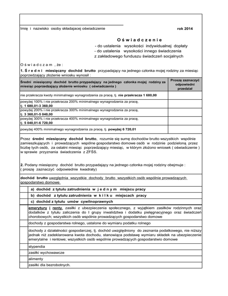 Imię i nazwisko osoby składajacej oświadczenie rok 2014 Oświadczenie - do ustalenia wysokości indywidualnej dopłaty - do ustalenia wysokości innego świadczenia z zakładowego funduszu świadczeń socjalnych O ś w i a d c z a m , że : 1. Ś r e d n i miesięczny dochód brutto przypadający na jednego członka mojej rodziny za miesiąc poprzedzający złożenie wniosku wynosił : Średni miesięczny dochód brutto przypadający na jednego członka mojej rodziny za miesiąc poprzedzający złożenie wniosku ( oświadczenia ) Proszę zaznaczyć odpowiedni przedział nie przekracza kwoty minimalnego wynagrodzenia za pracę, tj. nie przekracza 1 680,00 powyżej 100% i nie przekracza 200% minimalnego wynagrodzenia za pracę, tj. 1 680,01-3 360,00 powyżej 200% i nie przekracza 300% minimalnego wynagrodzenia za pracę, tj. 3 360,01-5 040,00 powyżej 300% i nie przekracza 400% minimalnego wynagrodzenia za pracę, tj. 5 040,01-6 720,00 powyżej 400% minimalnego wynagrodzenia za pracę, tj. powyżej 6 720,01 Przez średni miesięczny dochód brutto, rozumie się sumę dochodów brutto wszystkich wspólnie zamieszkujących i prowadzących wspólne gospodarstwo domowe osób w rodzinie podzieloną przez liczbę tych osób, za ostatni miesiąc poprzedzający miesiąc, w którym złożono wniosek ( oświadczenie ) w sprawie przyznania świadczenia z ZFŚS. 2. Podany miesięczny dochód brutto przypadający na jednego członka mojej rodziny obejmuje : ( proszę zaznaczyć odpowiednie kwadraty) dochód brutto uwzględnia wszystkie dochody brutto wszystkich osób wspólnie prowadzących gospodarstwo domowe a) dochód z tytułu zatrudnienia w j e d n y m miejscu pracy b) dochód z tytułu zatrudnienia w k i l k u miejscach pracy c) dochód z tytułu umów cywilnoprawnych emerytury i renty, zasiłki z ubezpieczenia społecznego, z wyjątkiem zasiłków rodzinnych oraz dodatków z tytułu zaliczenia do I grupy inwalidztwa i dodatku pielęgnacyjnego oraz świadczeń chorobowych; wszystkich osób wspólnie prowadzących gospodarstwo domowe dochody z gospodarstwa rolnego, ustalone do wymiaru podatku rolnego dochody z działalności gospodarczej, tj. dochód uwzględniony do zeznania podatkowego, nie niższy jednak niż zadeklarowana kwota dochodu, stanowiąca podstawę wymiaru składek na ubezpieczenie emerytalne i rentowe; wszystkich osób wspólnie prowadzących gospodarstwio domowe stypendia zasiłki wychowawcze alimenty zasiłki dla bezrobotnych. 3. Dane członków mojej rodziny, w tym dzieci. Wszyscy współnie zamieszkujący i prowadzący wspólne gospodarstwo domowe członkowie mojej rodziny to następujące osoby : L.p. Pokrewieństwo / powinowactwo ( współmałżonek , dziecko, inny ) Imię i nazwisko 1. 2. 3. 4. 5. Oświadczam ponadto, że zapoznałam / łem się z regulaminem zakładowego funduszu świadczeń socjalnych obowiązującym w PWSZ w Koninie. Wszystkie podane przeze mnie dane są zgodne z prawdą. Prawidłowość danych zawartych w niniejszym oświadczeniu stwierdzam własnoręcznym podpisem w przekonaniu, że podanie nieprawdziwych danych spowoduje skutki prawne przewidziane w art. 82 - 88 Kodeksu cywilnego – w zakresie wad oświadczenia woli. Data Podpis wnioskodawcy
