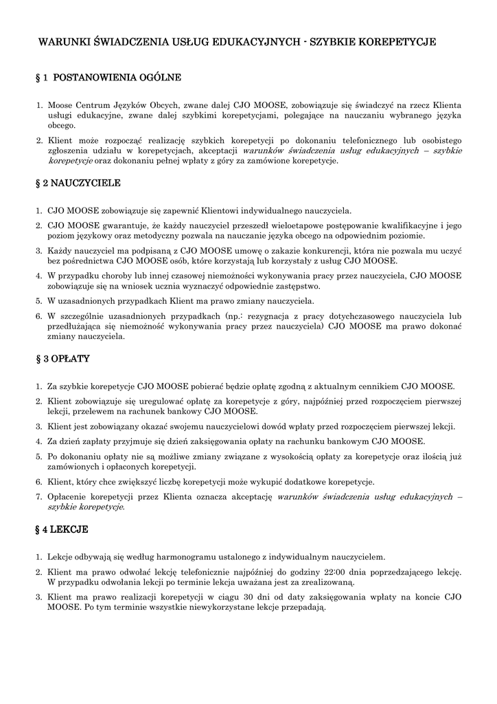 WARUNKI ŚWIADCZENIA USŁUG EDUKACYJNYCH - SZYBKIE KOREPETYCJE § 1 POSTANOWIENIA OGÓLNE 1. Moose Centrum Języków Obcych, zwane dalej CJO MOOSE, zobowiązuje się świadczyć na rzecz Klienta usługi edukacyjne, zwane dalej szybkimi korepetycjami, polegające na nauczaniu wybranego języka obcego. 2. Klient moŜe rozpocząć realizację szybkich korepetycji po dokonaniu telefonicznego lub osobistego zgłoszenia udziału w korepetycjach, akceptacji warunków świadczenia usług edukacyjnych – szybkie korepetycje oraz dokonaniu pełnej wpłaty z góry za zamówione korepetycje. § 2 NAUCZYCIELE 1. CJO MOOSE zobowiązuje się zapewnić Klientowi indywidualnego nauczyciela. 2. CJO MOOSE gwarantuje, Ŝe kaŜdy nauczyciel przeszedł wieloetapowe postępowanie kwalifikacyjne i jego poziom językowy oraz metodyczny pozwala na nauczanie języka obcego na odpowiednim poziomie. 3. KaŜdy nauczyciel ma podpisaną z CJO MOOSE umowę o zakazie konkurencji, która nie pozwala mu uczyć bez pośrednictwa CJO MOOSE osób, które korzystają lub korzystały z usług CJO MOOSE. 4. W przypadku choroby lub innej czasowej niemoŜności wykonywania pracy przez nauczyciela, CJO MOOSE zobowiązuje się na wniosek ucznia wyznaczyć odpowiednie zastępstwo. 5. W uzasadnionych przypadkach Klient ma prawo zmiany nauczyciela. 6. W szczególnie uzasadnionych przypadkach (np.: rezygnacja z pracy dotychczasowego nauczyciela lub przedłuŜająca się niemoŜność wykonywania pracy przez nauczyciela) CJO MOOSE ma prawo dokonać zmiany nauczyciela. § 3 OPŁATY 1. Za szybkie korepetycje CJO MOOSE pobierać będzie opłatę zgodną z aktualnym cennikiem CJO MOOSE. 2. Klient zobowiązuje się uregulować opłatę za korepetycje z góry, najpóźniej przed rozpoczęciem pierwszej lekcji, przelewem na rachunek bankowy CJO MOOSE. 3. Klient jest zobowiązany okazać swojemu nauczycielowi dowód wpłaty przed rozpoczęciem pierwszej lekcji. 4. Za dzień zapłaty przyjmuje się dzień zaksięgowania opłaty na rachunku bankowym CJO MOOSE. 5. Po dokonaniu opłaty nie są moŜliwe zmiany związane z wysokością opłaty za korepetycje oraz ilością juŜ zamówionych i opłaconych korepetycji. 6. Klient, który chce zwiększyć liczbę korepetycji moŜe wykupić dodatkowe korepetycje. 7. Opłacenie korepetycji przez Klienta oznacza akceptację warunków świadczenia usług edukacyjnych – szybkie korepetycje. § 4 LEKCJE 1. Lekcje odbywają się według harmonogramu ustalonego z indywidualnym nauczycielem. 2. Klient ma prawo odwołać lekcję telefonicznie najpóźniej do godziny 22:00 dnia poprzedzającego lekcję. W przypadku odwołania lekcji po terminie lekcja uwaŜana jest za zrealizowaną. 3. Klient ma prawo realizacji korepetycji w ciągu 30 dni od daty zaksięgowania wpłaty na koncie CJO MOOSE. Po tym terminie wszystkie niewykorzystane lekcje przepadają.