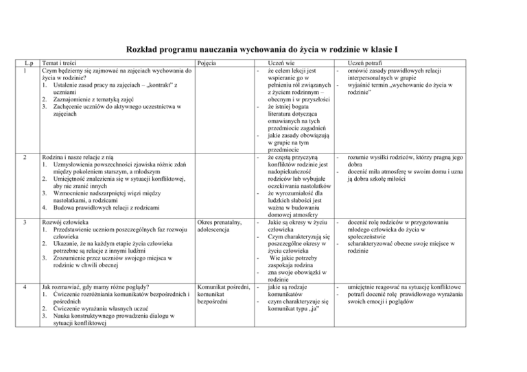 Rozkład programu nauczania wychowania do życia w rodzinie w klasie I L.p 1 Temat i treści Pojęcia Czym będziemy się zajmować na zajęciach wychowania do życia w rodzinie? 1. Ustalenie zasad pracy na zajęciach – „kontrakt” z uczniami 2. Zaznajomienie z tematyką zajęć 3. Zachęcenie uczniów do aktywnego uczestnictwa w zajęciach - - - 2 3 Rodzina i nasze relacje z nią 1. Uzmysłowienia powszechności zjawiska różnic zdań między pokoleniem starszym, a młodszym 2. Umiejętność znalezienia się w sytuacji konfliktowej, aby nie zranić innych 3. Wzmocnienie nadszarpniętej więzi między nastolatkami, a rodzicami 4. Budowa prawidłowych relacji z rodzicami Rozwój człowieka 1. Przedstawienie uczniom poszczególnych faz rozwoju człowieka 2. Ukazanie, że na każdym etapie życia człowieka potrzebne są relacje z innymi ludźmi 3. Zrozumienie przez uczniów swojego miejsca w rodzinie w chwili obecnej - - Okres prenatalny, adolescencja - - 4 Jak rozmawiać, gdy mamy różne poglądy? 1. Ćwiczenie rozróżniania komunikatów bezpośrednich i pośrednich 2. Ćwiczenie wyrażania własnych uczuć 3. Nauka konstruktywnego prowadzenia dialogu w sytuacji konfliktowej Komunikat pośredni, komunikat bezpośredni - Uczeń wie że celem lekcji jest wspieranie go w pełnieniu ról związanych z życiem rodzinnym – obecnym i w przyszłości że istniej bogata literatura dotycząca omawianych na tych przedmiocie zagadnień jakie zasady obowiązują w grupie na tym przedmiocie że częstą przyczyną konfliktów rodzinie jest nadopiekuńczość rodziców lub wybujałe oczekiwania nastolatków że wyrozumiałość dla ludzkich słabości jest ważna w budowaniu domowej atmosfery Jakie są okresy w życiu człowieka Czym charakteryzują się poszczególne okresy w życiu człowieka Wie jakie potrzeby zaspokaja rodzina zna swoje obowiązki w rodzinie jakie są rodzaje komunikatów czym charakteryzuje się komunikat typu „ja” - - - - - Uczeń potrafi omówić zasady prawidłowych relacji interpersonalnych w grupie wyjaśnić termin „wychowanie do życia w rodzinie” rozumie wysiłki rodziców, którzy pragną jego dobra docenić miła atmosferę w swoim domu i uzna ją dobra szkołę miłości docenić rolę rodziców w przygotowaniu młodego człowieka do życia w społeczeństwie scharakteryzować obecne swoje miejsce w rodzinie umiejętnie reagować na sytuację konfliktowe potrafi docenić rolę prawidłowego wyrażania swoich emocji i poglądów 5 6 7 8 9 10 11 12 Rozwiązywanie konfliktów 1. Nauka rozwiązywania konfliktów poprzez umiejętne postępowanie w sytuacjach konfliktowych 2. Pomoc w nawiązywaniu prawidłowych relacji z rodzicami Autorytet – co to takiego? 1. Wyjaśnienie uczniom pojęcia autorytet 2. Zrozumienie przez uczniów znaczenia autorytetów w życiu człowieka 3. Próba określenia współczesnych autorytetów w życiu człowieka Koleżeństwo 1. Uświadomienie uczniom istnienia wpływu grupy koleżeńskiej na zachowania człowieka 2. Ćwiczenie postawy asertywności 3. Wzmocnienie pozytywnych relacji w zespole klasowym Droga do przyjaźni 1. Poznanie procesu nawiązywania więzi i budowy przyjaźni 2. Zrozumienie istoty przyjaźni Zakochanie, a miłość 1. Wzbudzenie refleksji na temat rozwoju relacji między dziewczyną, a chłopakiem 2. Uświadomienie uczniom różnicy pomiędzy pierwszymi porywami uczuć, a dojrzałą miłością Kobiecość i męskość 1. Poszukiwanie przez uczniów wzorców kobiecości i męskości w dzisiejszym świecie 2. Wzmocnienie u uczniów akceptacji własnej płci Kryteria dojrzałości 1. Złożoność procesu dojrzewania 2. Kryteria dojrzałości Dojrzewanie 1. Wielopłaszczyznowość procesu dojrzewania 2. Przejawy procesu dojrzewania biologicznego i Jakie są sposoby postępowania w rozwiązywaniu konfliktów - Zna znaczenie słowa autorytet Co buduje autorytet - Potrafi docenić rolę autorytetu w życiu człowieka Wyrobienie umiejętności rozróżniania tego, co trudne ale wartościowe od płytkiej łatwizny - Co to jest asertywność Że grupa pływa na zachowania jednostek - Umiejętnie powiedzieć „nie” Potrafi omówić w jaki sposób grupa może wpływać na zachowania jednostek - wie jak wygląda proces nawiązywania więzi i budowy przyjaźni - rozumie istotę przyjaźni - - Że odmiennie przeżywają miłość chłopcy, a odmiennie dziewczyny Zna rodzaje młodzieńczej miłości Zna podstawowe różnice w postrzeganiu świata pomiędzy kobietami a mężczyznami - - Zna rodzaje dojrzałości - - Wie, że dojrzałość biologiczna nie musi oznaczać dojrzałości w - - autorytet - asertywność - - - Potrafi scharakteryzować każda z metod rozwiązywania konfliktów Zastosować w praktyce zdobytą wiedzę na temat rozwiązywania konfliktów uzmysłowienie uczniom, że są w okresie otwierania swoich serc Potrafi wskazać przykłady nieporozumień wynikające z różnic psychoseksualnych Rozumie, że pewne zachowania są charakterystyczne dla kobiet lub dl mężczyzn Dostrzega rolę środowiska rodzinnego w kształtowaniu człowieka Dostrzega złożoność procesu dojrzewania Potrafi wskazać przejawy dojrzałości człowieka w każdym aspekcie Rozumie jaką rolę odgrywa samowychowanie 13 psychicznego 3. Samowychowanie jako warunek osiągnięcia dojrzałości emocjonalnej, intelektualnej i duchowej Problemy okresu dojrzewania 1. Zjawiska związane z okresem dojrzewania 2. Dojrzewanie – czas trudny, ale również piękny i ciekawy - - 14 Czas wolny – co zrobić, by nam służył? 1. Jak sporządzić plan zajęć? 2. Czy każda rozrywka wzbogaca moją osobowość w osiąganiu dojrzałości innych aspektach - Zna biologiczne aspekty procesu dojrzewania ze szczególnym uwzględnieniem własnej płci Wie jaką rolę odgrywa higiena podczas okresu dojrzewania Jakie rozrywki mogą przynieść mu korzyść - Potrafi dostrzec związek pomiędzy ewentualnymi zmianami w funkcjonowaniu w organizmu, a pro