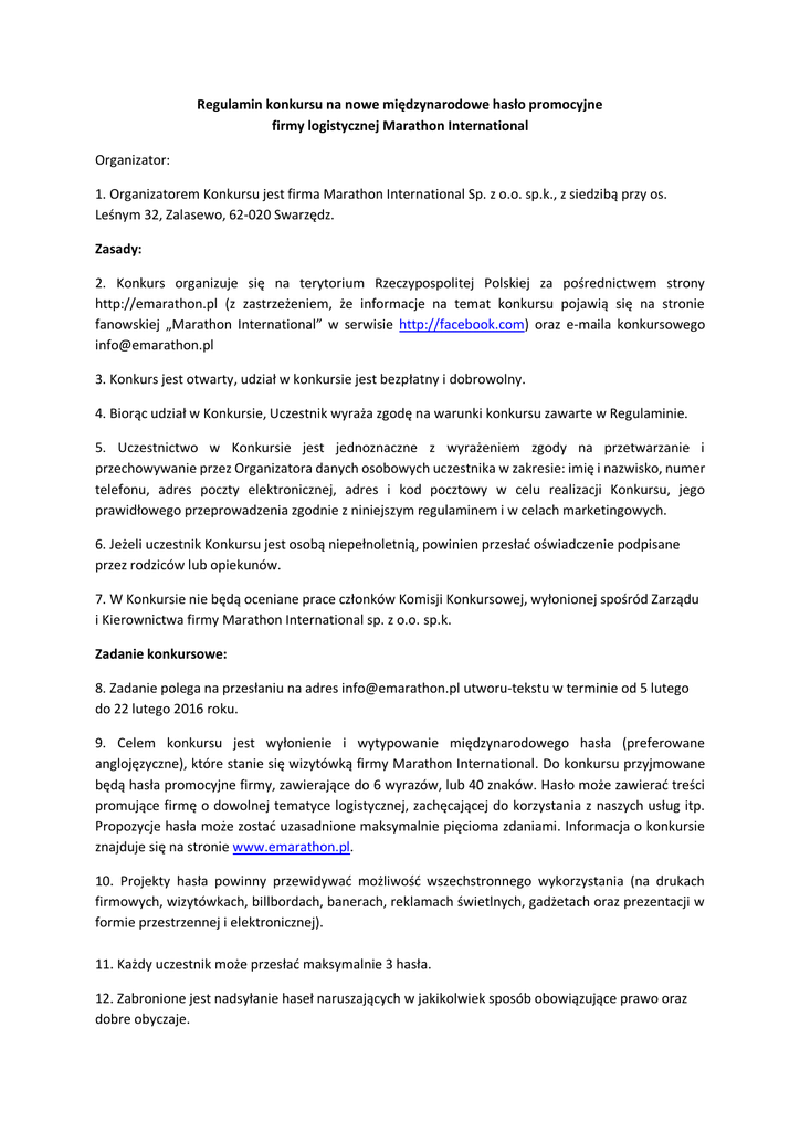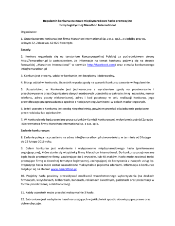 Regulamin konkursu na nowe międzynarodowe hasło promocyjne firmy logistycznej Marathon International Organizator: 1. Organizatorem Konkursu jest firma Marathon International Sp. z o.o. sp.k., z siedzibą przy os. Leśnym 32, Zalasewo, 62-020 Swarzędz. Zasady: 2. Konkurs organizuje się na terytorium Rzeczypospolitej Polskiej za pośrednictwem strony http://emarathon.pl (z zastrzeżeniem, że informacje na temat konkursu pojawią się na stronie fanowskiej „Marathon International” w serwisie http://facebook.com) oraz e-maila konkursowego [email protected] 3. Konkurs jest otwarty, udział w konkursie jest bezpłatny i dobrowolny. 4. Biorąc udział w Konkursie, Uczestnik wyraża zgodę na warunki konkursu zawarte w Regulaminie. 5. Uczestnictwo w Konkursie jest jednoznaczne z wyrażeniem zgody na przetwarzanie i przechowywanie przez Organizatora danych osobowych uczestnika w zakresie: imię i nazwisko, numer telefonu, adres poczty elektronicznej, adres i kod pocztowy w celu realizacji Konkursu, jego prawidłowego przeprowadzenia zgodnie z niniejszym regulaminem i w celach marketingowych. 6. Jeżeli uczestnik Konkursu jest osobą niepełnoletnią, powinien przesłać oświadczenie podpisane przez rodziców lub opiekunów. 7. W Konkursie nie będą oceniane prace członków Komisji Konkursowej, wyłonionej spośród Zarządu i Kierownictwa firmy Marathon International sp. z o.o. sp.k. Zadanie konkursowe: 8. Zadanie polega na przesłaniu na adres [email protected] utworu-tekstu w terminie od 5 lutego do 22 lutego 2016 roku. 9. Celem konkursu jest wyłonienie i wytypowanie międzynarodowego hasła (preferowane anglojęzyczne), które stanie się wizytówką firmy Marathon International. Do konkursu przyjmowane będą hasła promocyjne firmy, zawierające do 6 wyrazów, lub 40 znaków. Hasło może zawierać treści promujące firmę o dowolnej tematyce logistycznej, zachęcającej do korzystania z naszych usług itp. Propozycje hasła może zostać uzasadnione maksymalnie pięcioma zdaniami. Informacja o konkursie znajduje się na stronie www.emarathon.pl. 10. Projekty hasła powinny przewidywać możliwość wszechstronnego wykorzystania (na drukach firmowych, wizytówkach, billbordach, banerach, reklamach świetlnych, gadżetach oraz prezentacji w formie przestrzennej i elektronicznej). 11. Każdy uczestnik może przesłać maksymalnie 3 hasła. 12. Zabronione jest nadsyłanie haseł naruszających w jakikolwiek sposób obowiązujące prawo oraz dobre obyczaje. 13. Po zakończeniu Konkursu, Komisja wybierze 1 najlepsze hasło, w ciągu 7 dni od zakończenia Konkursu. 14. Informacja o rozstrzygnięciu Konkursu pojawi się na stronie internetowej www.emarathon.pl, a zwycięzca zostanie powiadomiony mailowo. Nagrody: 15. Nagrodą dla laureata konkursu będzie sesja 10-minutowego lotu w tunelu aerodynamicznym w Warszawie wraz z 4-osobowym kobiecym zespołem spadochroniarskim NoMercy oraz nagrody niespodzianki. 16. Nadesłane poprawne utwory będą oceniane przez Komisję, w skład której wchodzą Zarząd i Kadra Kierownicza Firmy Marathon International sp. z o.o. sp.k. Przewodniczącym Komisji Konkursowej będzie Prezes Zarządu Komplementariusza Marathon International sp. z o.o. sp.k. 17. Ostateczna decyzja w sprawach konkursowych należy do Prezesa Zarządu Komplementariusza Marathon International sp. z o.o. sp.k.. 18. Laureat konkursu zostanie powiadomiony przez Organizatora Konkursu o fakcie zdobycia nagrody emailem zwrotnym, nie później niż czternaście dni po zakończeniu Konkursu. 19. Po otrzymaniu powiadomienia o wygranej w Konkursie, uczestnik powinien przesłać na podany w wiadomości adres kontaktowy swoje dane potrzebne do przekazania nagrody, czyli: rzeczywiste imię i nazwisko oraz adres pocztowy, na który ma zostać przesłana nagroda. 20. Nagrody dla uczestników spoza Poznania zostaną wysłane Laureatom Pocztą Polską w ciągu 10 dni od dnia otrzymania od uczestnika danych adresowych potrzebnych do wysłania nagrody. Laureat z Poznania jest zobowiązany w ciągu miesiąca odebrać nagrodę w siedzibie Firmy. Nieodebranie nagrody w terminie miesiąca od opublikowania rozstrzygnięcia konkursu na stronie internetowej konkursu jest równoznaczne z rezygnacją z nagrody. 21. Organizator nie ponosi odpowiedzialności za prawidłowość i terminowość doręczenia przez pocztę przesyłek zawierających Nagrody w Konkursie lub za podanie przez Uczestnika niewłaściwych lub nieprawdziwych danych dotyczących adresu zamieszkania. Kwalifikacja i kryteria oceny: 22. Na podany adres e-mail należy przesłać pliki w formacie tekstowym w wielkości nie przekraczającej 1 MB. 23. Zgłaszane do konkursu hasła nie mogą być użytkowane już przez inne firmy. 24. Przy ocenie prac konkursowych komisja będzie kierowała się kryteriami: a. spełnienie założeń ideowych konkursu, b. jakością walorów językowych, estetycznych i artystycznych. Prawa autorskie: 25. W momencie zgłoszenia przez Uczestnika utworu w rozumieniu art. 1 ustawy z dnia 4 lutego 1994 roku o prawie autorskim i prawach pokrewnych Uczestnik przenosi na Organizatora konkursu i Partnera bezpłatnie: a. całość autorskich praw majątkowych do nadesłanego utworu w zakresie następujących pól eksploatacji: utrwalania i zwielokrotniania utworu – wytwarzanie określoną techniką egzemplarz utworu, w tym techniką drukarską, reprograficzną, zapisu magnetycznego oraz techniką cyfrową, obrotu oryginałem albo egzemplarzami, na których utwór utrwalono - wprowadzanie do obrotu, użyczenie lub najem oryginału albo egzemplarzy, rozpowszechniania utworu w sposób inny niż określony w pkt b) - publiczne wykonanie, wystawienie, wyświetlenie, odtworzenie oraz nadawanie i reemitowanie, a także publiczne udostępnianie utworu w taki sposób, aby każdy mógł mieć do niego dostęp w miejscu i w czasie przez siebie wybranym, co obejmuje rozpowszechnianie w przewodnikach, katalogach, drukach promocyjnych i r