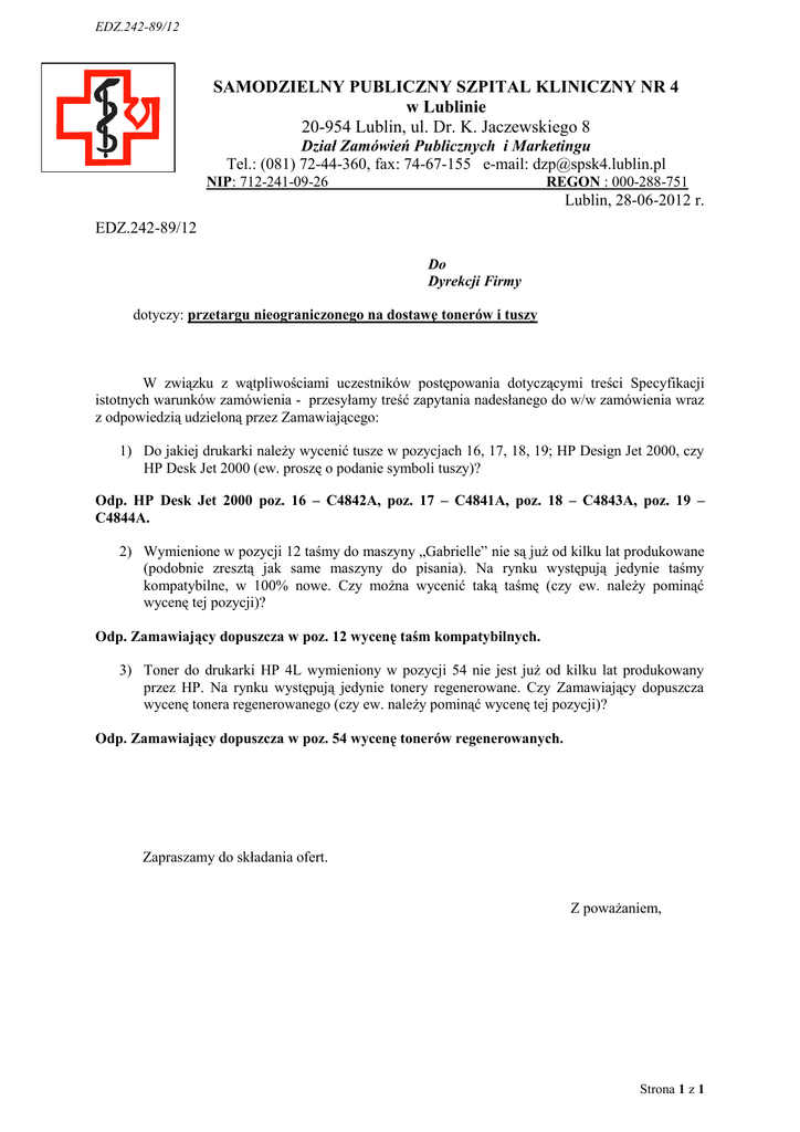 EDZ.242-89/12 SAMODZIELNY PUBLICZNY SZPITAL KLINICZNY NR 4 w Lublinie 20-954 Lublin, ul. Dr. K. Jaczewskiego 8 Dział Zamówień Publicznych i Marketingu Tel.: (081) 72-44-360, fax: 74-67-155 e-mail: [email protected] NIP: 712-241-09-26 REGON : 000-288-751 Lublin, 28-06-2012 r. EDZ.242-89/12 Do Dyrekcji Firmy dotyczy: przetargu nieograniczonego na dostawę tonerów i tuszy W związku z wątpliwościami uczestników postępowania dotyczącymi treści Specyfikacji istotnych warunków zamówienia - przesyłamy treść zapytania nadesłanego do w/w zamówienia wraz z odpowiedzią udzieloną przez Zamawiającego: 1) Do jakiej drukarki należy wycenić tusze w pozycjach 16, 17, 18, 19; HP Design Jet 2000, czy HP Desk Jet 2000 (ew. proszę o podanie symboli tuszy)? Odp. HP Desk Jet 2000 poz. 16 – C4842A, poz. 17 – C4841A, poz. 18 – C4843A, poz. 19 – C4844A. 2) Wymienione w pozycji 12 taśmy do maszyny „Gabrielle” nie są już od kilku lat produkowane (podobnie zresztą jak same maszyny do pisania). Na rynku występują jedynie taśmy kompatybilne, w 100% nowe. Czy można wycenić taką taśmę (czy ew. należy pominąć wycenę tej pozycji)? Odp. Zamawiający dopuszcza w poz. 12 wycenę taśm kompatybilnych. 3) Toner do drukarki HP 4L wymieniony w pozycji 54 nie jest już od kilku lat produkowany przez HP. Na rynku występują jedynie tonery regenerowane. Czy Zamawiający dopuszcza wycenę tonera regenerowanego (czy ew. należy pominąć wycenę tej pozycji)? Odp. Zamawiający dopuszcza w poz. 54 wycenę tonerów regenerowanych. Zapraszamy do składania ofert. Z poważaniem, Strona 1 z 1
