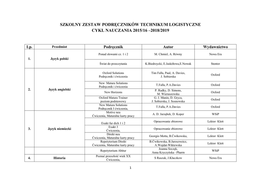 SZKOLNY ZESTAW PODRĘCZNIKÓW TECHNIKUM LOGISTYCZNE CYKL NAUCZANIA 2015/16 –2018/2019 Lp. 1. 2. Przedmiot Podręcznik Autor Wydawnictwo Ponad słowami cz. 1 i 2 M. Chmiel, A. Równy Nowa Era Świat do przeczytania K.Biedrzycki, E.Jaskółowa,E.Nowak Stentor Oxford Solutions Podręcznik i ćwiczenia Tim Falla, Paul, A. Davies, J. Sobierska Oxford New Matura Solutions Podręcznik i ćwiczenia T.Falla, P.A.Davies Oxford Język polski Język angielski New Horizons Oxford Matura Trainer poziom podstawowy New Matura Solutions Podręcznik I ćwiczenia, Motive neu Ćwiczenia, Maturalne karty pracy 3. Język niemiecki Exakt fur dich 1 i 2 Exakt 3 Ćwiczenia, Direkt neu Ćwiczenia, Maturalne karty pracy Repetytorium Direkt Ćwiczenia, Maturalne karty pracy Repetytorium Abitur 4. Historia Poznać przeszłość wiek XX Ćwiczenia, 1 P. Radky, D. Simons, M. Wieruszewska G. J. Manin, D. Gryca, J. Sobierska, J. Sosnowska Oxford Oxford T.Falla, P.A.Davies Oxford A. D. Jarząbek, D. Koper WSiP Opracowanie zbiorowe Lektor Klett Opracowanie zbiorowe Lektor Klett Georgio Motta, B.Ćwikowska, Lektor Klett B.Ćwikowska, B.Jaroszweicz, A.Wojdat-Wiktewska Joanna Szczęk, Anna Kryczyńska –Pharm S Raszuk, J.Kłaczkow Lektor Klett WSiP Nowa Era 5. Historia i społeczeństwo 6. Wiedza o społeczeństwie 7. Wiedza o kulturze 8. 9. 10. 11. Matematyka Fizyka i Astronomia Chemia Biologia Poznać przeszłość Ćwiczenia, W centrum uwagi Ćwiczenia, Maturalne karty pracy Spotkania z kulturą Ćwiczenia, Maturalne karty pracy Matematyka – poziom podstawowy Zbiór zadań, Ćwiczenia, Zbiór zadań i zestawów maturalnych, Arkusze maturalne Matematyka – poziom rozszerzony Zbiór zadań, Ćwiczenia, Zbiór zadań i zestawów maturalnych, Arkusze maturalne Odkryć fizykę Zbiór zadań, Ćwiczenia, Zbiór zadań i zestawów maturalnych, Arkusze maturalne Iwona Janicka Nowa Era A. Janicki Nowa Era M. Bokiniec, B. Forysiewicz, J, Michałowski Nowa Era W. Babiński, L. Chańko, J .Czarnowska, J. Wesołowska Nowa Era H. Pawłowski OPERON M.Braun, W.Śliwa Nowa Era To jest chemia R.Hassa, A.Mrzigod, J.Mrizgod Nowa Era Biologia. Po prostu K.Archacka, R .Archacki, K. Spalik, J. Stocka WSiP Ćwiczenia, 12. Przyroda Przyroda cz. 1 i 2 13. Podstawy przedsiębiorczości 14. Geografia 15. Technologia informacyjna 16. Edukacja dla bezpieczeństwa 17. Religia Krok w przedsiębiorczość Oblicza geografii Ćwiczenia, Informatyka .Po prostu Edukacja dla bezpieczeństwa Ćwiczenia, W blasku Bożej prawdy 2 M. Galikowski, R. Hassa M. Kaczmarzyk, A. Mrzigod J. Mrzigod, M. Wiąckowski Z.Makieła,T.Rachwał Nowa Era Nowa Era R.Uliszak, K.Wiederman Nowa Era Zdzisław Nowakowski M. Goniewicz, A. W. Nowak, Z. Smutek T. Śmiech, E. Kondrak WSiP Operon Jedność 18. 18. 19. 20. 21. 22. 23. 24. Wychowanie do życia w rodzinie Przedsiębiorstwo logistyczne w gospodarce rynkowej Logistyka w procesach produkcji Zapasy i magazynowanie Dystrybucja Procesy transportowe w logistyce Logistyka w jednostkach gospodarczych i administracyjnych Wychowanie do życia w rodzinie M. Ryś Rubikon Podstawy funkcjonowania przedsiębiorstw dla logistyków. Paweł Andrzejczyk, Krzysztof Pawłowski Instytut Logistyki i Magazynowania Organizacja i monitorowanie procesów produkcyjnych. Organizacja i monitorowanie procesów magazynowych. Testy do egzaminu z kwalifikacji A.30 Organizacja i monitorowanie przepływu zasobów i informacji w procesach produkcji, dystrybucji i magazynowania B.Śliwczyński, A.Koliński, P.Andrzejczyk St. Krzyżaniak, A. Niemczyk, J. Majewski, P. Andrzejczyk Instytut Logistyki i Magazynowania Instytut Logistyki i Magazynowania Dorota Szymczyńska Empi2 Organizowanie i monitorowanie procesów dystrybucji Joanna Śliżewska, Dorota Zadrożna Instytut Logistyki i Magazynowania Maciej Stajniak, Marcin Foltyński, Marcin Hajdul, Agnieszka Krupa Instytut Logistyki i Magazynowania Business English John Taylor, Jeff Zeter Egis Logistics Student's Book Virginia Evans, Jenny Dooley, Donald Buchannan Express Publishing Anna Rożej, Jarosław Stolarski, Joanna Śliżewska WSiP Daria Cybulska, Jarosław Stolarski WSiP Transport i spedycja Materiały własne nauczyciela Język obcy w logistyce 25. Laboratorium magazynowe Organizowanie i monitorowanie procesów magazynowych 26. Planowanie produkcji i dystrybucji Materiały własne nauczyciela 27. Laboratorium transportowospedycyjne Organizowanie i monitorowanie procesów transportowych 3 Organizowanie środków technicznych w celu realizacji procesów transportowych Testy do egzaminu z kwalifikacji A.31 Zarządzanie środkami technicznymi podczas realizacji procesów transportowych 28. Obsługa jednostek zewnętrznych Materiały własne nauczyciela 29. Planowanie przepływu zasobów i informacji Organizowanie i monitorowanie przepływu zasobów i informacji w jednostkach administracyjnych. Marcin Deja, Wojciech Matysiak, Paweł Śliżewski WSiP Dorota Szymczyńska Empi2 Marcin Deja, Anna Rożej, Justyna Stochaj, Jarosław Stolarski WSiP Pozostałe podręczniki zostaną wskazane przez nauczycieli we wrześniu. Zaleca się korzystanie z pomocy w formie repetytoriów, słowników, atlasów, opracowań, zbiorów zadań, wzorów pism, faktur itp. dopuszczonych przez Ministerstwo Oświaty. 4