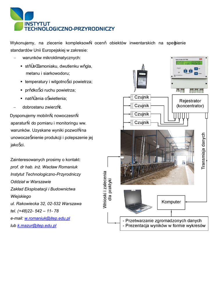 Wykonujemy, na zlecenie kompleksową ocenę obiektów inwentarskich na spełnienie standardów Unii Europejskiej w zakresie: - warunków mikroklimatycznych: § stężeń amoniaku, dwutlenku węgla, metanu i siarkowodoru; § temperatury i wilgotności powietrza; § prędkości ruchu powietrza; § natężenia oświetlenia; - dobrostanu zwierząt. Dysponujemy mobilną, nowoczesną aparaturą do pomiaru i monitoringu ww. warunków. Uzyskane wyniki pozwolą na unowocześnienie produkcji i polepszenie jej jakości. Zainteresowanych prosimy o kontakt: prof. dr hab. inż. Wacław Romaniuk Instytut Technologiczno-Przyrodniczy Oddział w Warszawie Zakład Eksploatacji i Budownictwa Wiejskiego ul. Rakowiecka 32, 02-532 Warszawa tel. (+48)22- 542 – 11- 78 e-mail: [email protected] lub [email protected]