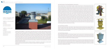 12 went yl acja, klimat y z acja Wywietrzaki zintegrowane Monsun Wywietrzaki zintegrowane Monsun to konstrukcja kombinowana, polegająca na połączeniu wentylacji mechanicznej z wentylacją grawitacyjną (naturalną). Wewnątrz wywietrznaka własciwego wykonanego z kompozytu poliestrowo - szklanego jest zamontowany centralnie wentylator, który przy pomocy kanału zakonczonego kołnierzem montażowym może być dołączony do sieci odciągów wentylacji mechanicznej, do okapu odciągu miejscowego itp. Konstrukcja pozwala przy jednym otworze w dachu zapewnić wentylacje grawitacyjną podczas postoju wentylatora. Jak również zintensyfikować ją przy jego pracy. Wentylator w tym przypadku stanowi zwieńczenie wywietrzaka zabezpieczające przed przedostawaniem się do środka pomieszczenia wody opadowej. Jego funkcja jest jednak większa, bo dzięki specyficznemu ukształtowaniu kopuły, struga powietrza wywiewanego mechanicznie przez wentylator omywa ekran wywietrzaka wydatnie zwiększając poziom wentylacji grawitacyjnej. Wytwarzane w ten sposób podciśnienie jest pewnym bonusem który otrzymujemy „za darmo”, tym samym efektywność zespołu wywietrzak-wentylator w niektórych przypadkach rośnie do 20%.Mozliwe miejsca zastosowan to pomieszczenia z duzymi zyskami ciepla i wilgoci, pomieszczenia, w których powinna byc zachowana ciagla wentylacja naturalna natomiast jedynie okresowo w przypadku potrzeby wlaczana wentylacja mechaniczna (np. pomieszczenia z wystepujacym okresowo zanieczyszczeniem, magazyny podczas pracy wózków widlowych spalinowych, zajezdnie autobusowe itp.). Czesta potrzeba wystepujaca w praktyce jest mozliwosc jednoczesnego wentylowania pomieszczen produkcyjnych oraz wystepujacych nad nimi pomieszczen strychowych lub pustek stropodachowych. W takich sytuacjach kanal wentylacji mechanicznej moze wyciagac powietrze z pomieszczen nizszych natomiast grawitacja pozwala na wentylacje pomieszczen strychowych. efektywno zespołu wywietrzak-wentylator w niektórych przypadkach ro nie do 20%.Mozliwe miejsca zastosowan to pomieszczenia z duzymi zyskami ciepla i wilgoci, pomieszczenia, w których powinna byc zachowana ciagla wentylacja naturalna natomiast jedynie okresowo w przypadku potrzeby wlaczana wentylacja mechaniczna (np. pomieszczenia z wystepujacym okresowo zanieczyszczeniem, magazyny podczas pracy wózków widlowych spalinowych, zajezdnie autobusowe itp.). Czesta potrzeba wystepujaca w praktyce jest mozliwosc jednoczesnego wentylowania pomieszczen produkcyjnych oraz wystepujacych nad nimi pomieszczen strychowych lub pustek stropodachowych. W takich sytuacjach kanal wentylacji mechanicznej moze wyciagac powietrze z pomieszczen nizszych natomiast grawitacja pozwala na wentylacje pomieszczen strychowych. Przedsiębiorstwo Usługowo-Produkcyjne i Wdrażania Postępu Technicznego „UNIWERSAL” Sp. z o.o. „UNIWERSAL” Sp. z o.o, Biuro techniczno-handlowe ul. Reymonta 24 40-029 Katowice tel. 32/ 757 28 51, 32/ 201 87 04 Wywietrzaki bora fax 32/ 757 28 51, 32/ 201 87 04 Nowej konstrukcji wywietrznik dachowy wykonany z laminatu poliestrowo - szklanego. Charakteryzuje się bardzo niskim oporem dla powietrza wywiewanego. Podwójny ekran zewnętrzny z wyprofilowanymi komorami zwiększa efektywność zasysania powietrza z kanału wentylacyjnego. Badania opływowe wywietrznika BORA wykonane w tunelu aerodynamicznym wykazały, że przy różnych kątach pochylenia wywietrznika do napływającego wiatru nie występuje zjawisko nadciśnienia a tym samym wywietrznik nie pozwala na wtłaczanie powietrza do wewnątrz kanału wentylacyjnego. „UNIWERSAL” Sp. z o.o, Produkcja i magazyny ul. Zakopiańska 1a 40-219 Katowice tel. 32/ 203 87 20, 32/ 203 87 40 fax 32/ 203 87 20, 32/ 203 87 40 [email protected] www.uniwersal.com.pl 244 244 Przedsiębiorstwo Produkcyjne UNIWERSAL Sp z o.o. istnieje od 1988 roku i zajmuje się produkcją i dostarczaniem na rynek polski i zagraniczny wentylatorów oraz wywietrzników dachowych. Głównym celem, który stawiamy przed sobą jest, by nasze produkty były bardzo wysokiej jakości oraz trwale i pięknie komponowały się w obiektach przemysłowych i mieszkaniowych. Wszystkie urządzenia produkowane przez firmę są konstrukcji własnej, która przeszła drogę od prototypu, poprzez badania aż do wdrożenia końcowego produktu finalnego. Firma posiada własne stoiska pomiarowo-badawcze, na których każdą zmianę konstrukcyjną dokładnie się sprawdza i po uzyskaniu efektu zadowalającego dla konstruktorów wdraża następnie w produkcji seryjnej. Głównym materiałem konstrukcyjnym, jest laminat poliestrowo szklany, jego struktura stanowi o wytrzymałości konstrukcji. Kolorystyka dzięki wtrąceniu pigmentu w żywice jest bardzo trwała, nie starzejąca się i odporna na działanie korozjotwórcze atmosfery i powietrza zanieczyszczonego, usuwanego z pomieszczeń na zewnątrz. Należy zaznaczyć, że inwestor, a również projektant ma pełną swobodę w dopasowaniu kolorystyki naszych urządzeń, na co pozwala pełna paleta Ral, kolorystyki pigmentów dodawanych do żywic poliestrowych. Możliwe jest więc dopasowanie kolorystyki zarówno do kolorystyki dachu, elewacji, jak również kolorów logo zakładu. Zwracamy również baczną uwagę na estetykę wizualną naszych konstrukcji, stąd nasze produkty oprócz funkcjonalności, mają również wygląd estetyczny i cieszą się dużym zainteresowaniem inwestorów w kraju i zagranicą. W chwili obecnej produkujemy kilka typoszeregów wentylatorów standardowych, kwasoodpornych i przeciwwybuchowych w wykonaniu dachowym oraz przeróżne wywietrzniki grawitacyjne. Zapraszamy na nasze strony: www.uniwersal.com.pl oraz www.fenko.pl a nasi specjaliści przy telefonach, szczegółowo odpowiedzą na państwa pytania. Wywietrzaki bora Wywietrzaki zintegrowane WZs,(k) oraz WZEx jest to konstrukcja kombinowana, polegająca na połączeniu wentylacji mechanicznej z wentylacją grawitacyjną (natura
