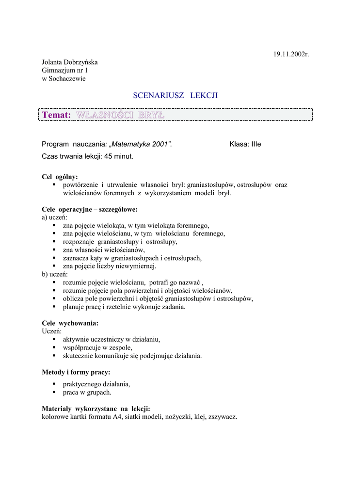 19.11.2002r. Jolanta Dobrzyńska Gimnazjum nr 1 w Sochaczewie SCENARIUSZ LEKCJI Temat: WŁASNOŚCI BRYŁ Program nauczania: „Matematyka 2001”. Klasa: IIIe Czas trwania lekcji: 45 minut. Cel ogólny: powtórzenie i utrwalenie własności brył: graniastosłupów, ostrosłupów oraz wielościanów foremnych z wykorzystaniem modeli brył. Cele operacyjne – szczegółowe: a) uczeń: zna pojęcie wielokąta, w tym wielokąta foremnego, zna pojęcie wielościanu, w tym wielościanu foremnego, rozpoznaje graniastosłupy i ostrosłupy, zna własności wielościanów, zaznacza kąty w graniastosłupach i ostrosłupach, zna pojęcie liczby niewymiernej. b) uczeń: rozumie pojęcie wielościanu, potrafi go nazwać , rozumie pojęcie pola powierzchni i objętości wielościanów, oblicza pole powierzchni i objętość graniastosłupów i ostrosłupów, planuje pracę i rzetelnie wykonuje zadania. Cele wychowania: Uczeń: aktywnie uczestniczy w działaniu, współpracuje w zespole, skutecznie komunikuje się podejmując działania. Metody i formy pracy: praktycznego działania, praca w grupach. Materiały wykorzystane na lekcji: kolorowe kartki formatu A4, siatki modeli, nożyczki, klej, zszywacz. PRZEBIEG LEKCJI 1. Zaangażowanie podział klasy na grupy, przypomnienie zasad pracy w grupie, przypomnienie podstawowych pojęć dotyczących własności brył przestrzennych, podanie tematu zajęć i zadań dla grup (załącznik) – każda grupa otrzymuje inne zadania. 2. Badanie analiza zadania, dyskusja w grupach. 3. Przekształcanie wyprowadzenie wzorów na pole powierzchni i objętość. 4. Prezentacja przedstawienie wyników pracy grupy, sformułowanie wniosków wynikających z zadania, omówienie trudności z jakimi uczniowie spotkali się przy opracowywaniu zadania. 5. Refleksja uczniowie dokonują samooceny dotyczącej ich udziału w pracy grupy i wypełniają karty samooceny, podsumowują zdobytą wiedzę i umiejętności. ZADANIE DLA GRUPY Grupa 1 Wytnij siatki brył (czworościan foremny, ośmiościan foremny, dwudziestościan foremny) i sklej modele. Nazwij otrzymane wielościany. Podaj ich własności. Zastanów się nad podobieństwami i różnicami. Wyprowadź wzory na pole powierzchni całkowitej. W jaki sposób obliczyć objętość? Grupa 2 Wytnij siatki brył (sześcian, dwunastościan foremny) i sklej modele. Nazwij otrzymane wielościany. Podaj ich własności. Zastanów się nad podobieństwami i różnicami. Podaj wzór na pole powierzchni całkowitej i objętość sześcianu. Grupa 3 Wytnij składanki i zbuduj 3 modele nie używając kleju ( ostrosłup kwadratowy – trzy takie ostrosłupy wypełniają sześcian). Kolorowe ściany są dodatkowymi zakładkami i mają się znaleźć wewnątrz składanej bryłki. Nazwij otrzymane wielościany. Podaj ich własności. Podaj wzór na objętość. Oblicz sumę objętości wszystkich brył. Zastanów się, czy można z nich zbudować sześcian? Czy możesz udowodnić wzór na objętość ostrosłupa? Z ilu jednakowych ostrosłupów można zbudować sześcian? Grupa 4 Kartkę A4 zagnij tak, aby nałożyć na siebie dwa przeciwległe rogi kartki. Zagnij dwa wystające trójkąty. W ten sposób otrzymasz romb. Złóż go na pół wzdłuż krótszej przekątnej. Z 12 rombów (złożonych wzdłuż krótszej przekątnej) o tej samej orientacji zbuduj sześcian. Kolejne kartki połącz za pomocą zszywacza. W jednym wierzchołku sześcianu łączą się 3 trójkąty. Otrzymasz bryłę, którą można nazwać „sześcian bez sześcianu” – dlaczego? Ile wynosi jej objętość? Jakimi bryłami należy ją uzupełnić, aby otrzymać sześcian? Ile wynosi objętość każdej z tych brył? Wskaż na modelu odcinki, których długość wynosi: a 3 , ⇒ 2 a 2 ⇒ , 2 gdzie a – długość krawędzi sześcianu. Czy możesz udowodnić wzór na objętość ostrosłupa? Z ilu jednakowych ostrosłupów można zbudować sześcian? Grupa 5 Kartkę A4 zagnij tak, aby nałożyć na siebie dwa przeciwległe rogi kartki. Zagnij dwa wystające trójkąty. W ten sposób otrzymasz romb. Złóż romb na pół wzdłuż dłuższej przekątnej. Z 6 rombów (złożonych wzdłuż dłuższej przekątnej) o tej samej orientacji zbuduj czworościan foremny. Kolejne kartki połącz za pomocą zszywacza. W jednym wierzchołku czworościanu łączą się 3 trójkąty. Otrzymasz bryłę, którą można nazwać „ czworościan bez czworościanu” – dlaczego? Ile wynosi jej objętość? Jakimi bryłami należy ją uzupełnić, aby otrzymać czworościan foremny? Ile wynosi objętość każdej z tych brył? W jakim stosunku została podzielona wysokość czworościanu? Gdybyśmy chcieli wpisać kulę w czworościan foremny – ile wynosił by promień kuli? Plansze z siatkami brył platońskich zamieszczone są w „Poradniku dla nauczyciela Matematyka 2001 klasa III gimnazjum” P7 – P11. Siatka ostrosłupa kwadratowego (trzy takie ostrosłupy wypełniają sześcian) znajduje się w „Składankach – bryłki bez kleju” Wacława Zawadowskiego (strona 15).
