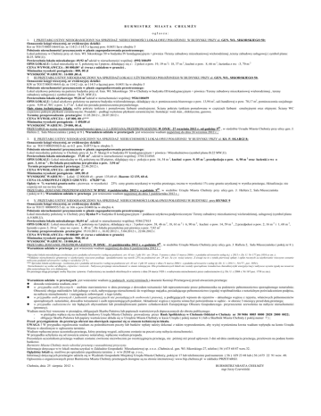 BURMISTRZ MIASTA CHEŁMŻY ogłasza: 1. I PRZETARG USTNY NIEOGRANICZONY NA SPRZEDAŻ NIERUCHOMOŚCI LOKALOWEJ POŁOŻONEJ W BUDYNKU PRZY ul. GEN. WŁ. SIKORSKIEGO 50; Oznaczenie księgi wieczystej, nr ewidencyjny działki: Kw nr TO1T/00031464/6 dz. nr 114/2 i 114/3 o łącznej pow. 0.0451 ha w obrębie 5 Położenie nieruchomości/ przeznaczenie w planie zagospodarowania przestrzennego: Lokal położony w Chełmży przy ul. Gen. Wł. Sikorskiego 50 w budynku IV kondygnacyjnym + piwnica /Tereny zabudowy mieszkaniowej wielorodzinnej ,tereny zabudowy usługowej ( symbol planu: B.25. MW,U). Powierzchnia lokalu mieszkalnego: 49,92 m2 udział w nieruchomości wspólnej: 4992/100459 OPIS LOKALU: Lokal mieszkalny nr 3, położony na I piętrze, składający się z : 2 pokoi o pow. 19, 19 m 2i 18, 37 m 2, kuchni o pow. 8, 66 m 2, łazienka z wc -3, 70 m 2 CENA WYWOŁAWCZA : 80 000,00* zł (wraz z udziałem w gruncie) . Minimalna wysokość postąpienia : 800, 00 zł WYSOKOŚĆ WADIUM : 16 000 ,00 zł. 2. III PRZETARG USTNY NIEOGRANICZONY NA SPRZEDAŻ LOKALU UŻYTKOWEGO POŁOŻONEGO W BUDYNKU PRZY ul. GEN. WŁ. SIKORSKIEGO 50. Oznaczenie księgi wieczystej, nr ewidencyjny działki: KW nr TO1T/00031464/6 dz. nr 114/2 i dz. nr 114/3 o łącznej pow. 0.0451 ha w obrębie 5 Położenie nieruchomości/ przeznaczenie w planie zagospodarowania przestrzennego: Lokal użytkowy położony na parterze budynku przy ul. Gen. Wł. Sikorskiego 50 w Chełmży w budynku III kondygnacyjnym + piwnica /Tereny zabudowy mieszkaniowej wielorodzinnej , tereny zabudowy usługowej ( symbol planu: B.25. MW,U). Powierzchnia lokalu użytkowego: 95,26 m2 udział w nieruchomości wspólnej: 9526/100459 OPIS LOKALU: Lokal użytkowy położony na parterze budynku wielorodzinnego, składający się z: pomieszczenia biurowego o pow. 13,94 m2, sali handlowej o pow. 70,17 m2, pomieszczenia socjalnego o pow. 9,98 m2,WC o pow. 1,17 m2. Lokal nie posiada pomieszczenia przynależnego. Opis stanu technicznego lokalu: sufity pokryte tynkiem i pomalowane farbami emulsyjnymi. Ściany pokryte tynkiem pomalowane w częściach farbami emulsyjnymi oraz olejnymi. Ściany WC częściowo pokryte płytkami ceramicznymi. Posadzki – podłogi wyłożone płytkami ceramicznymi. Instalacje: wod.-kan., elektryczna, gazowa. Terminy przeprowadzenia przetargów: 11.05.2012 r., 20.07.2012 r. CENA WYWOŁAWCZA : 145 000, 00 zł*** Minimalna wysokość postąpienia : 1 450,00 zł WYSOKOŚĆ WADIUM : 29 000, 00 zł. PRZETARGI na wyżej wymienione nieruchomości (poz.1 i 2 ) ZOSTANĄ PRZEPROWADZONE W DNIU 27 września 2012 r. od godziny 900 , w siedzibie Urzędu Miasta Chełmży przy ulicy gen. J. Hallera 2, Sala Mieszczańska ( pokój nr 8 ). Warunkiem udziału w przetargach jest wniesienie wadium najpóźniej do dnia 24 września 2012 r. ; 3. II PRZETARG USTNY NIEOGRANICZONY NA SPRZEDAŻ NIERUCHOMOŚCI LOKALOWEJ POŁOŻONEJ W BUDYNKU PRZY ul. KS. P. SKARGI 8; Oznaczenie księgi wieczystej, nr ewidencyjny działki: Kw nr TO1T/00029302/6 dz. nr 6/2 pow. 0.0573 ha w obrębie 3. Położenie nieruchomości/ przeznaczenie w planie zagospodarowania przestrzennego: Lokal mieszkalny położony w Chełmży przy ul. ks. P. Skargi 8 w budynku IV kondygnacyjnym + piwnica / Mieszkalnictwo (symbol planu B.22 MW,U). Powierzchnia lokalu mieszkalnego: 37,01 m2 , udział w nieruchomości wspólnej: 3701/214565. OPIS LOKALU: Lokal mieszkalny nr 44, położony na III piętrze, składający się z : pokoju o pow. 16, 54 m 2, kuchni o pow. 9, 85 m 2, przedpokoju o pow. 6, 98 m 2 oraz łazienki z wc o pow. 3, 64 m 2 ; Do lokalu przynależna jest piwnica o pow. 3,94 m2 Termin przeprowadzenia I przetargu: 22.06.2012 r. CENA WYWOŁAWCZA : 60 000,00* zł Minimalna wysokość postąpienia : 600, 00 zł WYSOKOŚĆ WADIUM : - Lokal: 12 000,00 zł; - grunt: 135,60 zł ; Razem: 12 135, 60 zł. CENA UŁAMKOWEJ CZĘŚCI GRUNTU: 678,00**zł. Opłaty w % wartości gruntu netto : pierwsza w wysokości 25% ceny gruntu uzyskanej w wyniku przetargu; roczna w wysokości 1% ceny gruntu uzyskanej w wyniku przetargu; Aktualizacja: nie częściej niż raz na trzy lata. PRZETARG ZOSTANIE PRZEPROWADZONY W DNIU 4 października 2012 r. o godzinie 900 , w siedzibie Urzędu Miasta Chełmży przy ulicy gen. J. Hallera 2, Sala Mieszczańska ( pokój nr 8 ). Warunkiem udziału w przetargu jest wniesienie wadium najpóźniej do dnia 1 października 2012 r. ; 4. V PRZETARG USTNY NIEOGRANICZONY NA SPRZEDAŻ NIERUCHOMOŚCI LOKALOWEJ POŁOŻONEJ W BUDYNKU przy RYNKU 9 Oznaczenie księgi wieczystej, nr ewidencyjny działki: Kw nr TO1T/ 00080955/3 dz. nr 166 o pow.0.0408 ha w obrębie 4. Położenie nieruchomości/ przeznaczenie w planie zagospodarowania przestrzennego: Lokal mieszkalny położony w Chełmży przy Rynku 9 w budynku II kondygnacyjnym + poddasze użytkowe,podpiwniczonym/ Tereny zabudowy mieszkaniowej wielorodzinnej, usługowej (symbol planu A.9.MW,U). Powierzchnia lokalu mieszkalnego: 86,04 m2 , udział w nieruchomości wspólnej: 9386/27815 OPIS LOKALU: Lokal mieszkalny nr 2, położony na I piętrze, składający się z : 3 pokoi o pow. 38, 46 m 2, 18, 61 m 2 i 6, 90 m 2, kuchni o pow. 14, 59 m 2 , 2 przedpokoi o pow. 2, 16 m 2 i 1, 68 m 2, łazienki o pow.2, 24 m 2 oraz wc o pow. 1, 40 m 2; Do lokalu przynależna jest piwnica o pow. 7,82 m2 Terminy przeprowadzenia przetargów: 19.10.2011 r., 16.02.2012 r., 5.04.2012 r., 22.06.2012 r. CENA WYWOŁAWCZA : 90 000,00* zł (wraz z udziałem w gruncie) Minimalna wysokość postąpienia : 900, 00 zł WYSOKOŚĆ WADIUM : 18 000,00 zł. PRZETARG ZOSTANIE PRZEPROWADZONY W DNIU 11 października 2012 r. o godzinie 900 , w siedzibie Urzędu Miasta Chełmży przy ulicy gen. J. Hallera 2, Sala Mieszczańska ( pokój nr 8 ). Warunkiem udziału w przetargu jest wniesienie wadium najpóźniej do dnia 8 października 2012 r. ; *Sprzedaż lokalu mieszkalnego zwolniona jest z podatku od towarów i usług na podstawi, art. 43 ust. 1 pkt 10 i art. 29 ust. 5 ustawy z dnia 11 ma